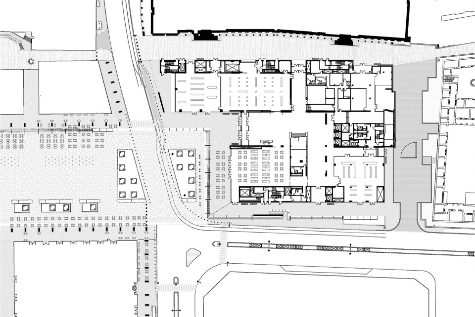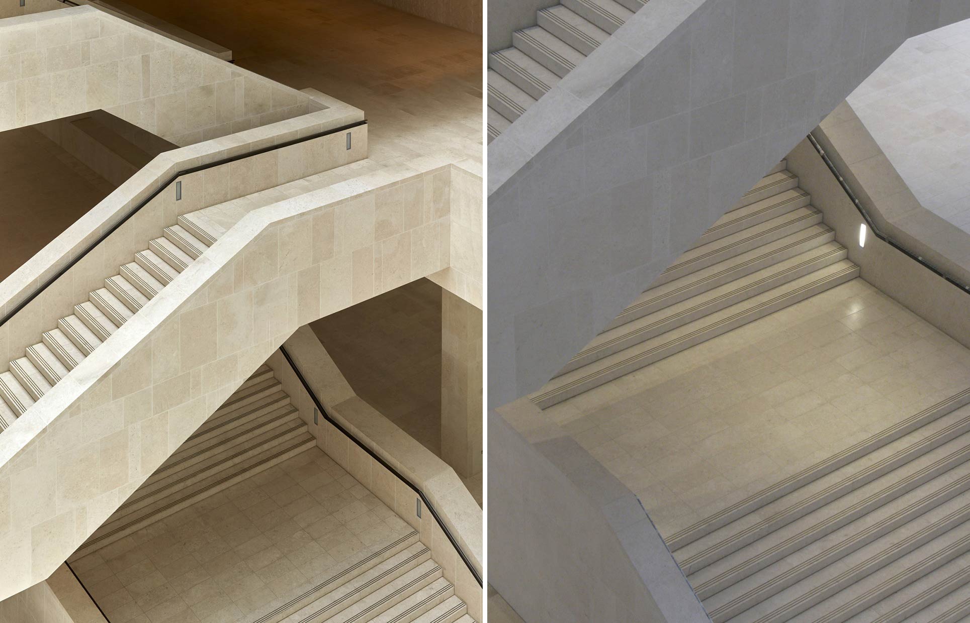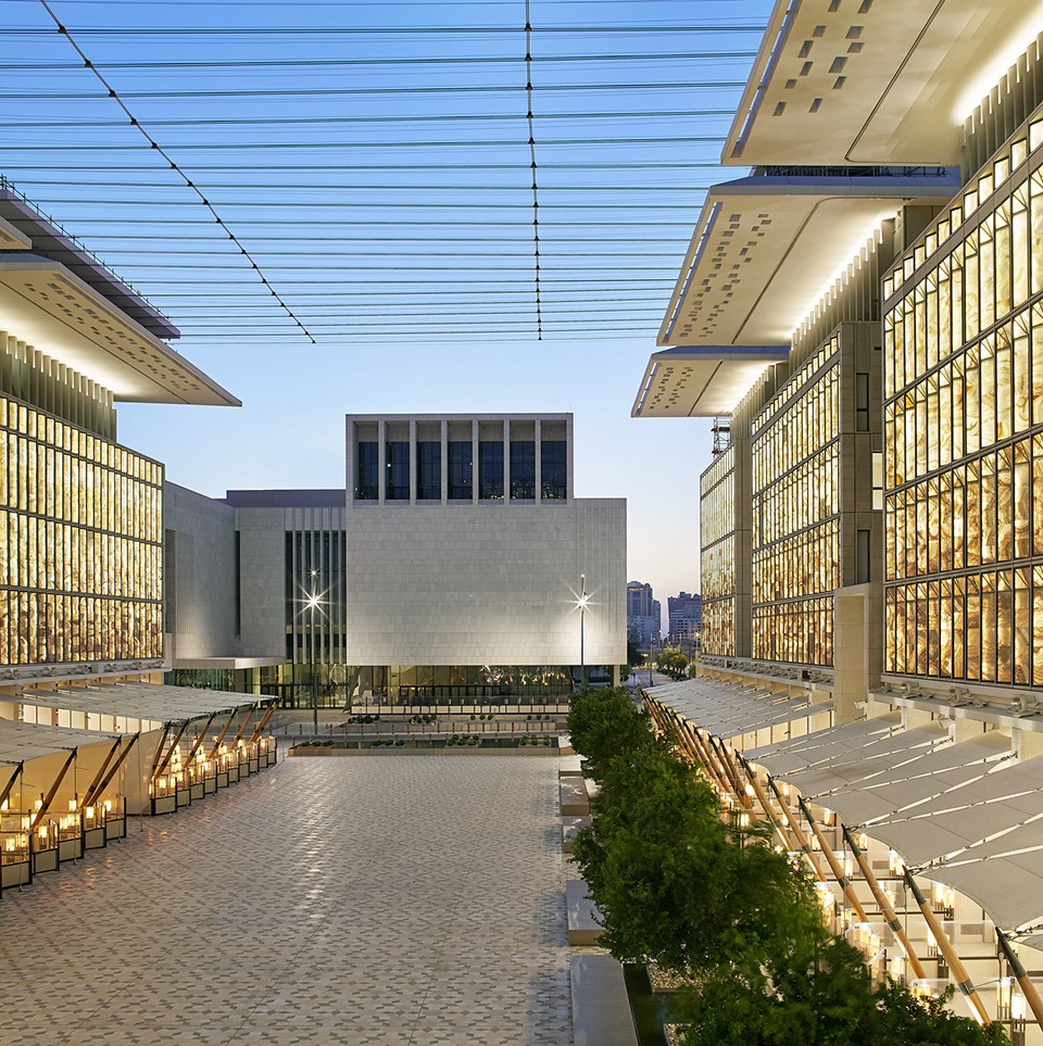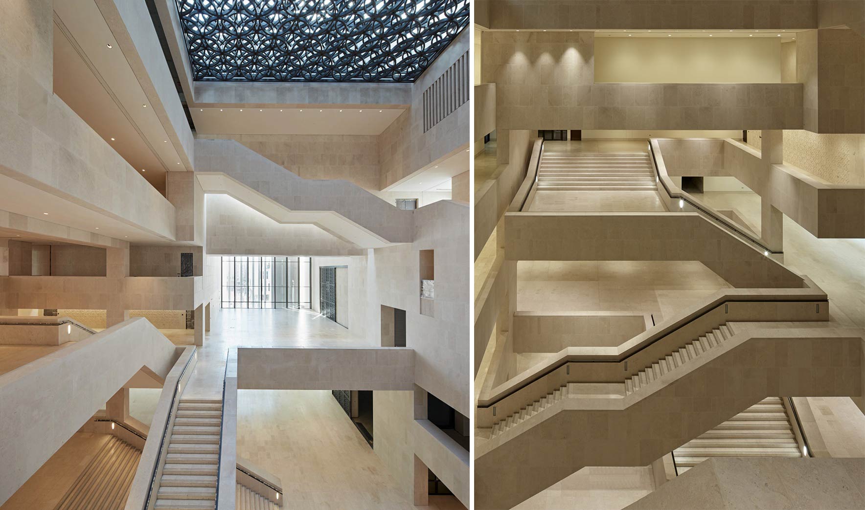 建筑内引入公共空间,这是一个富有层次的活动场所,也是赞颂设计、时尚、音乐、电影和当代艺术的空间。公共空间中心是宽敞的中庭,四周环绕宏伟的楼梯,上方是天窗,伊斯兰图案的格栅将阳光引入室内。John McAslan说:“这种光线斑驳的环境让人联想到邻近历史悠久的露天广场,这里提供了充满活力的艺术集市,伊斯兰建筑和现代建筑在此交融。”