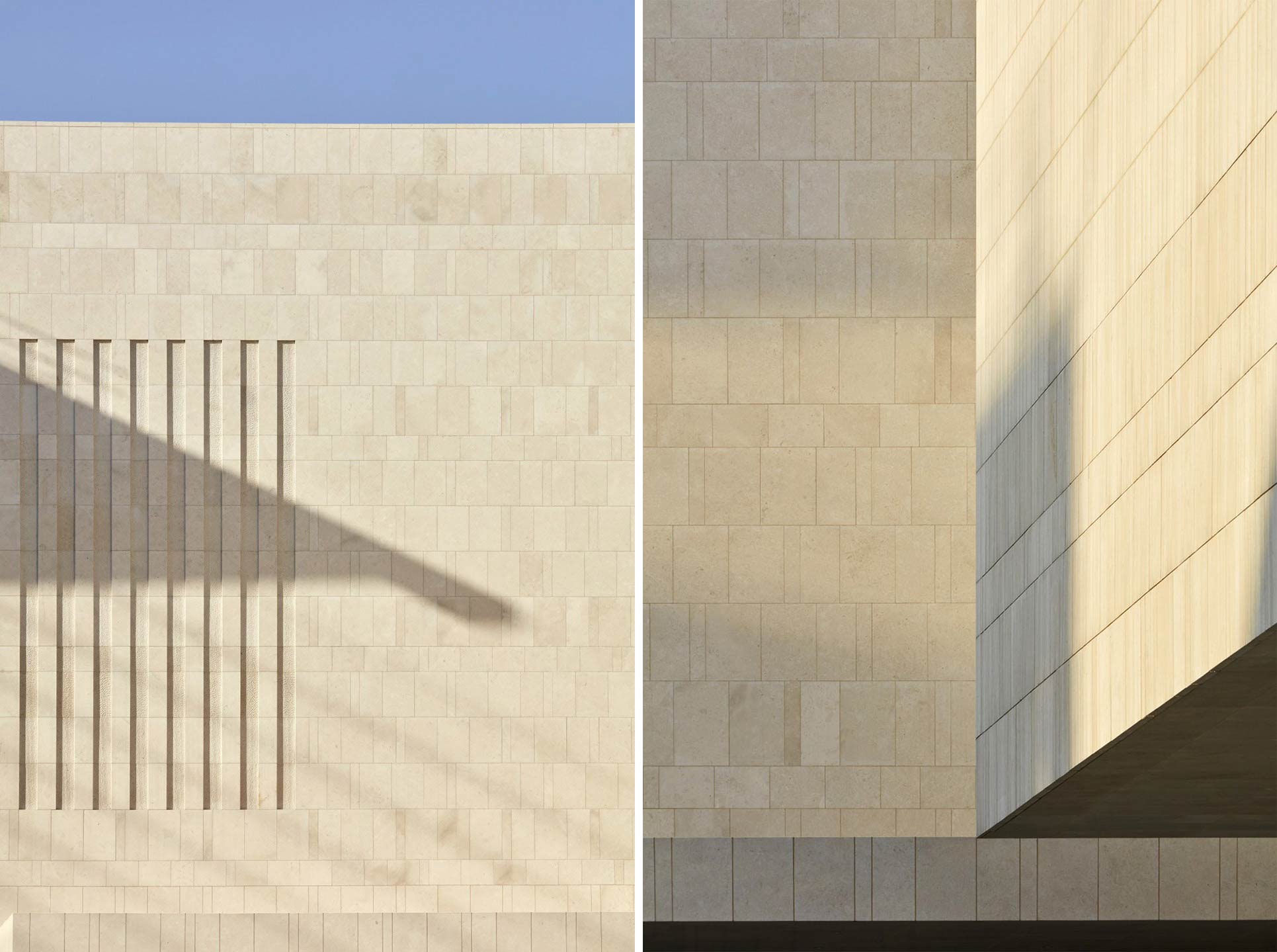 M7中心位于Msheireb区域中央,其坚固、厚重、交错的体量与传统卡塔尔建筑元素相呼应,宁静而质朴。该设计与阿联酋及海湾国家普遍的国际化城市改造相对,展示了卡塔尔探索自身遗产和接触多元文化的愿景。John McAslan表示:“从本质上来说,我们一直在努力设计出传递共同探索感的建筑。我们以传统的卡塔尔合院为灵感,将建筑体量和内部氛围设想成一块巨石,其空间和庭院都由这块巨石来塑造。”