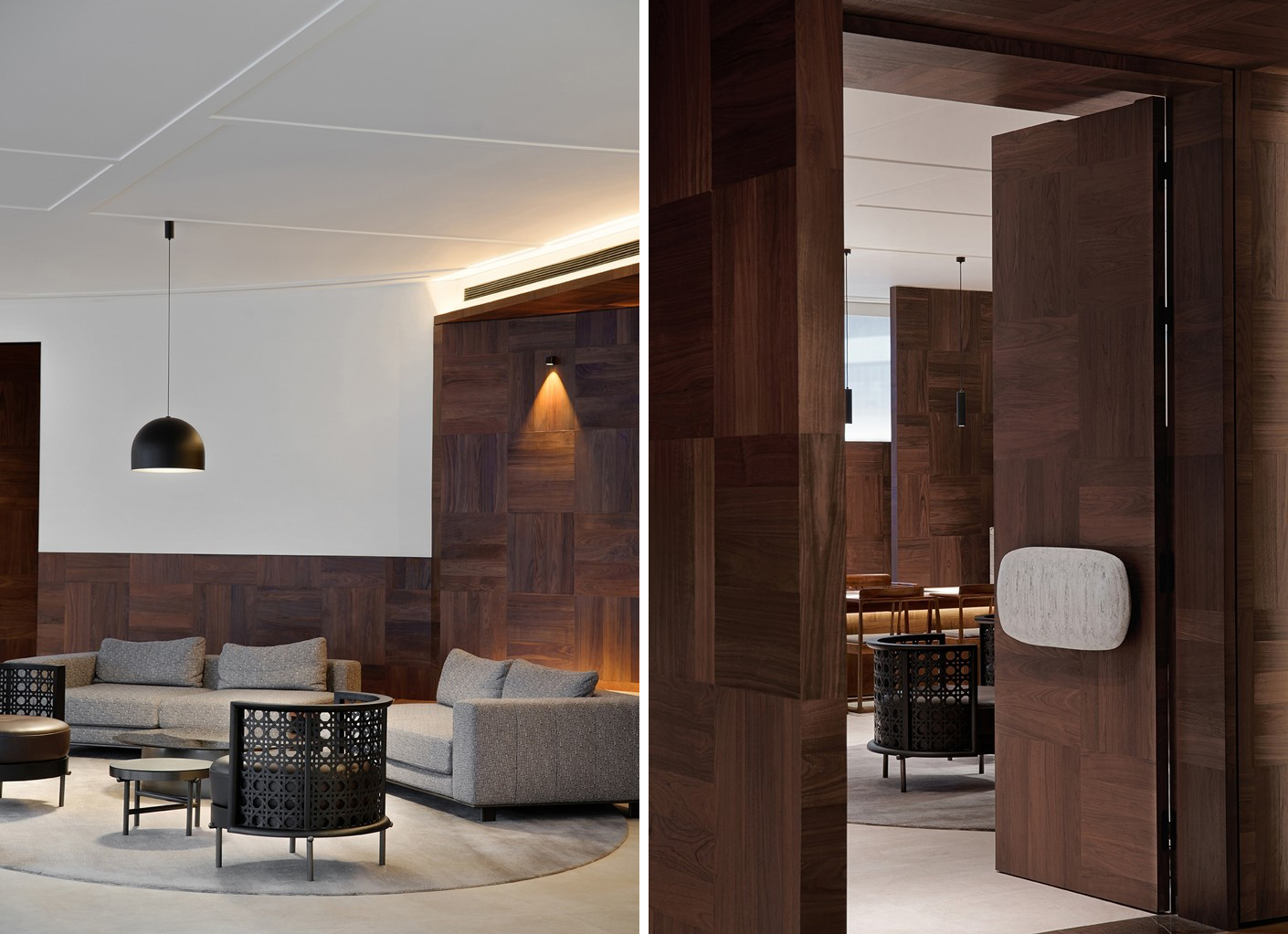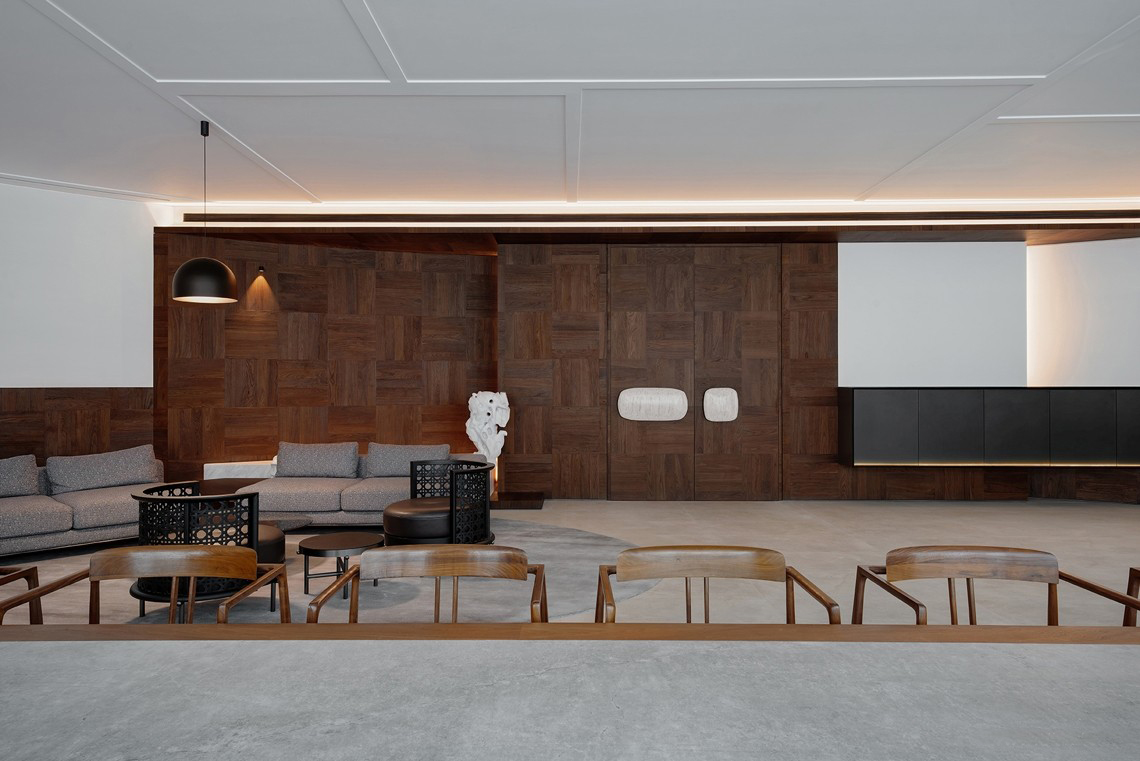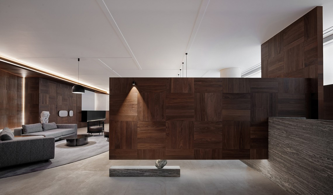 大面积的黑胡桃木护墙板,以几何拼花的形式呈现雅致却又朴实的风骨。