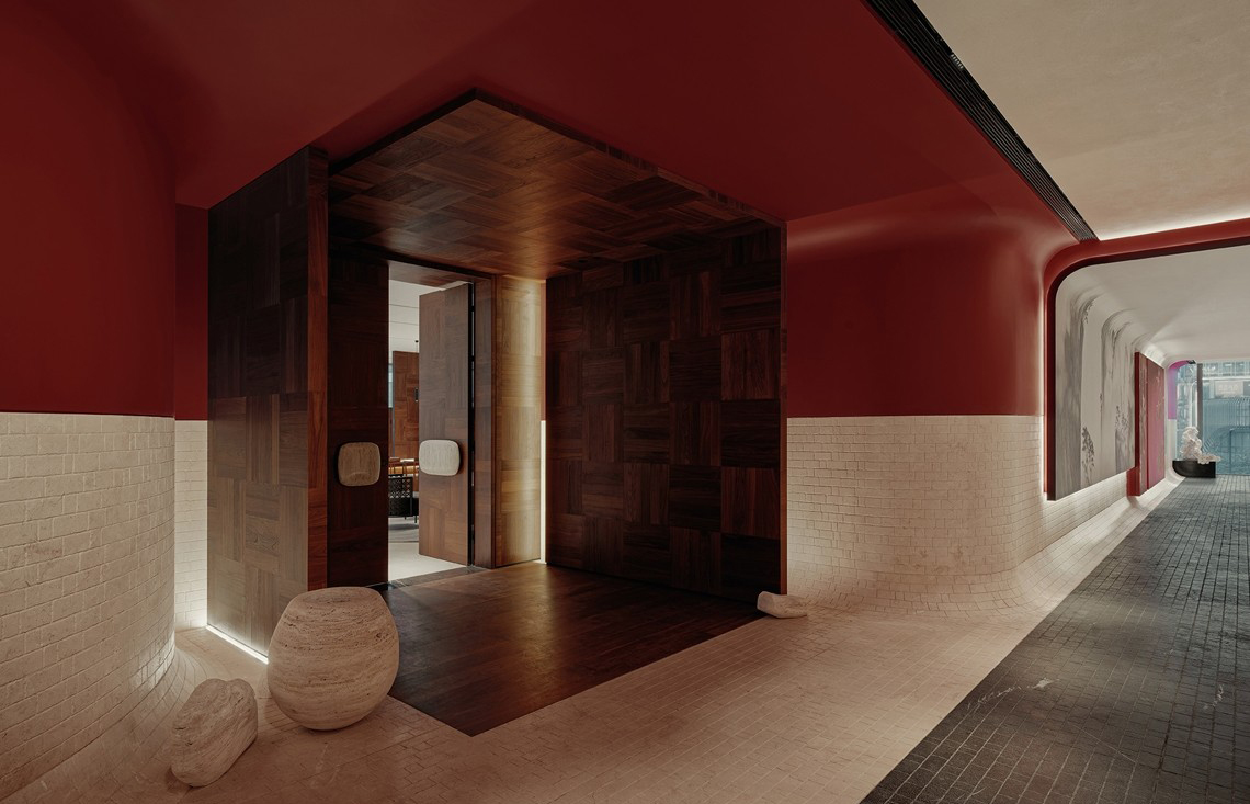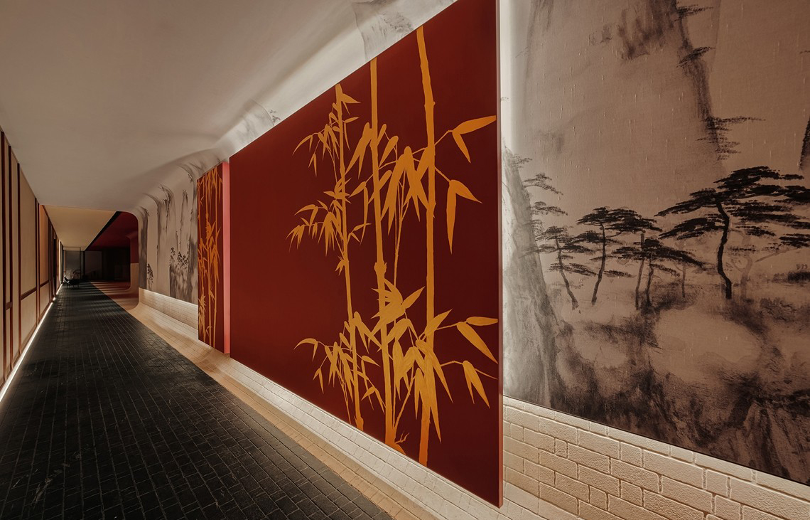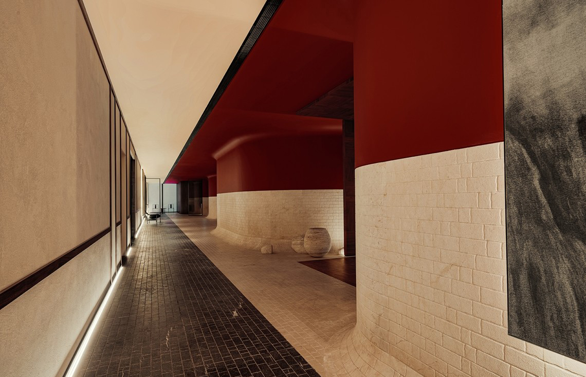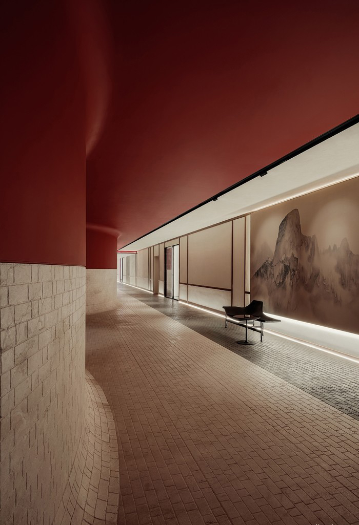 入室连廊是联系各个空间的“画廊” 设计师对“画廊”空间吊顶、墙地面的材质进行严谨且感性的切割、让各个装饰面内发生有序且强烈对立,增加空间的横向层次,和纵向的冲击,洗墙灯带“润染”凹凸机理的墙体,似画卷。人们走入连廊便走入画中。