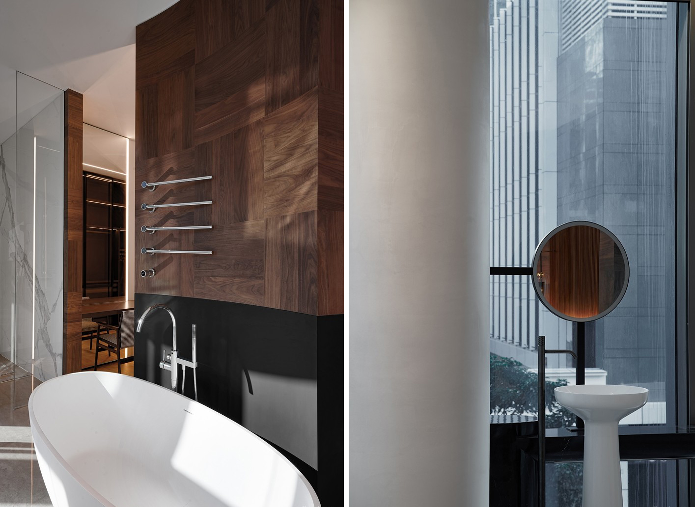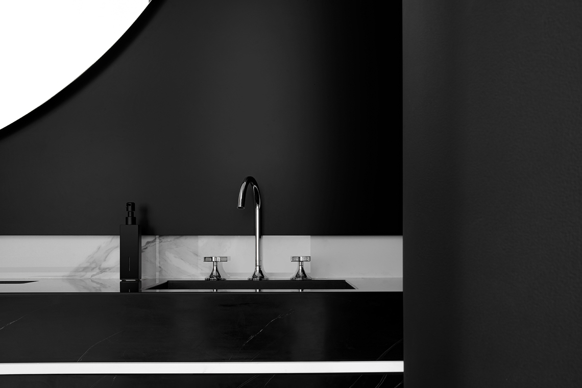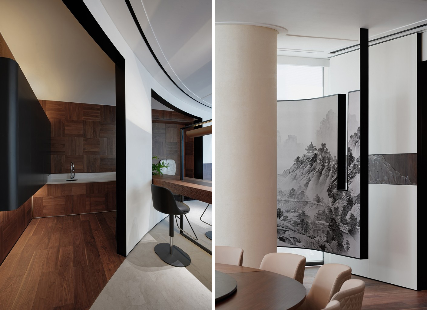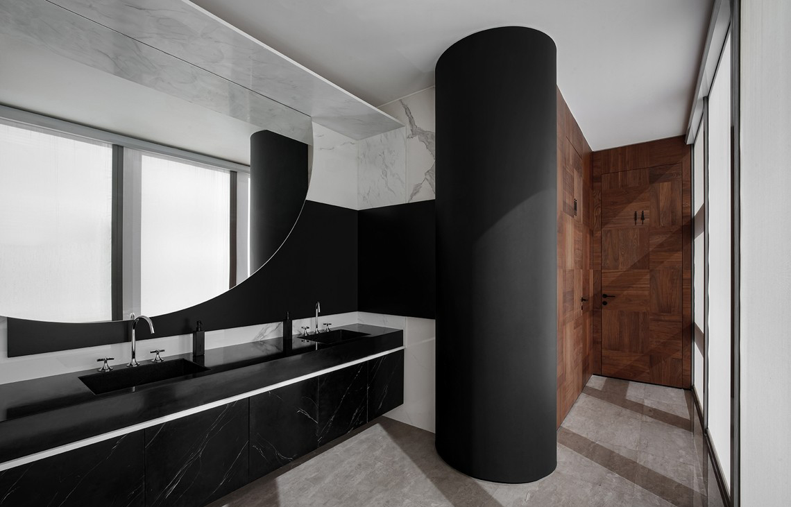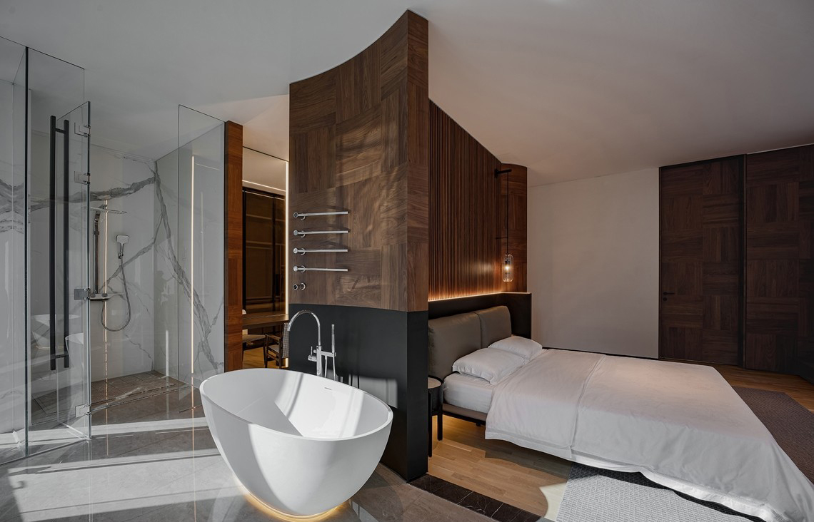 入门胡桃木的方正体块,在幽静圆润的过道中得以凸显庄重的仪式感,给予客人尊崇的礼遇。“方中带圆”便是主人秉承的待客之道,通过门把手的洞石材质温润质朴得以彰显,深棕色的胡桃木饰面质朴硬朗。