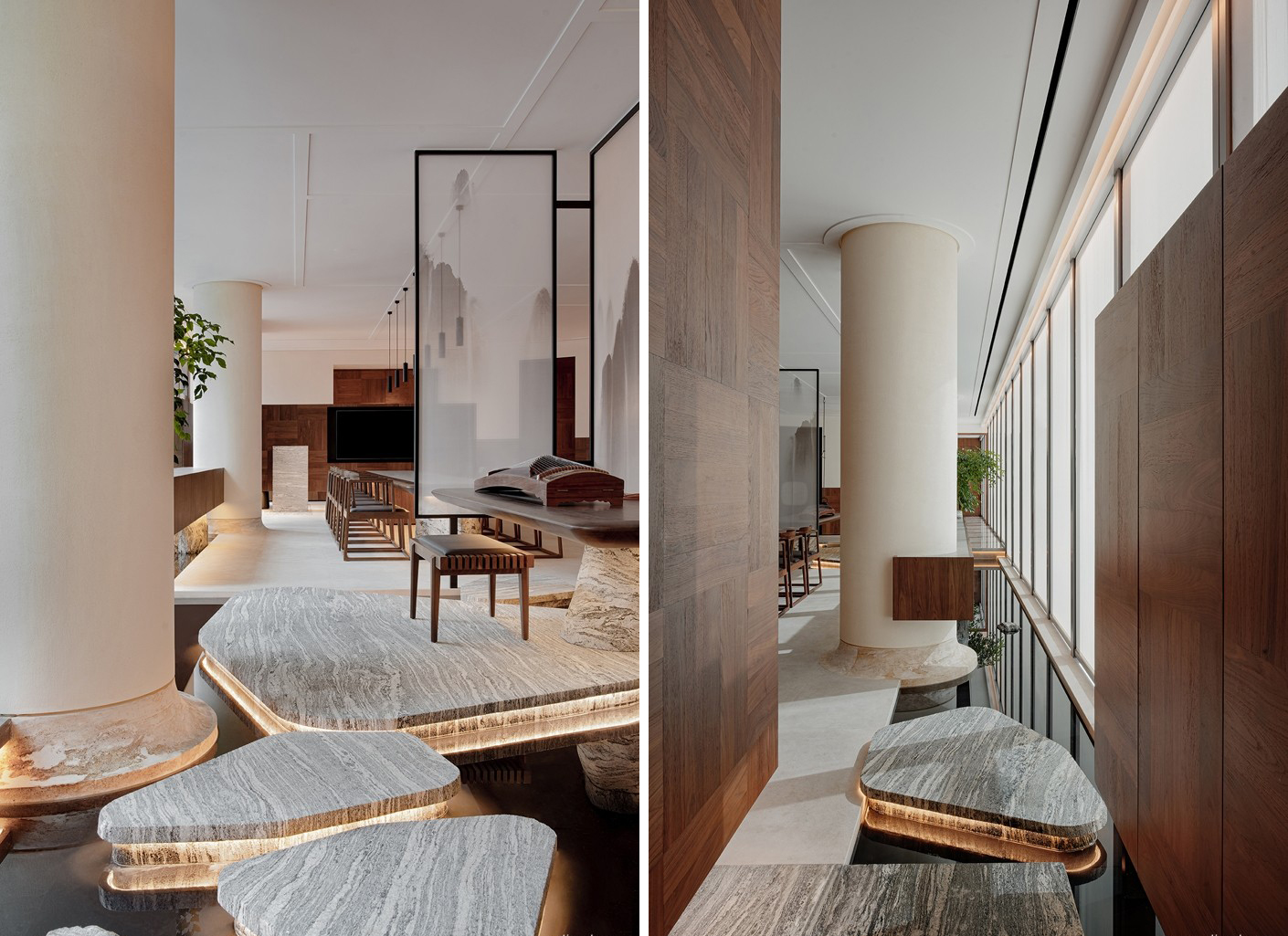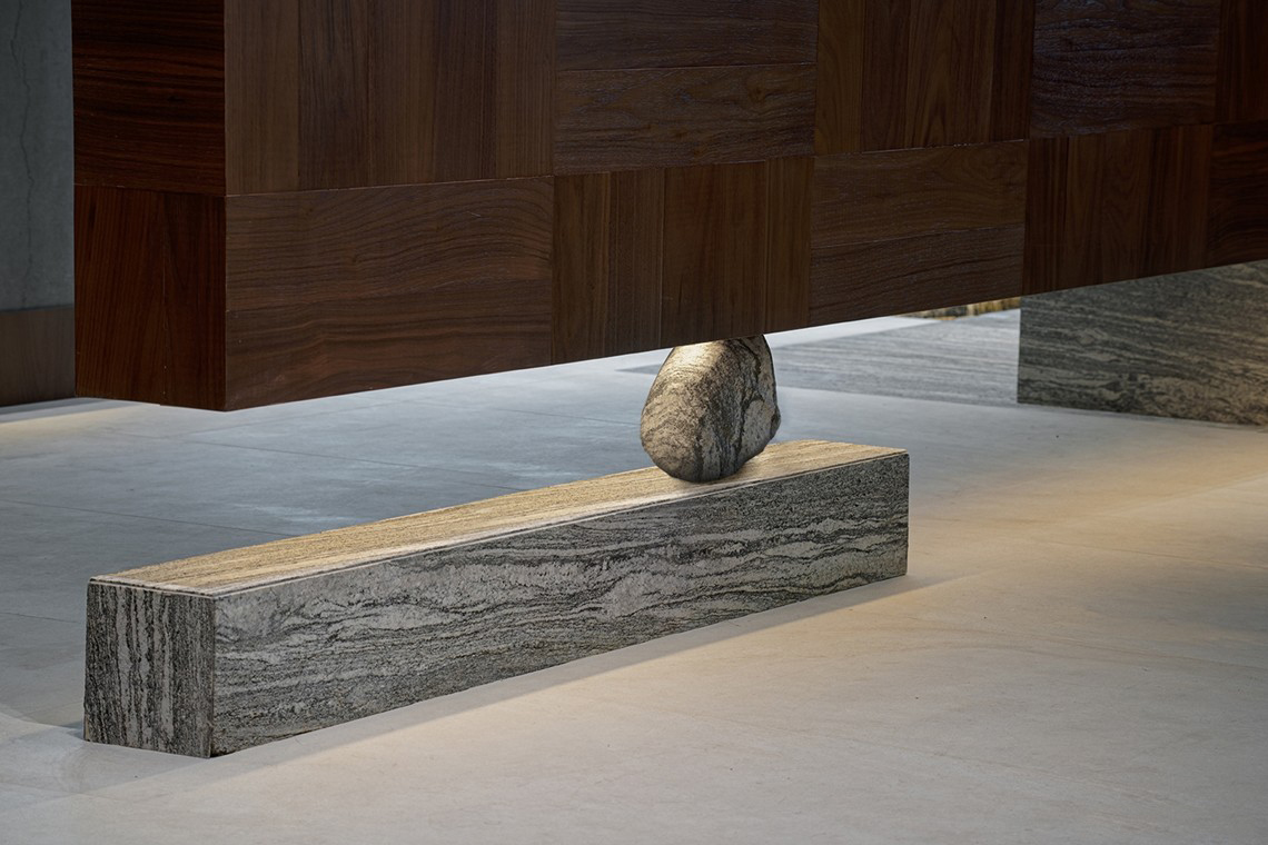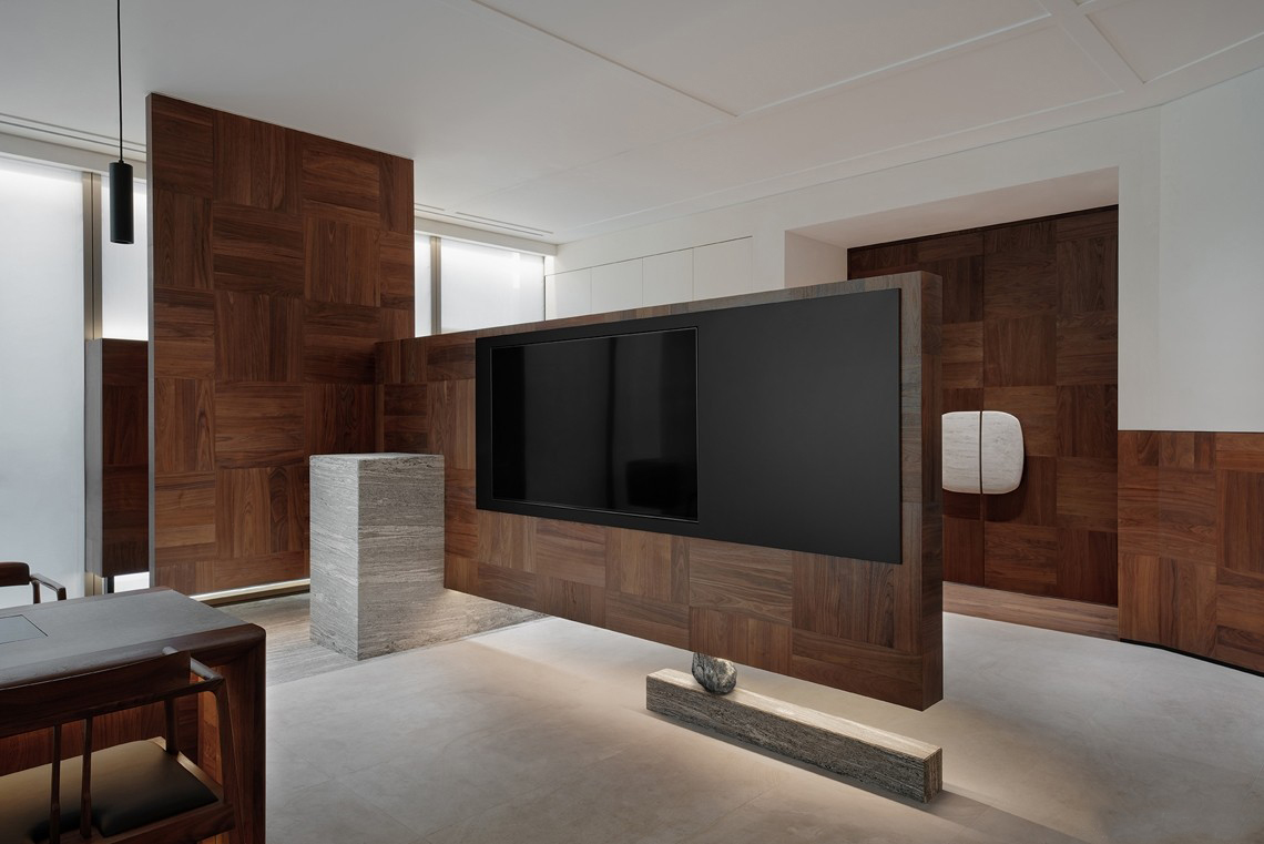 长形的茶台,以山石支撑,使厚重的实木台面仿佛轻盈漂浮,以最克制的手法呈现茗茶的愉悦。