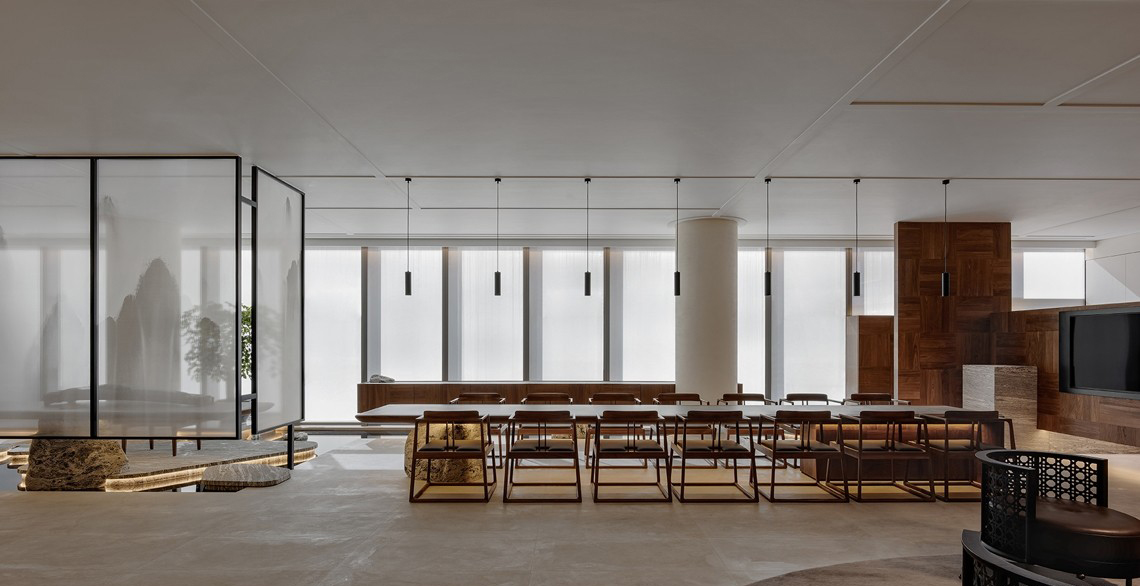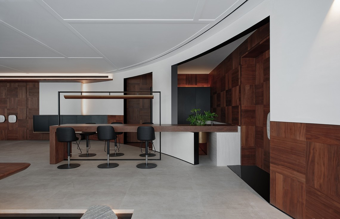 该项目坐落在中国(广西)自由贸易试验区南宁片区,总部基地。项目室内面积860平米,场所内功能包括会客厅及两个中餐厅、影院及住宅样板区,入口处选用中国传统朱湛色及多种石材碰撞,对比隐喻出盛唐都城之下红墙,远山,竹石水墨,淳厚温润的意境。