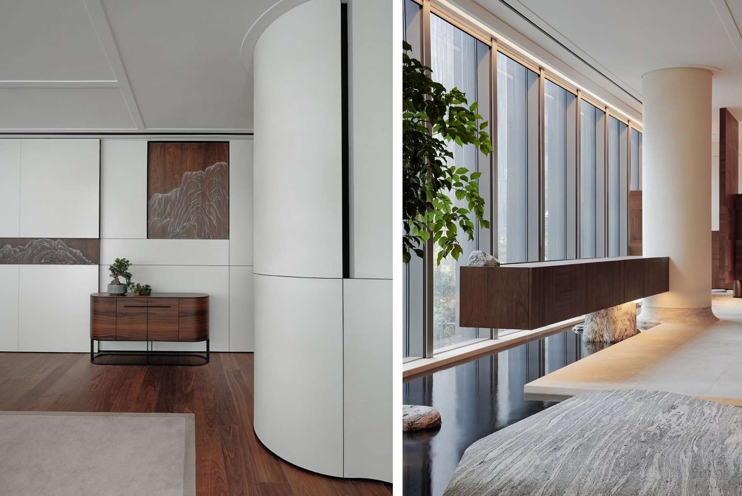 空间主材:黑胡桃木、洞石、浪淘沙花岗岩、艺术涂料