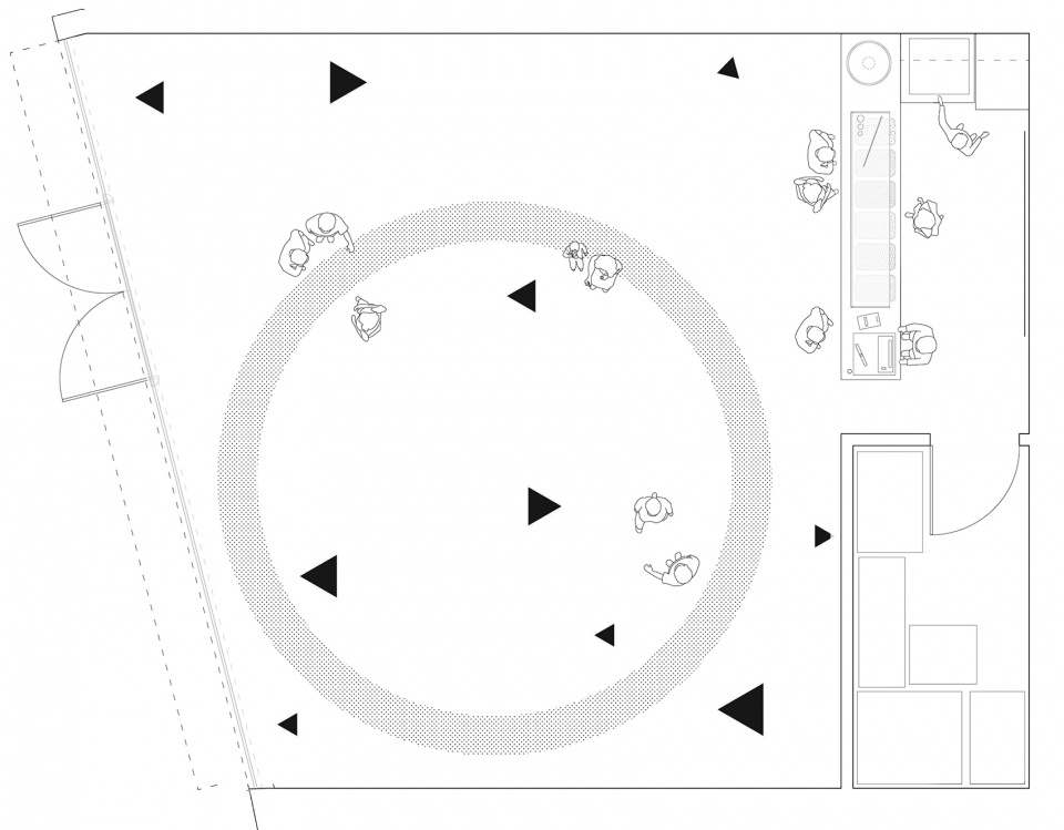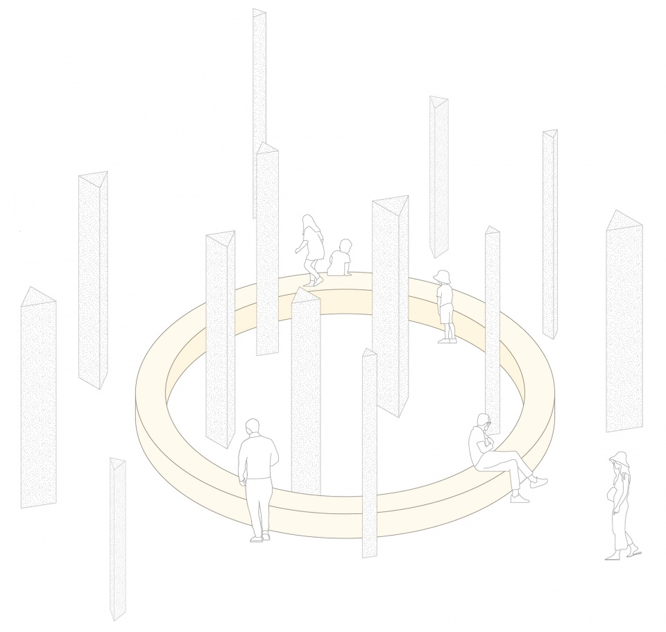 ①在120平方米的空间中,直径八米的环形木椅环绕着五颜六色的三角柱群。
