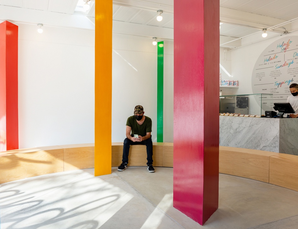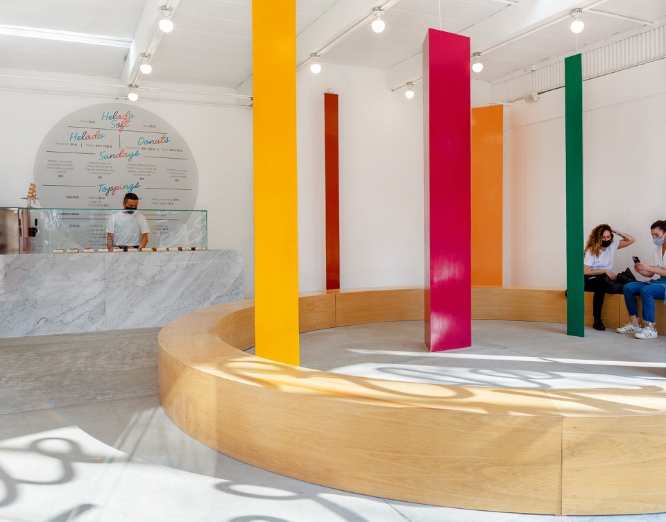 建筑师本杰明·卡德纳(Benjamin Cadena)利用使人联想到70年代极简主义艺术的色彩和抽象形式,为波哥大这家冰淇淋和甜甜圈商店打造了大胆而有趣的空间。