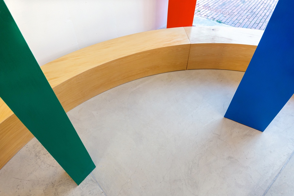 该设计以最少的手法创造出令人难忘的环境,空间中固定着五颜六色的三角柱群和直径八米的环形木椅,随着人的移动而变化。这家小店被设想成聚会和用餐场所,大部分区域都位于临街公共空间,可以用来会见朋友或休息片刻。简单的元素经过精心布置,营造出独特的氛围,它没有回到最初的设计框架,而是为这个新兴品牌提供了新的空间形象。
