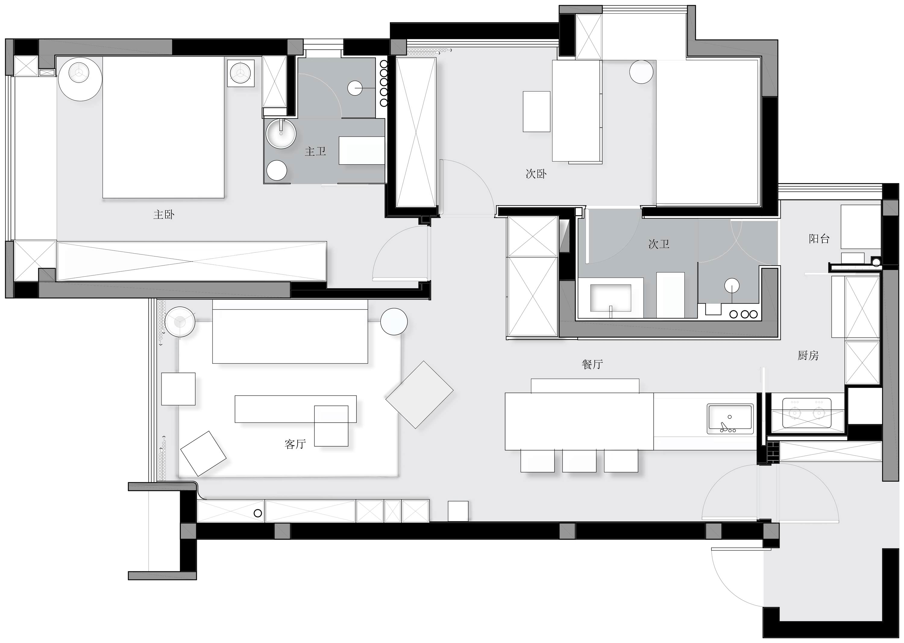 自宅的特殊性,要求设计师在考虑空间功能性的同时,聚焦于生活的私密性。次卧的卫生间还巧妙地设计了两个入口,其中一门与小阳台连接,在有客人到访时,次卧直通的卫生间门便可关闭,小阳台的门开启,将次卫临时转换为方便使用的公卫。开放和私密,便在两扇门的转换中轻易完成对接。