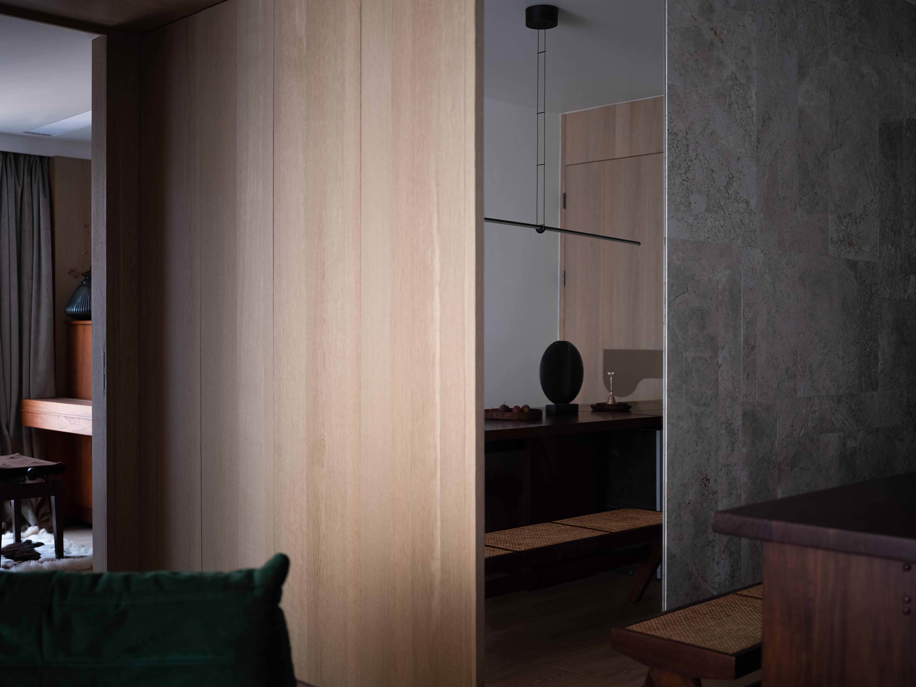 功能与审美兼具,构筑这个空间的一体两面,是设计师对自己的要求。不同于将各个空间划分为固定的功能这种常规手法,Josh打破了传统的空间布局,以灵活巧妙的方式,模糊了区域的划分界限。空间的格局与情绪被释放,随着每一处生活场景的变化而自然匹配。随处可见的趣味性视角,不仅大大增加了空间的层次性,在完成视觉上的自然过渡与连续性的同时,丰富了人与空间、及人与人之间的互动关系。