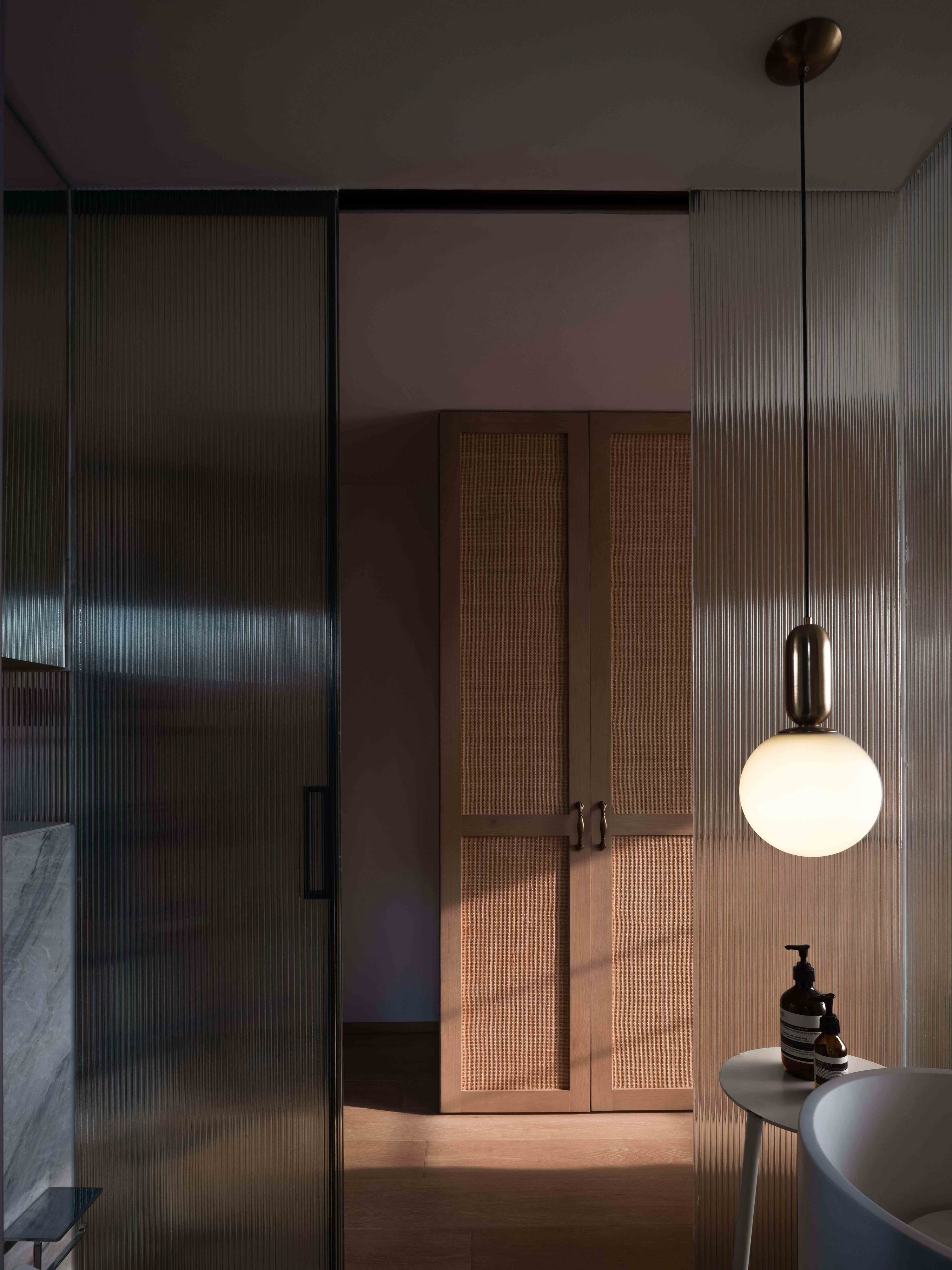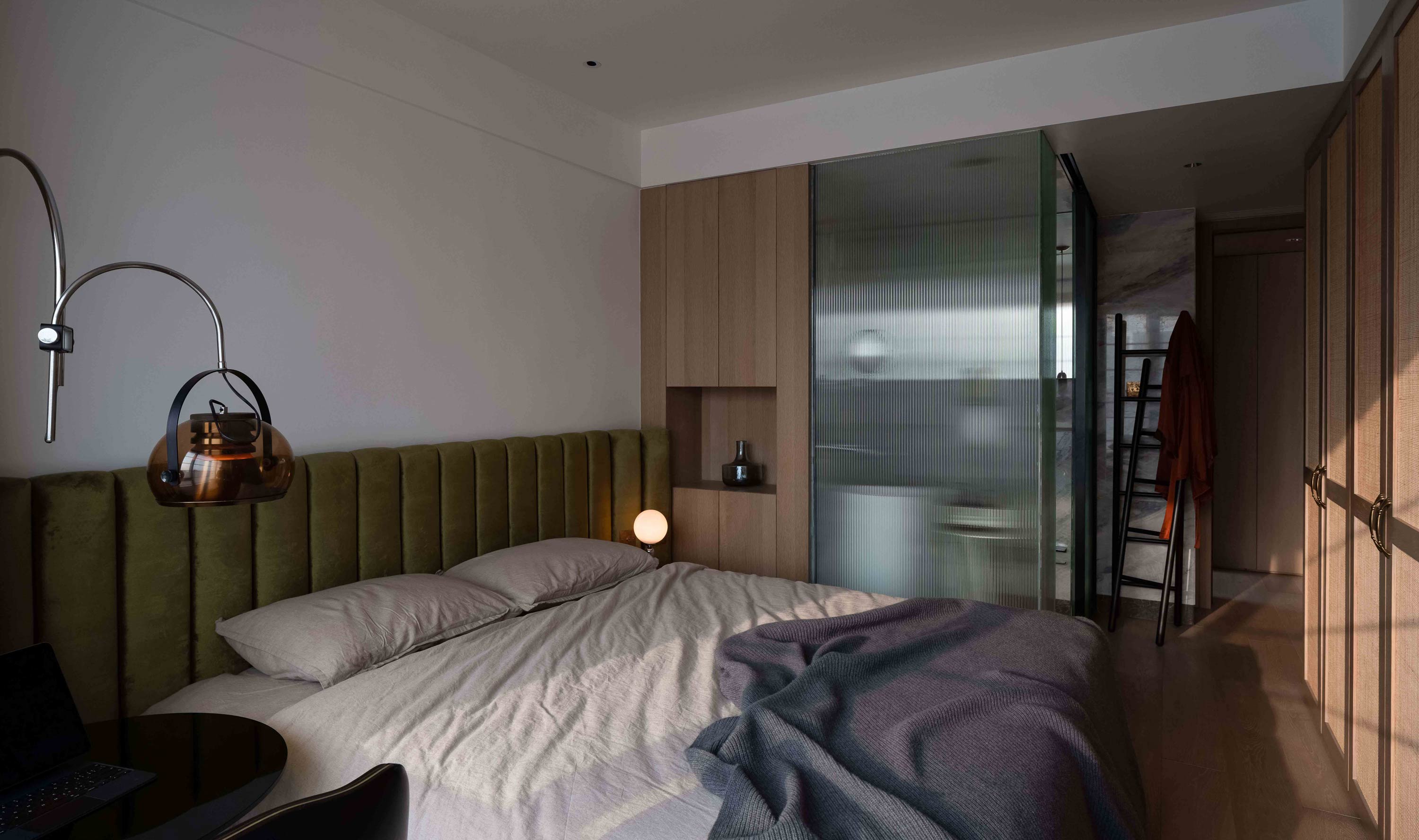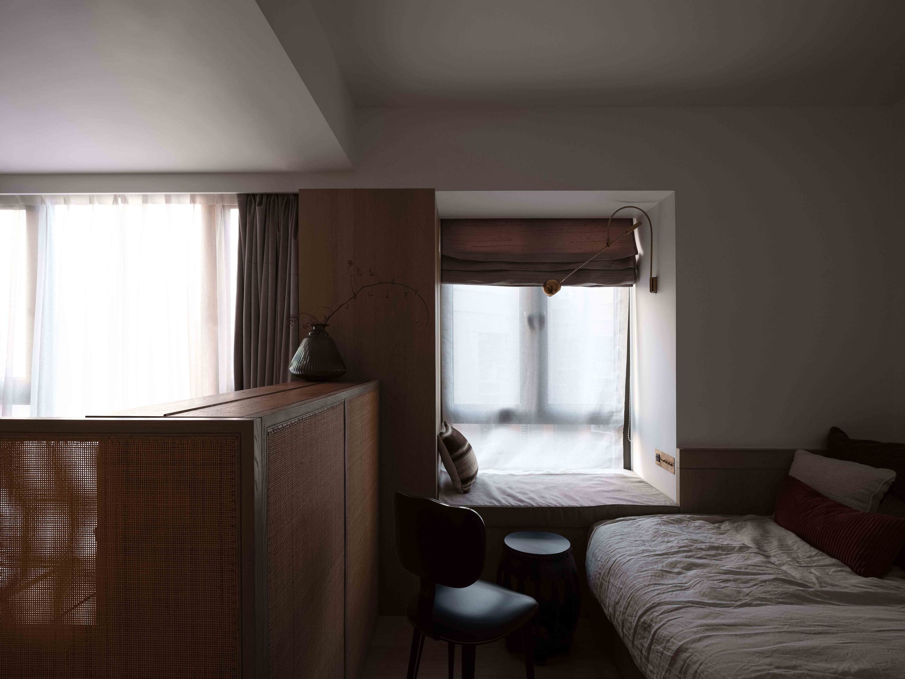 卧室设计,回归最本质的功能需求,延续纯朴简约的主色调,以身体的舒适度作为设计的衡量尺度,辅之以柔软而放松的家具,打造一种细腻而亲密的体验感。主卧整排的衣柜极大满足了储物需求,木框和藤编的组合亦带来些许度假般休闲的气息;主卫用长虹玻璃围合成了半虚半实的空间,光影氤氲,人影绰绰,弱化了区域间的边界,却又保留了区域的独立性和私密性。