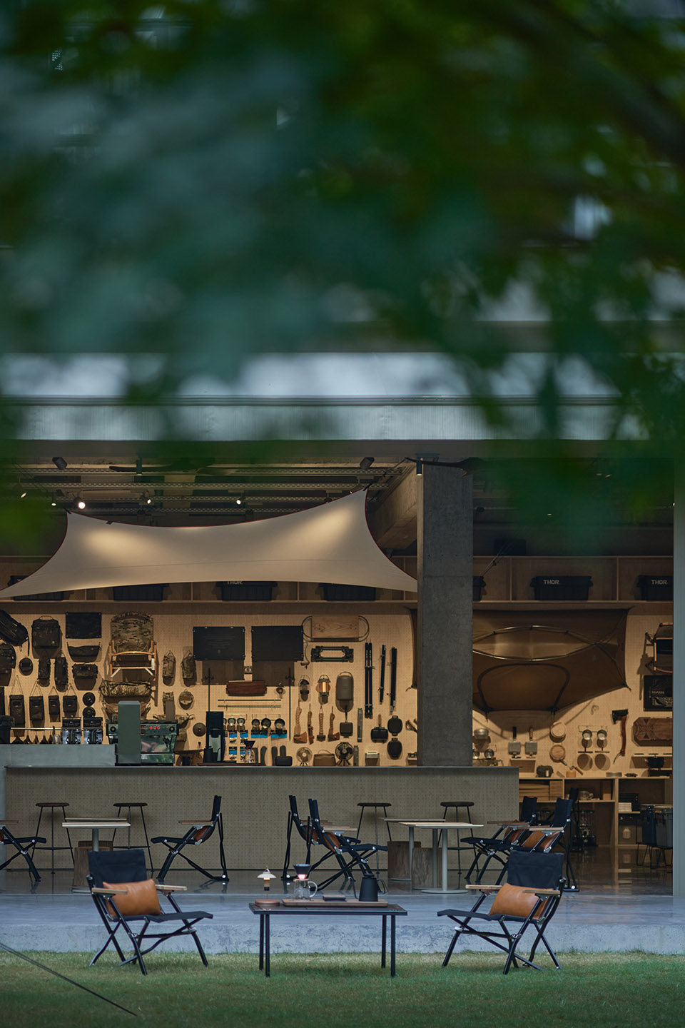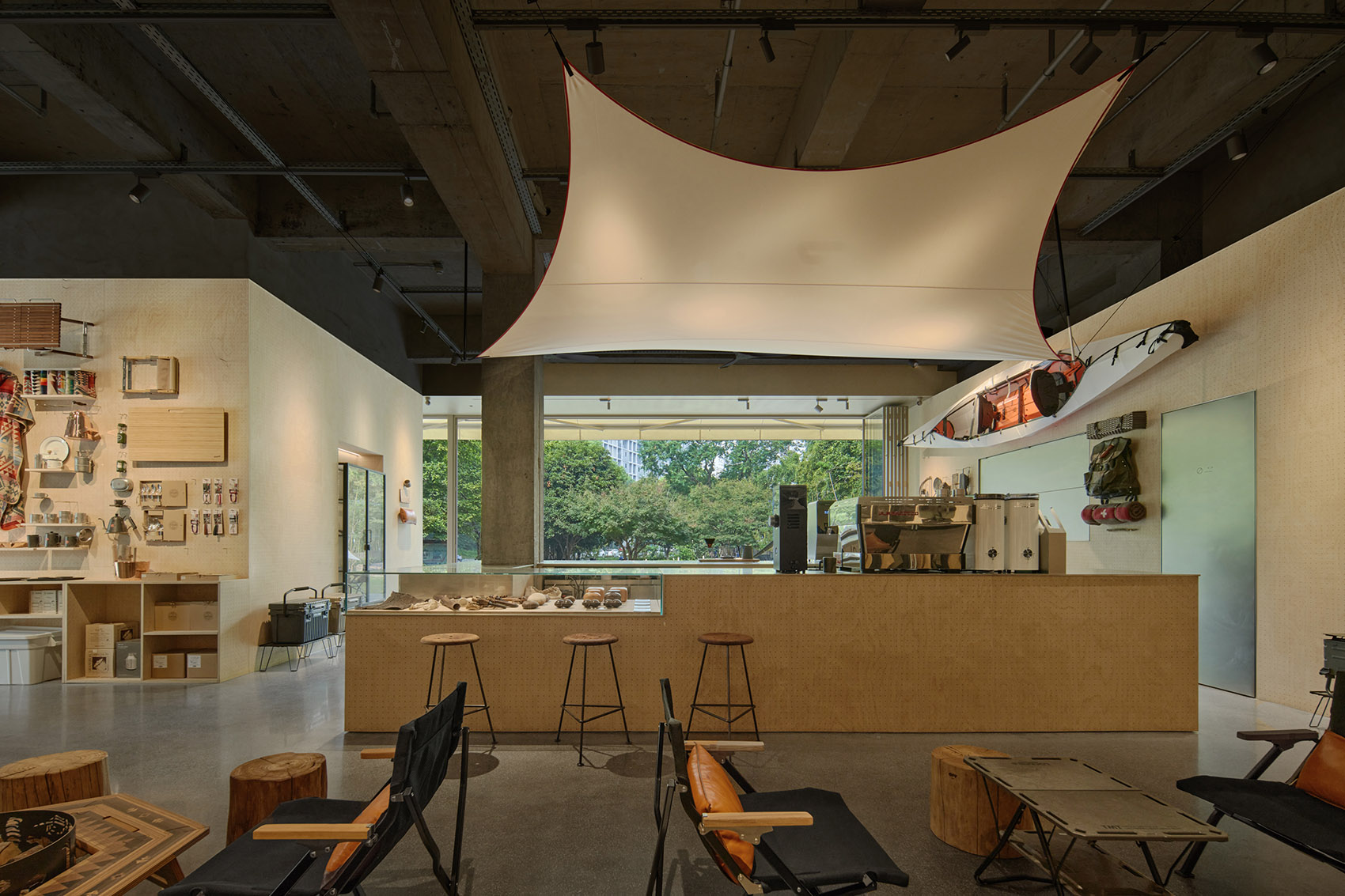功能上将店铺划分为商品售卖区与咖啡体验区,两片区域的中心安置有一个环岛吧台。在成为空间中心的同时,也可以最大程度为两个区域提供咨询与服务。环岛吧台的顶部以天幕做装饰,既呼应露营主题,也透出隐隐的环境光烘托氛围。