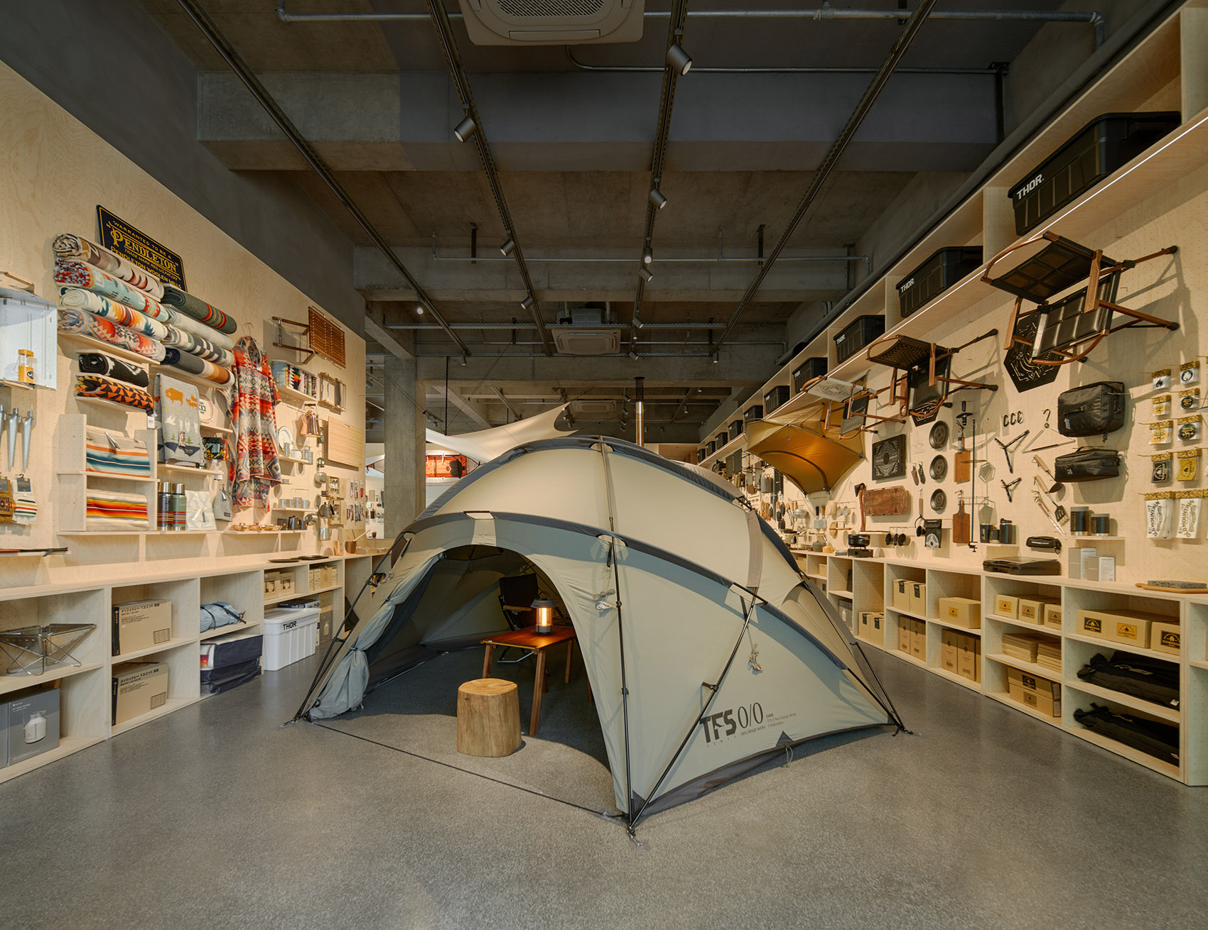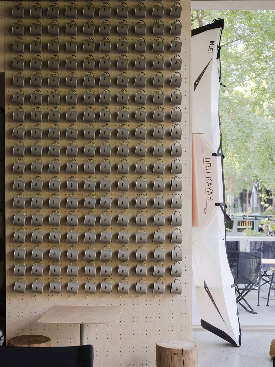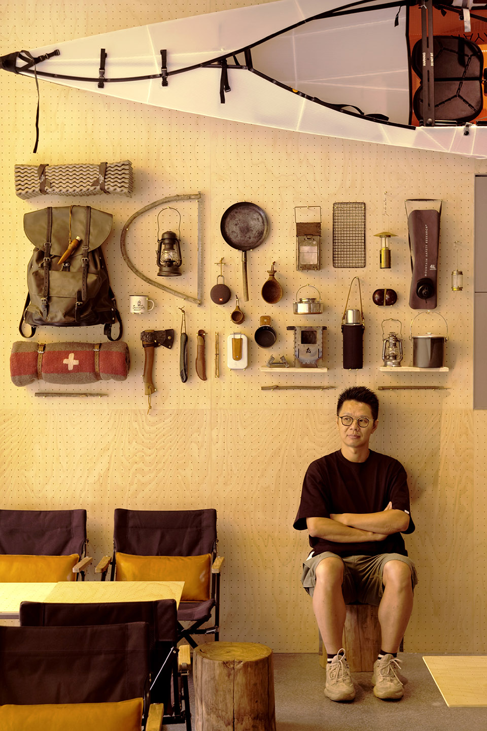 露营产品大到帐篷天幕,小到地钉勺子,多样性强,形式规格多变,货品上新速度快,需要一种灵活的陈列模式,OFF店里运用了木质洞洞板,并将此延伸为空间主元素与主色调。