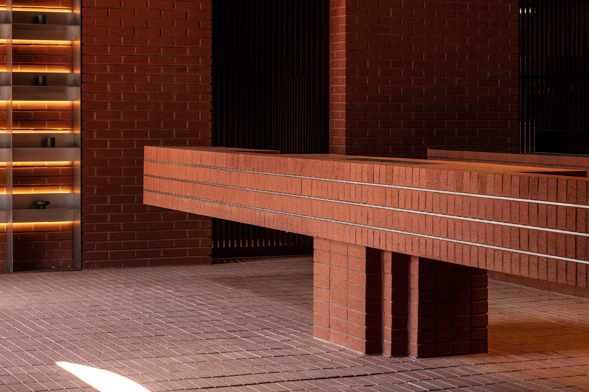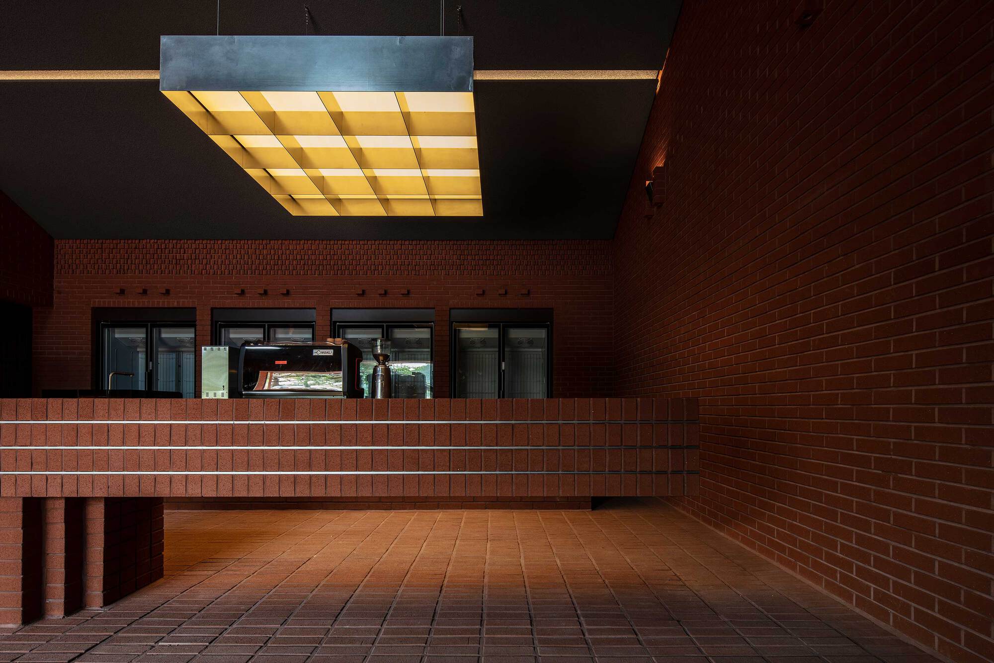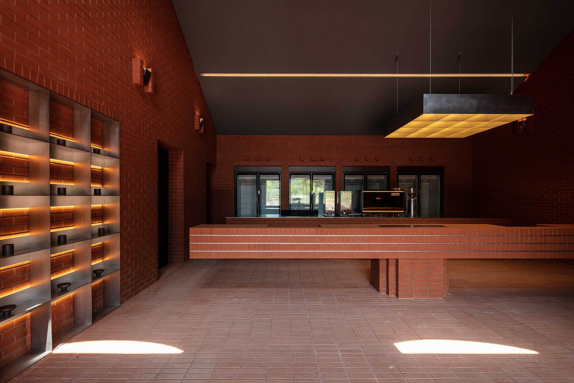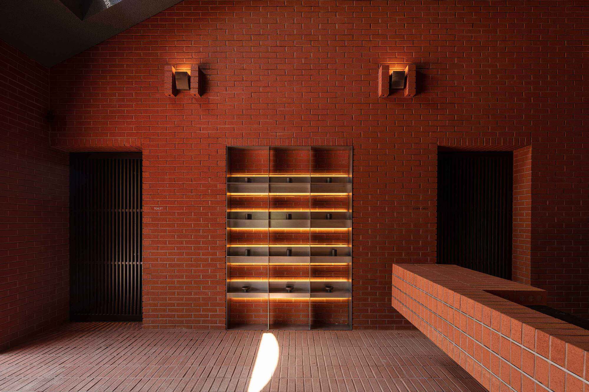EYST1779 的建筑理念的关键在于砖。砖是长期以来最广泛应用的材料之一,在未来也仍旧如此。因此,我们认为砖是契合项目主题——联系过去与未来——的合适材料。我们选择了与周围环境相协调的红砖,而且使用了红砖的整个体量也有很强的存在感。地面、墙壁和顶棚均由砖砌成,更加清晰并强烈地表达出这个场地的身份和印象。此外,我们认为逐块砌砖也可以类比为时间的堆积。在地板、墙壁、门/窗框、吧台、照明等处采用的现代图案和不锈钢点缀,则是对未来的隐喻。