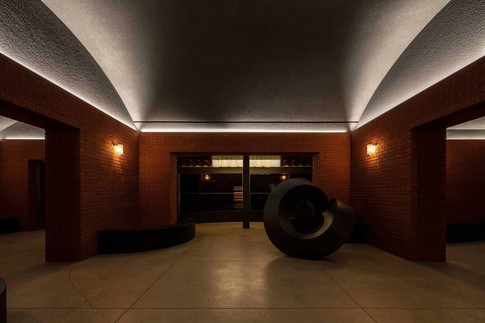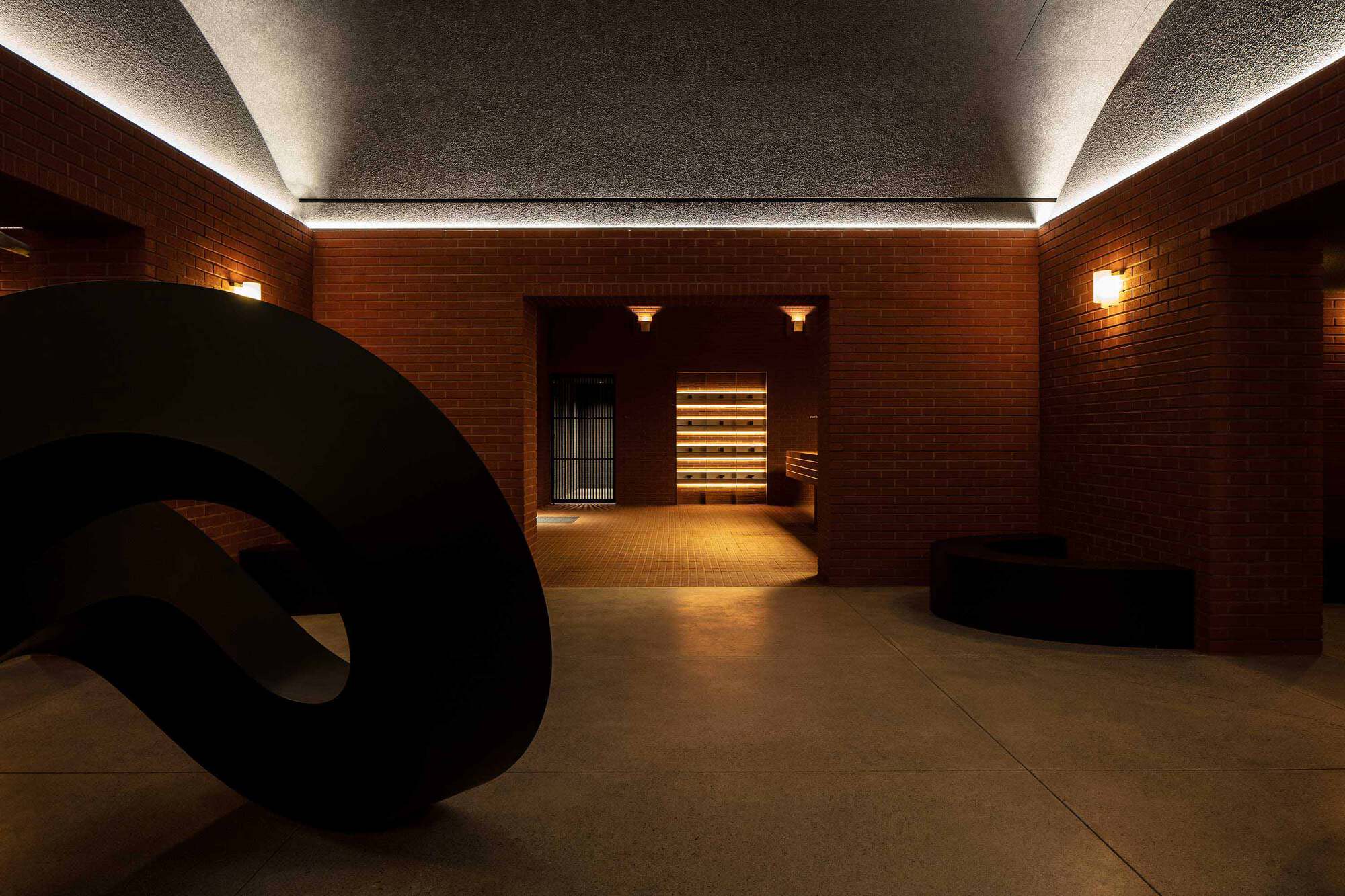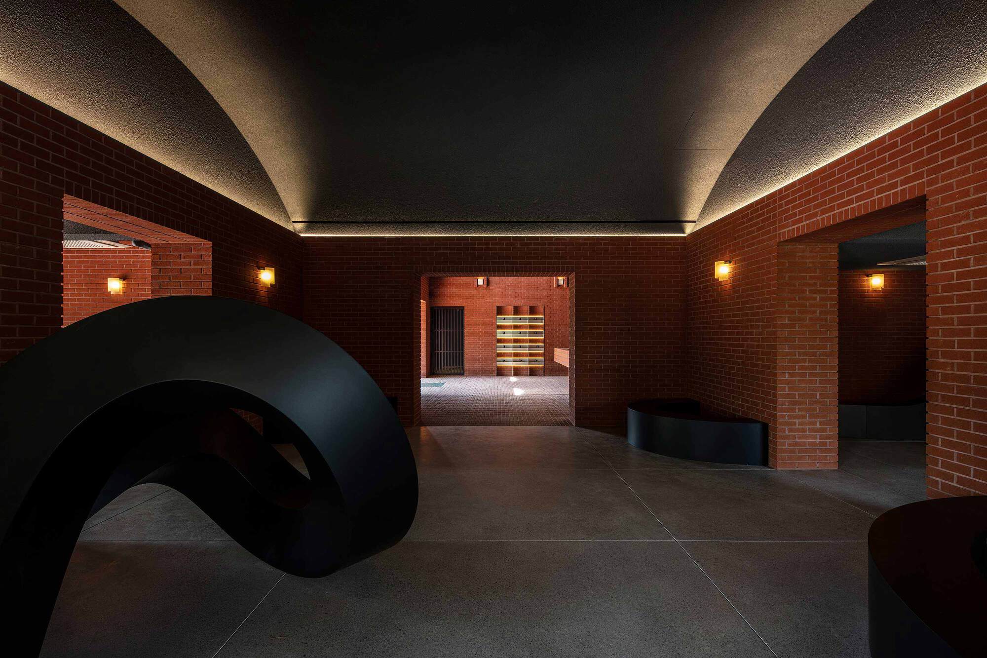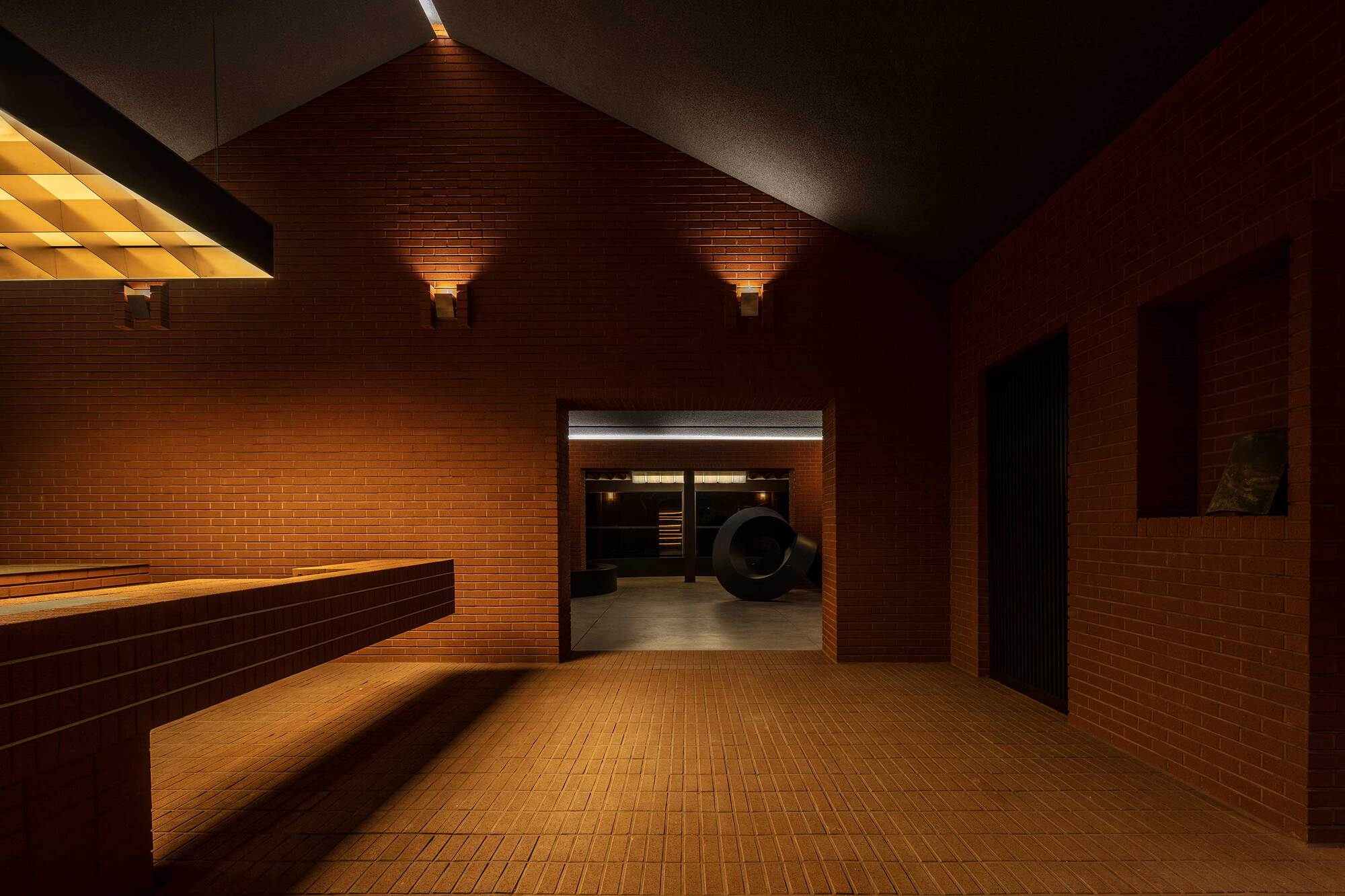 EYST1779 的建筑理念的关键在于砖。砖是长期以来最广泛应用的材料之一,在未来也仍旧如此。因此,我们认为砖是契合项目主题——联系过去与未来——的合适材料。我们选择了与周围环境相协调的红砖,而且使用了红砖的整个体量也有很强的存在感。地面、墙壁和顶棚均由砖砌成,更加清晰并强烈地表达出这个场地的身份和印象。此外,我们认为逐块砌砖也可以类比为时间的堆积。在地板、墙壁、门/窗框、吧台、照明等处采用的现代图案和不锈钢点缀,则是对未来的隐喻。