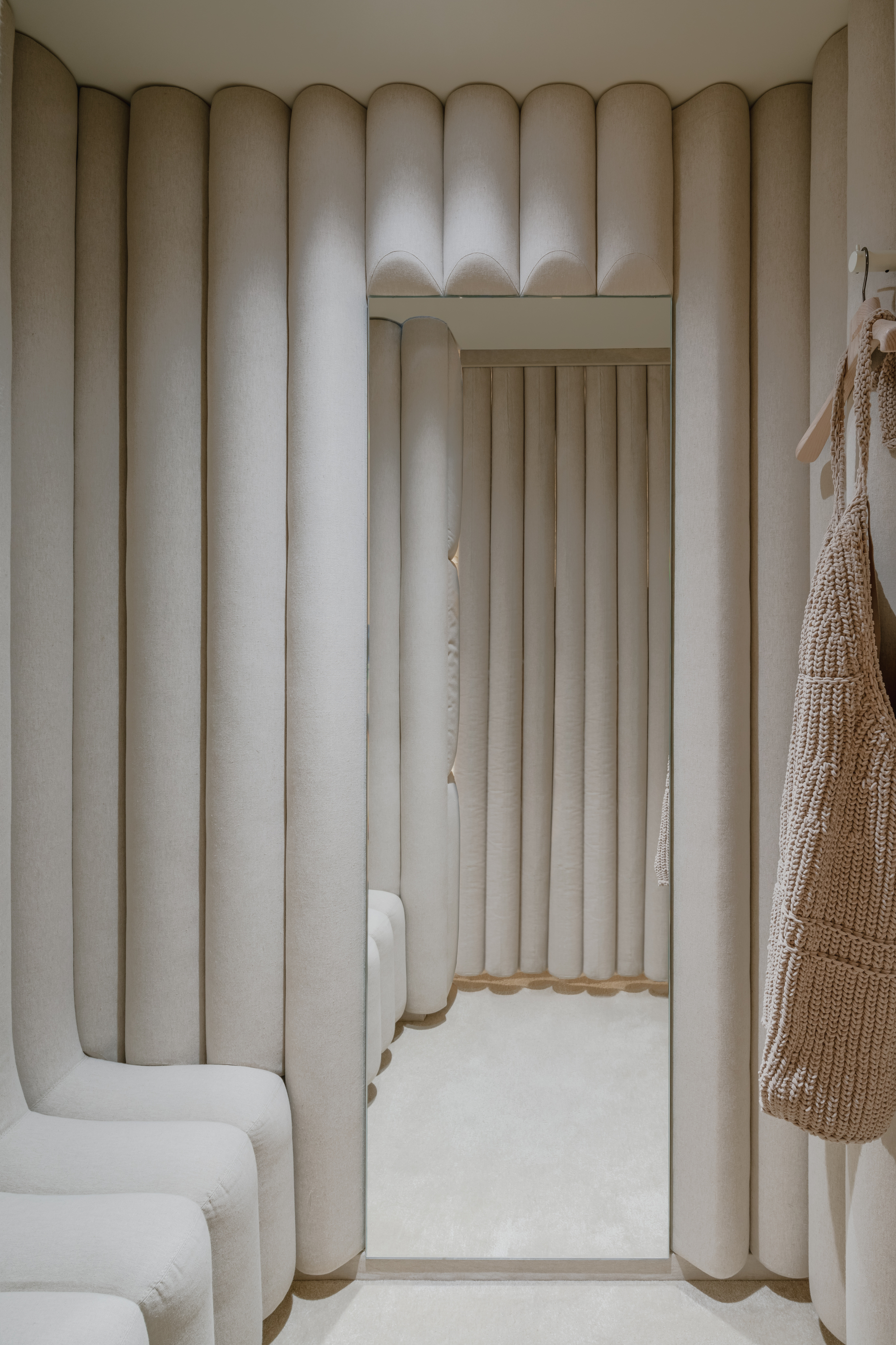 从让人想起普罗旺斯纺织品的枕头,到与法国南部景观相呼应的粘土材料 terracruda,店铺完全采用单一材料包裹,营造出空间的连续性。在巴黎老佛爷百货公司的店内,墙壁、门、试衣间和展示元素都采用白色软垫,散发出在床上度过一天般的轻松和舒适氛围。
