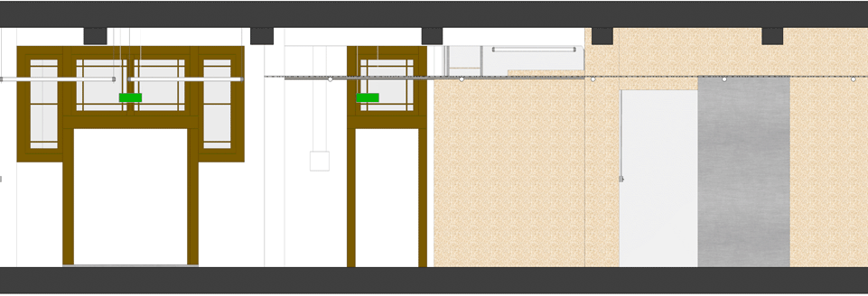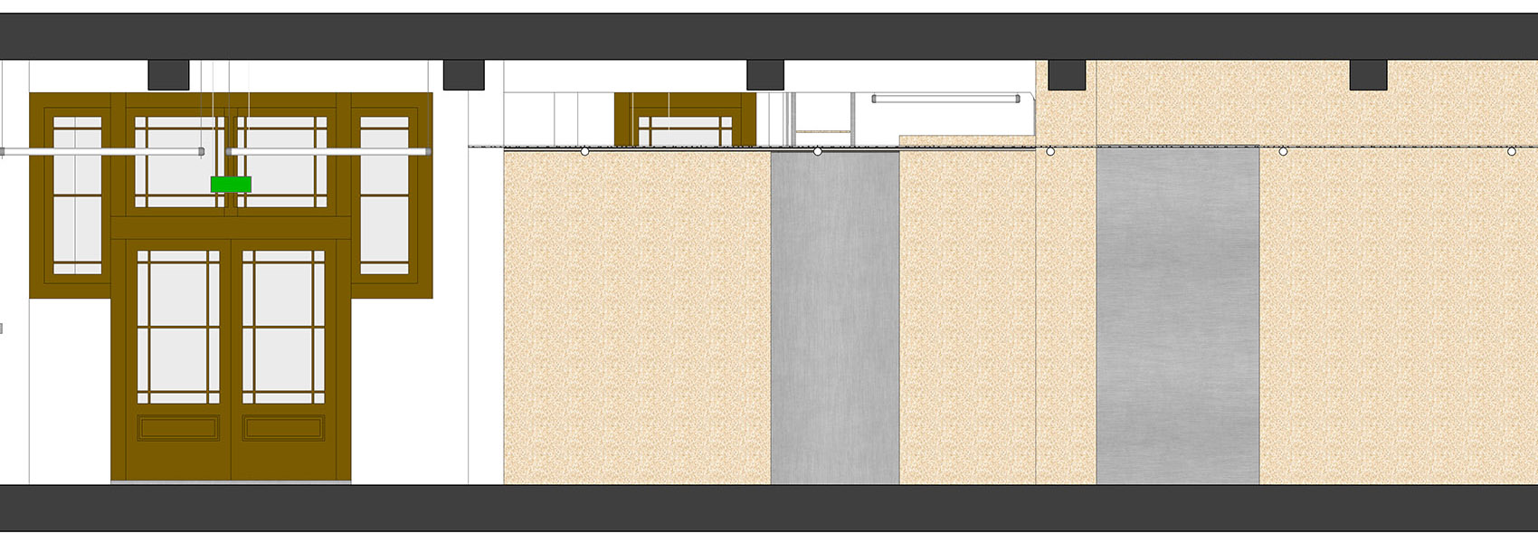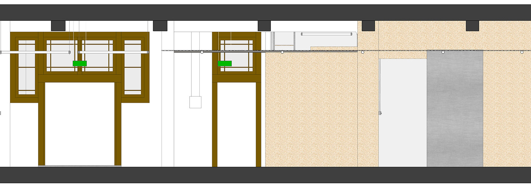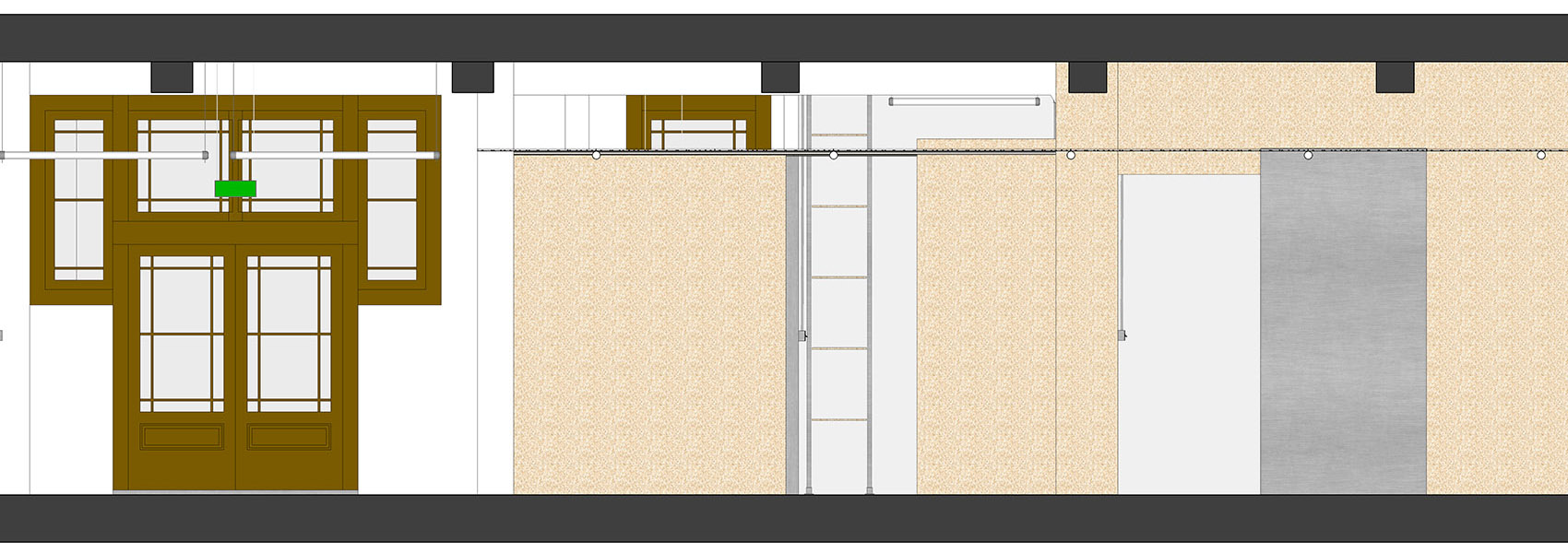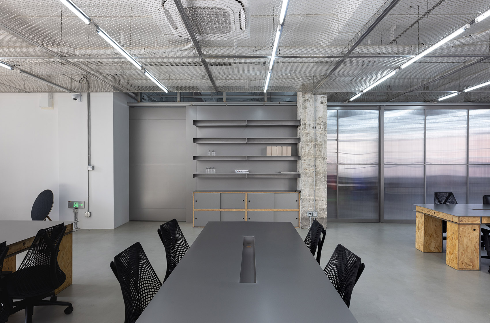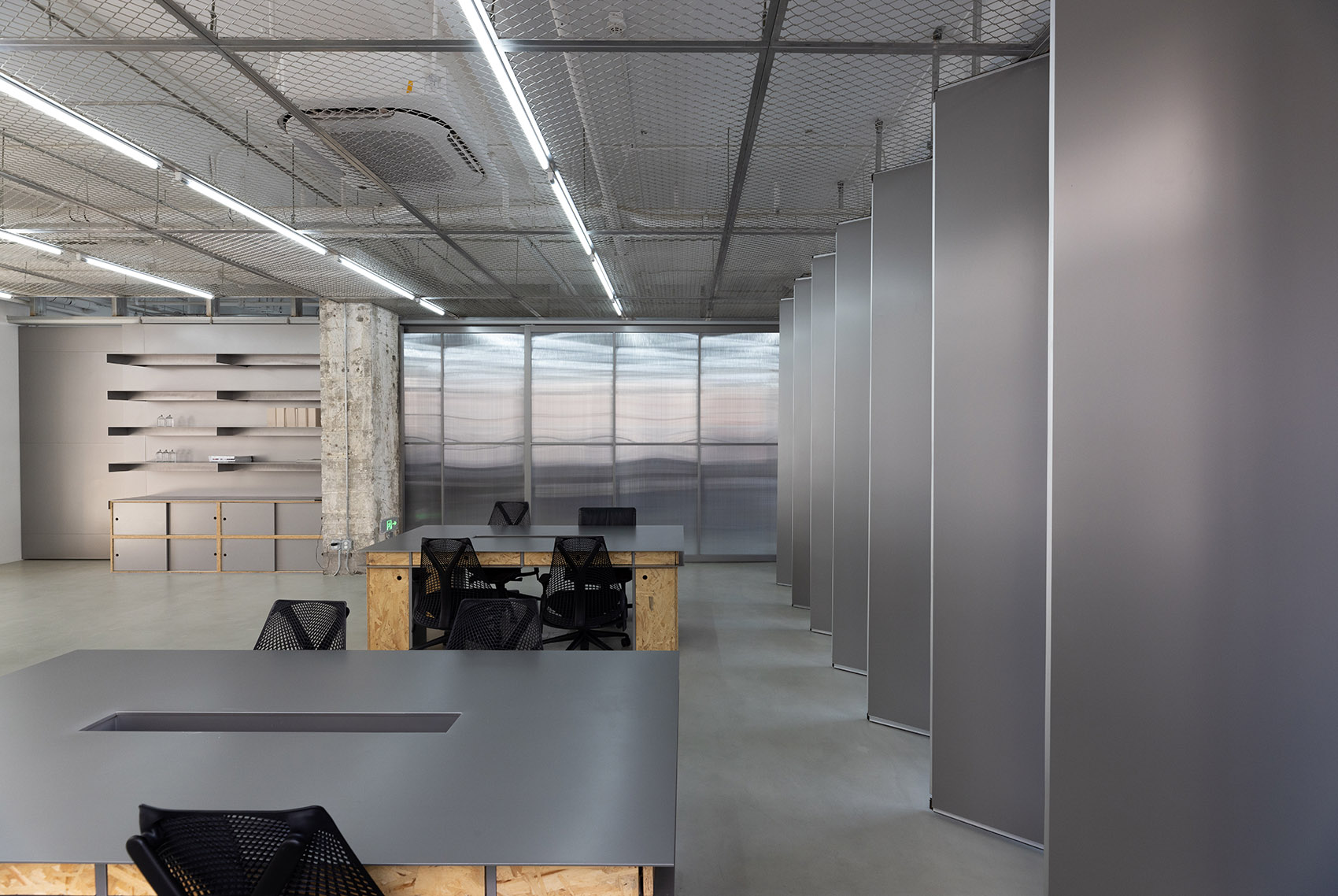 考虑到整个公共区域需要同时满足办公和showroom的功能,且由于showroom需求的多样性,在举办大型活动时,办公区域也需被纳入为活动空间,因此在设计公共区域时没有增设固定的隔墙,而是使用两组滑门取代了传统的隔墙,以应对各种分割的可能性,实现空间可变的多样性。最大限度的保留了整个公共空间的开放性和灵活度。