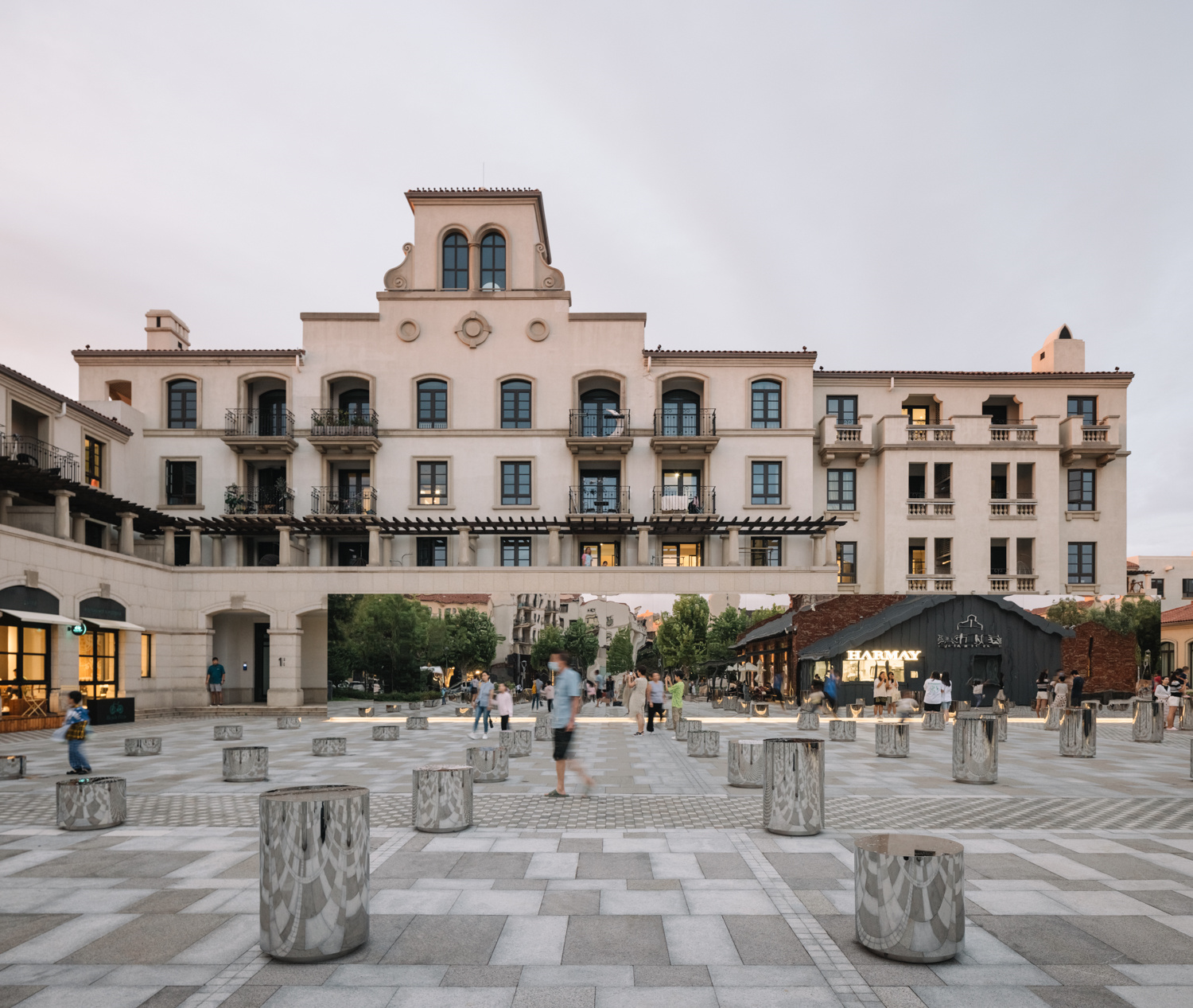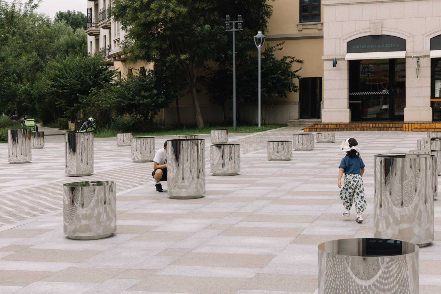 我们用诗意的构图激活广场,拥抱这个新世界,有节奏的独立体块被冲上海滩,搁浅于此。一整面的镜子墙标志着商店的位置,同时反映了虚幻的现实。广场因而成为一个公众可参与其中的演绎空间。