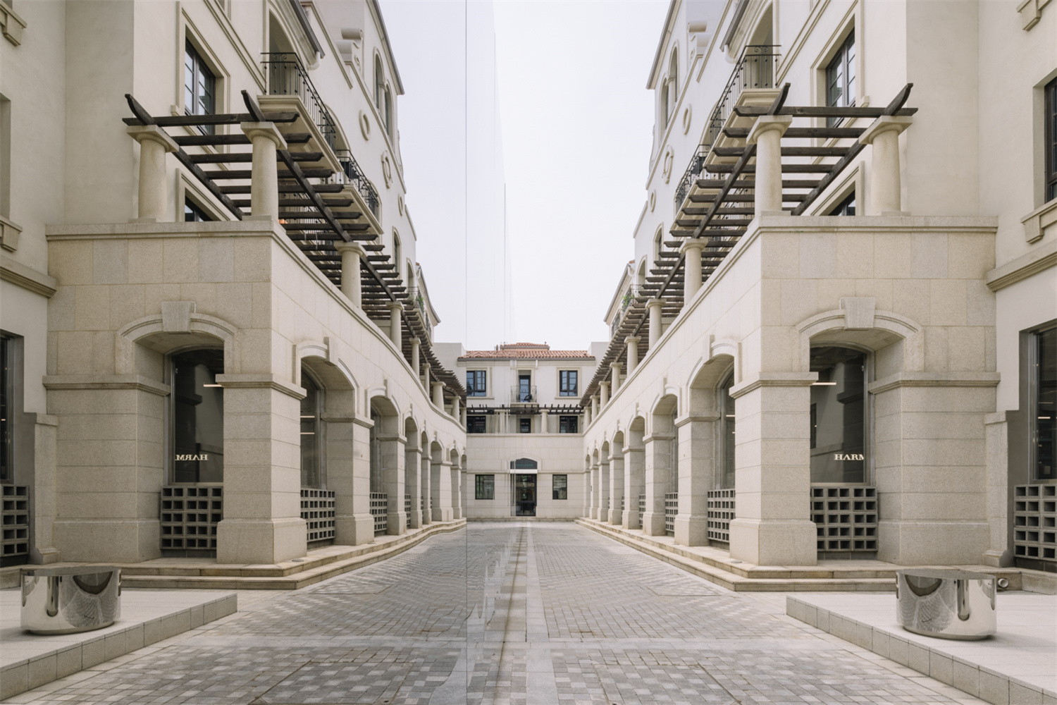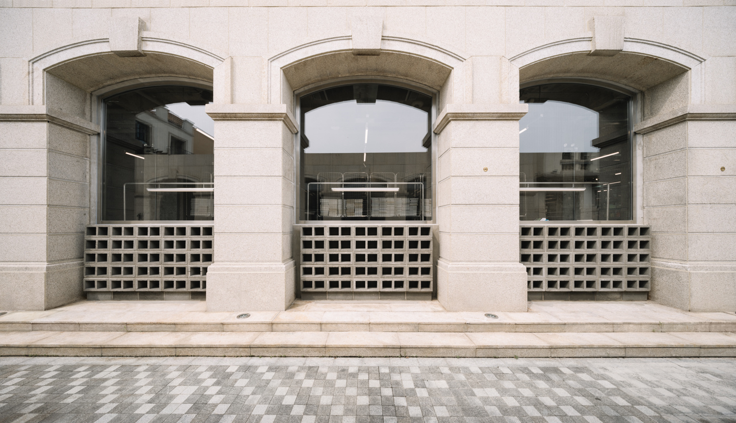 场地位于一栋新建不久的外立面颇具“传统”风格的公寓底层,这里并不像常规公寓楼那样面向繁忙的街道,而是坐落于一个略有进深活跃度较低的公共广场上。
