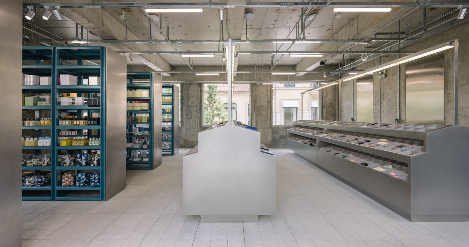 作为剥离的空间,步入店铺后首先看到的是图书与杂志区。钢制的书刊储物架和粗犷的混凝土砖及平板桌,都将店铺模拟成一个快闪空间。