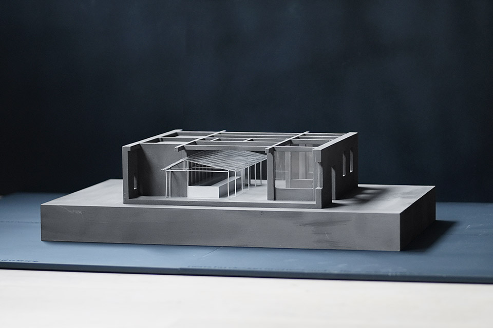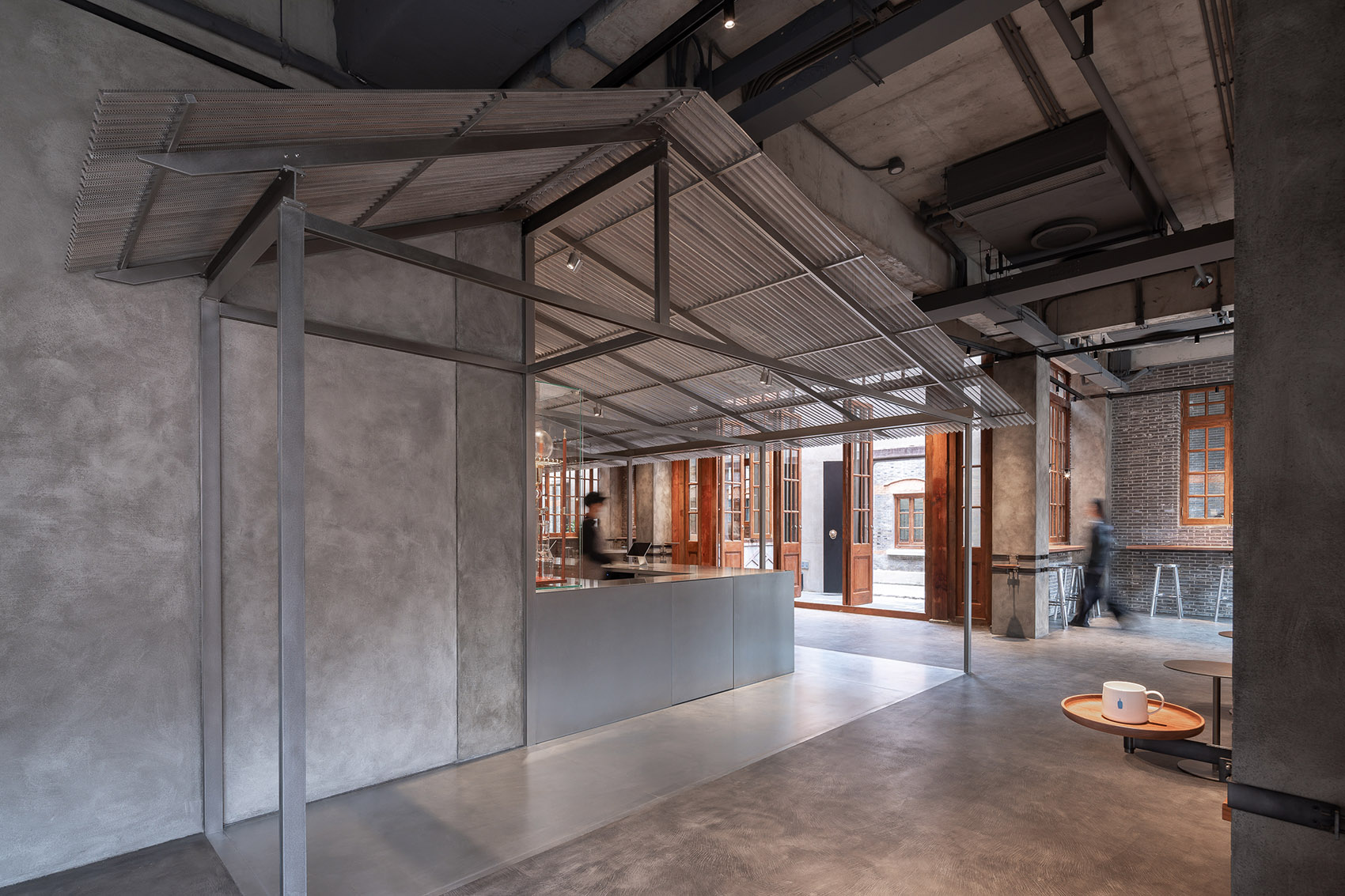 出于历史保护的原则,建筑立面与天井的原有砖墙和门窗均得到了保留,延伸至室内,成为了设计师创作的语境及画布。如恩回溯建筑的本源,在室内置入了一个原始的屋舍。这个简易的“庇护所”作为动线的交汇之处、空间的视觉焦点,是咖啡师精心调制饮品的吧台区域。