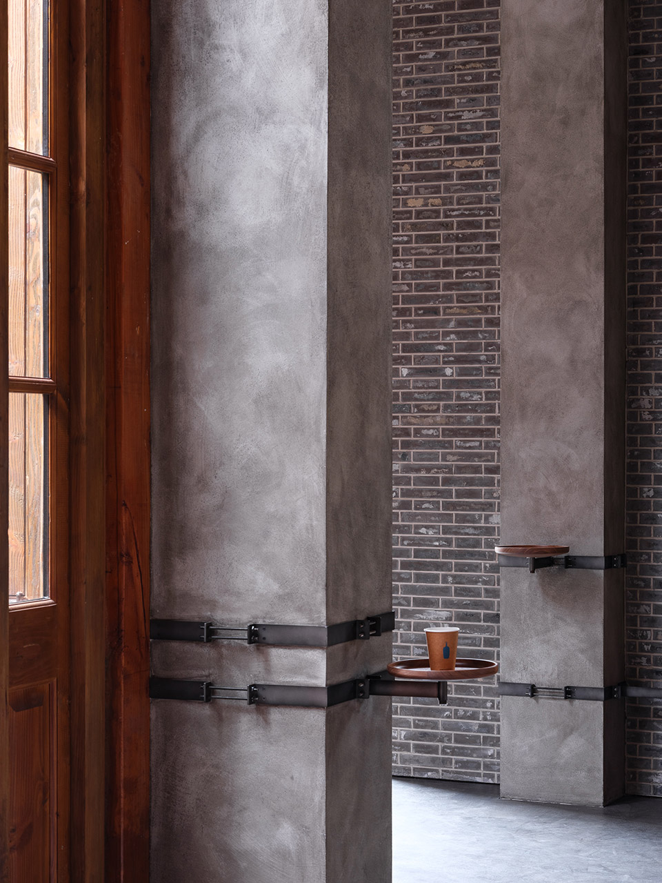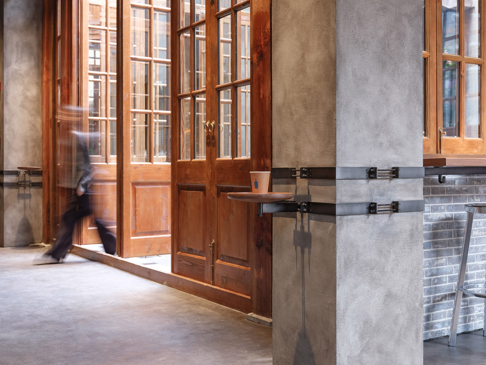 如恩受此启发,将建筑中原有的结构柱以金属杆件稍作连接,实现了灯轨、边桌、长椅和展示陈列等功能。店内除了品牌家具以外,还精心添置了的传统老家具。岁月留下的痕迹,也为这间新旧交融的蓝瓶咖啡带来了一份暖意。