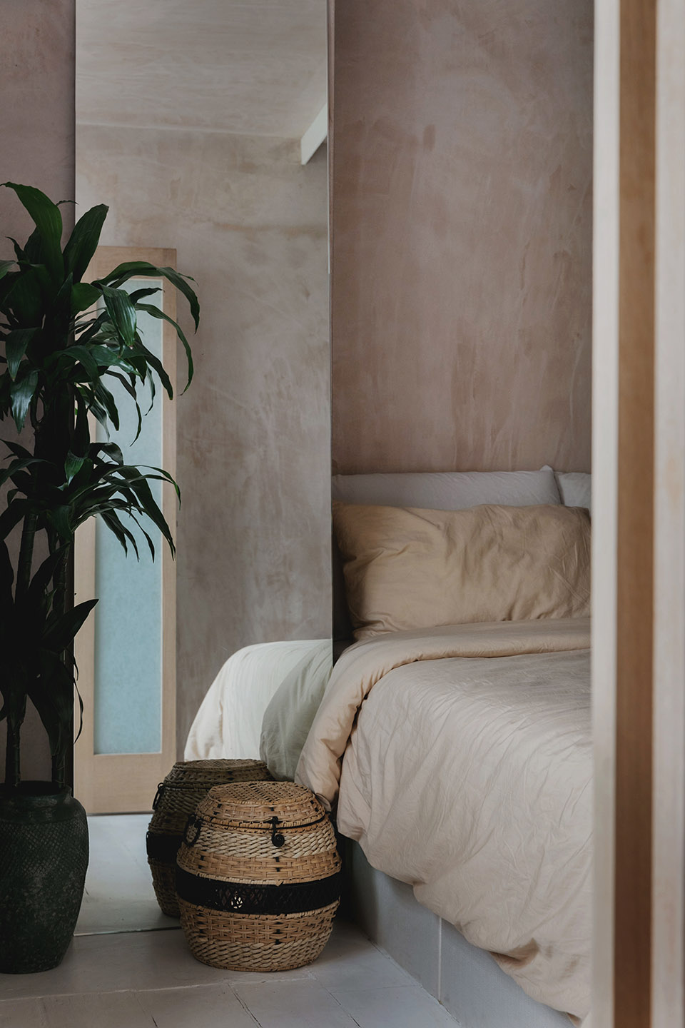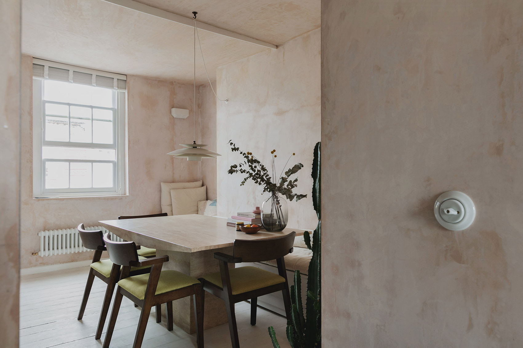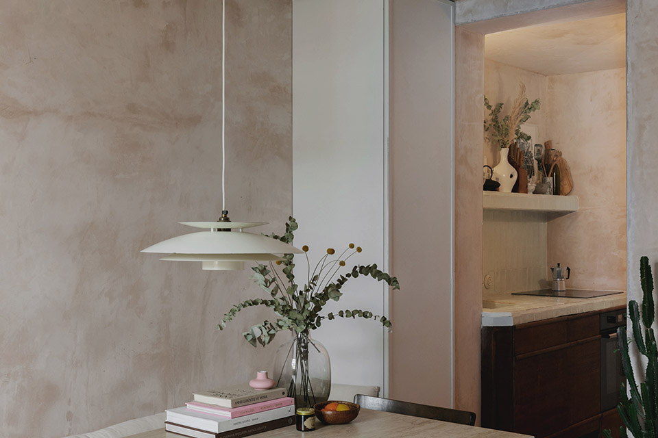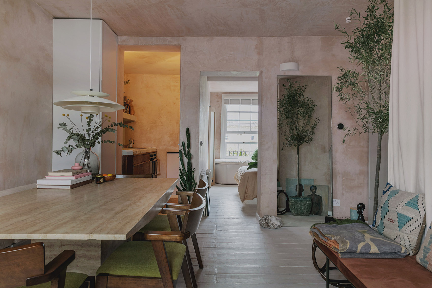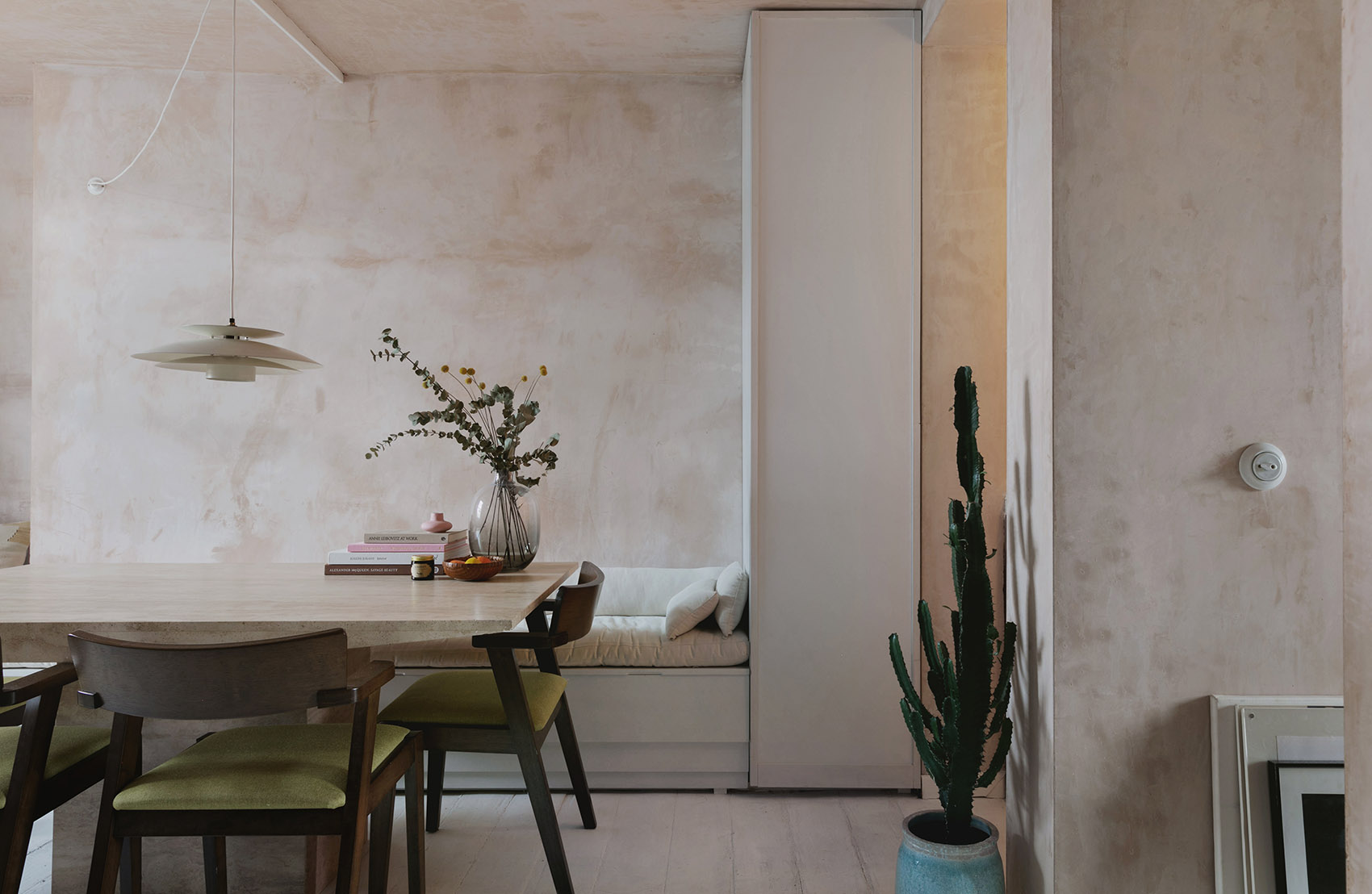 富有原始气息的粘土石膏墙和天花板贯穿了整个公寓,破旧的白色地板虽然经过翻新,但仍保留着自己的故事。
