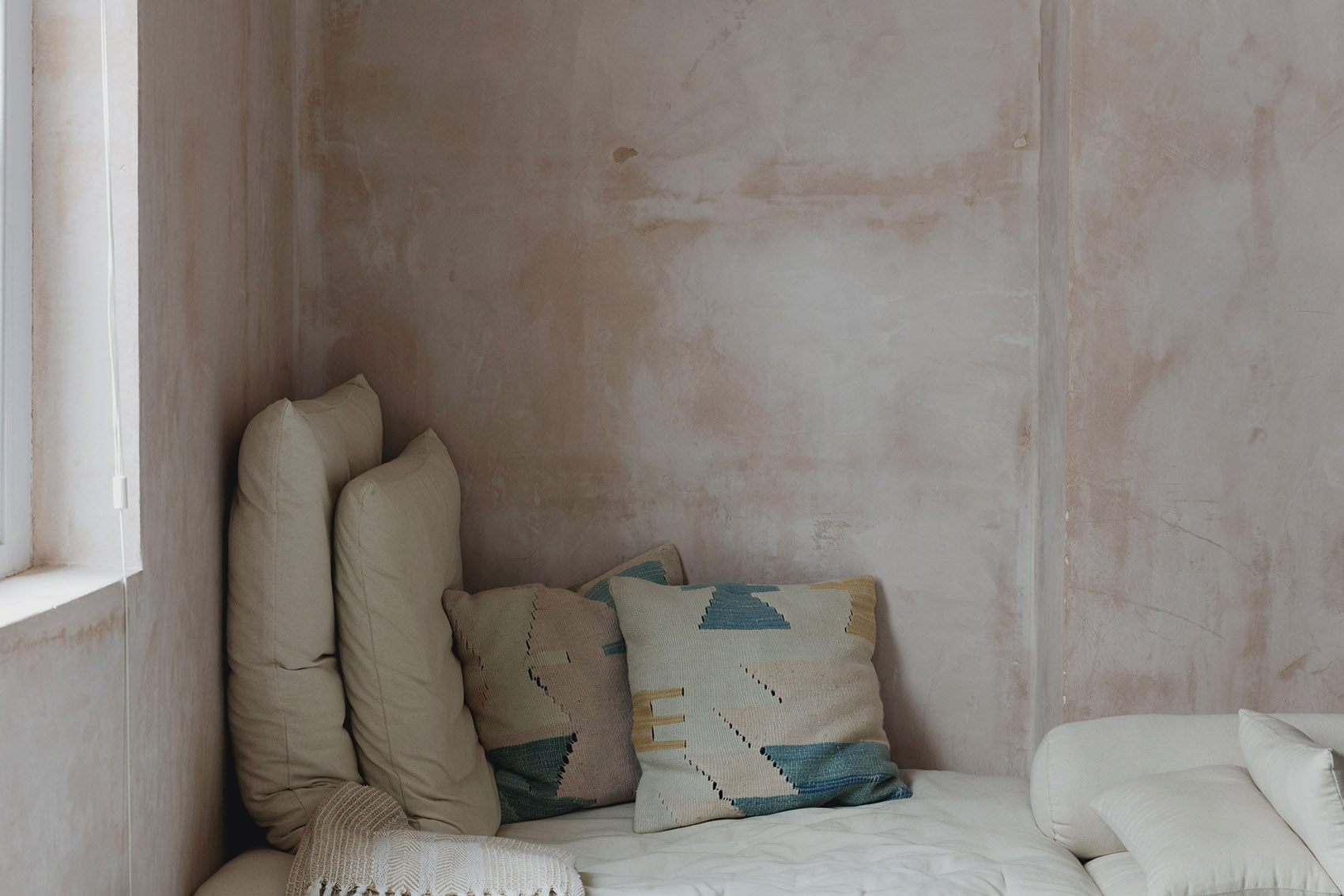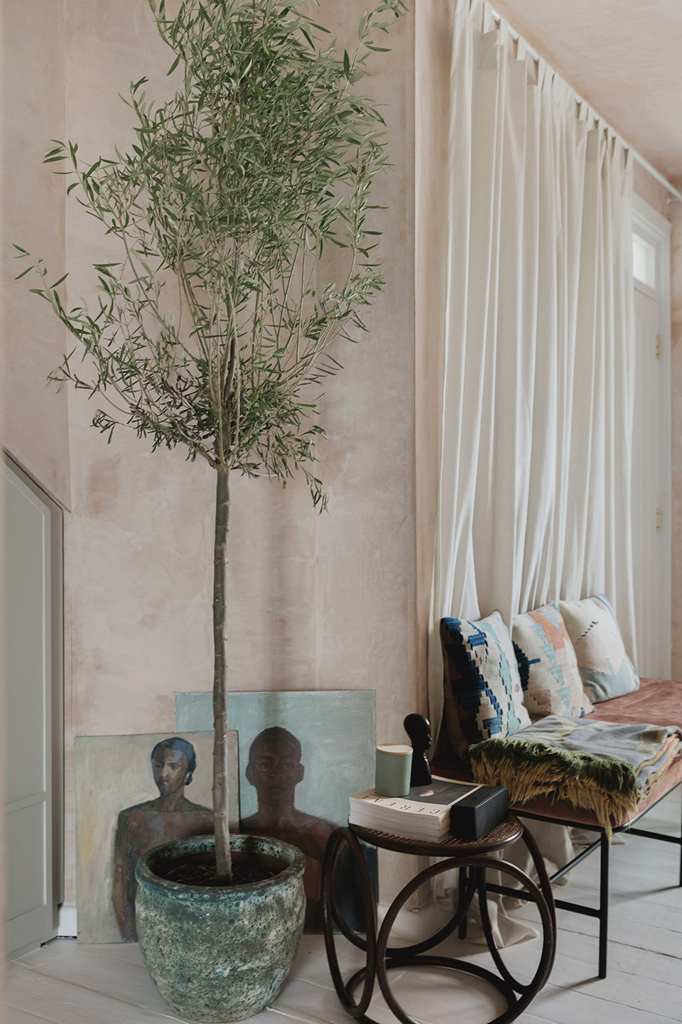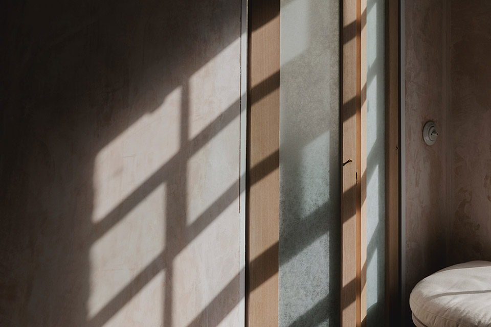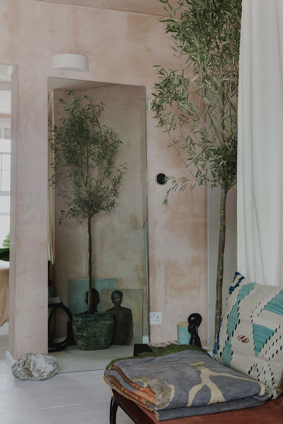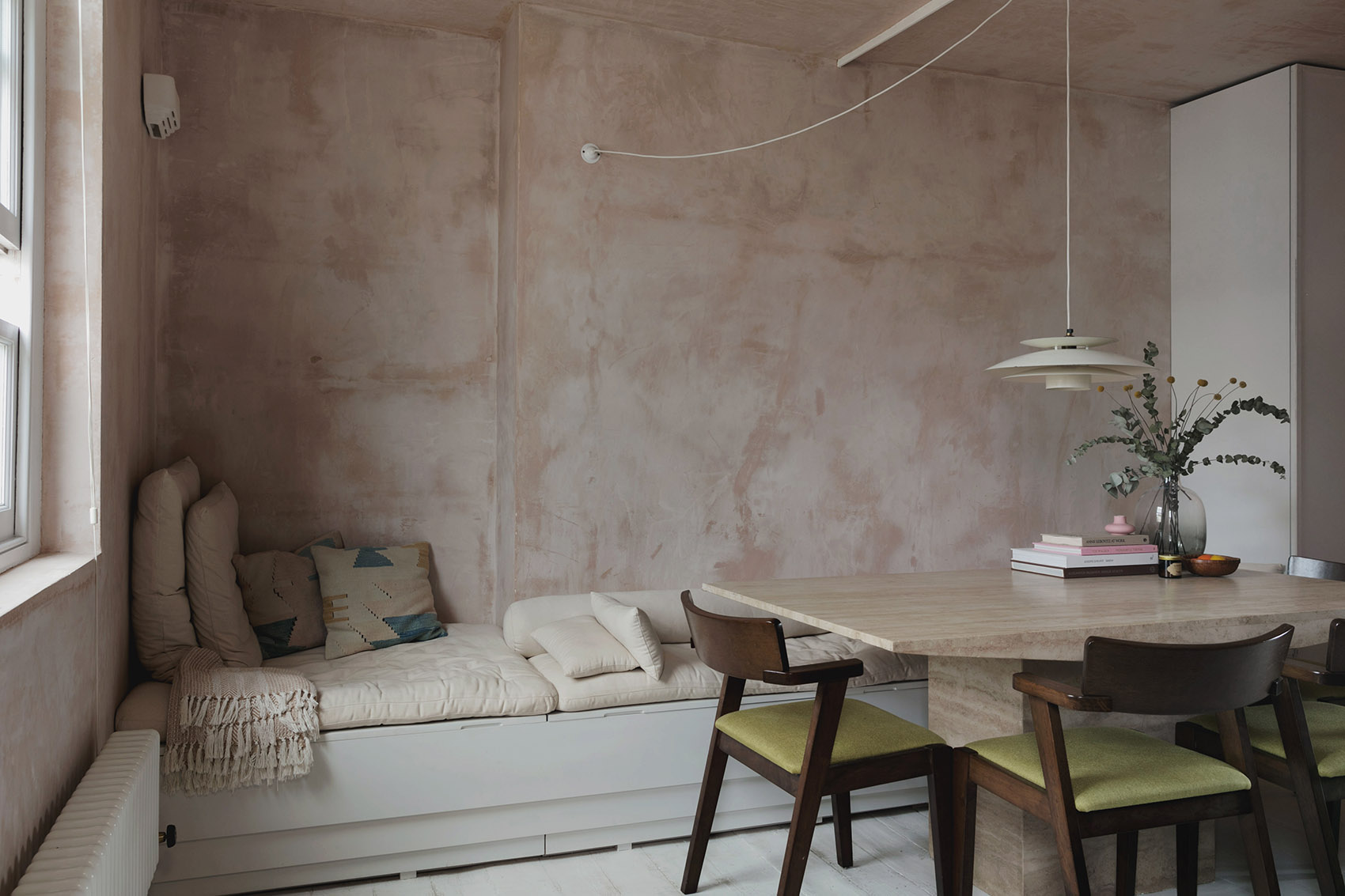 富有原始气息的粘土石膏墙和天花板贯穿了整个公寓,破旧的白色地板虽然经过翻新,但仍保留着自己的故事。