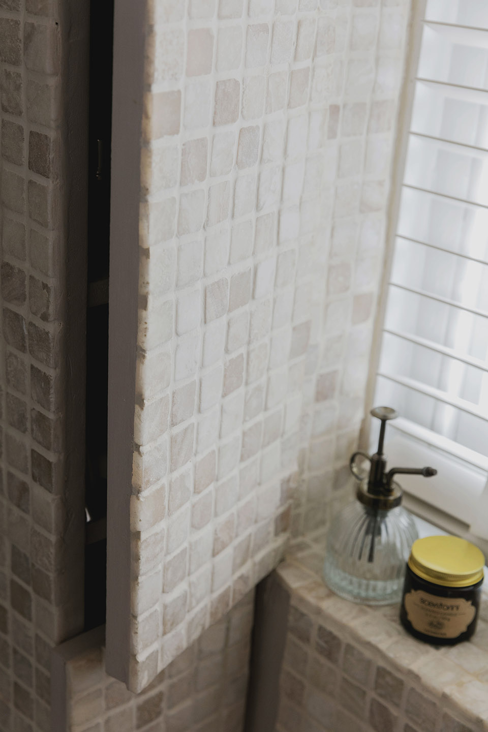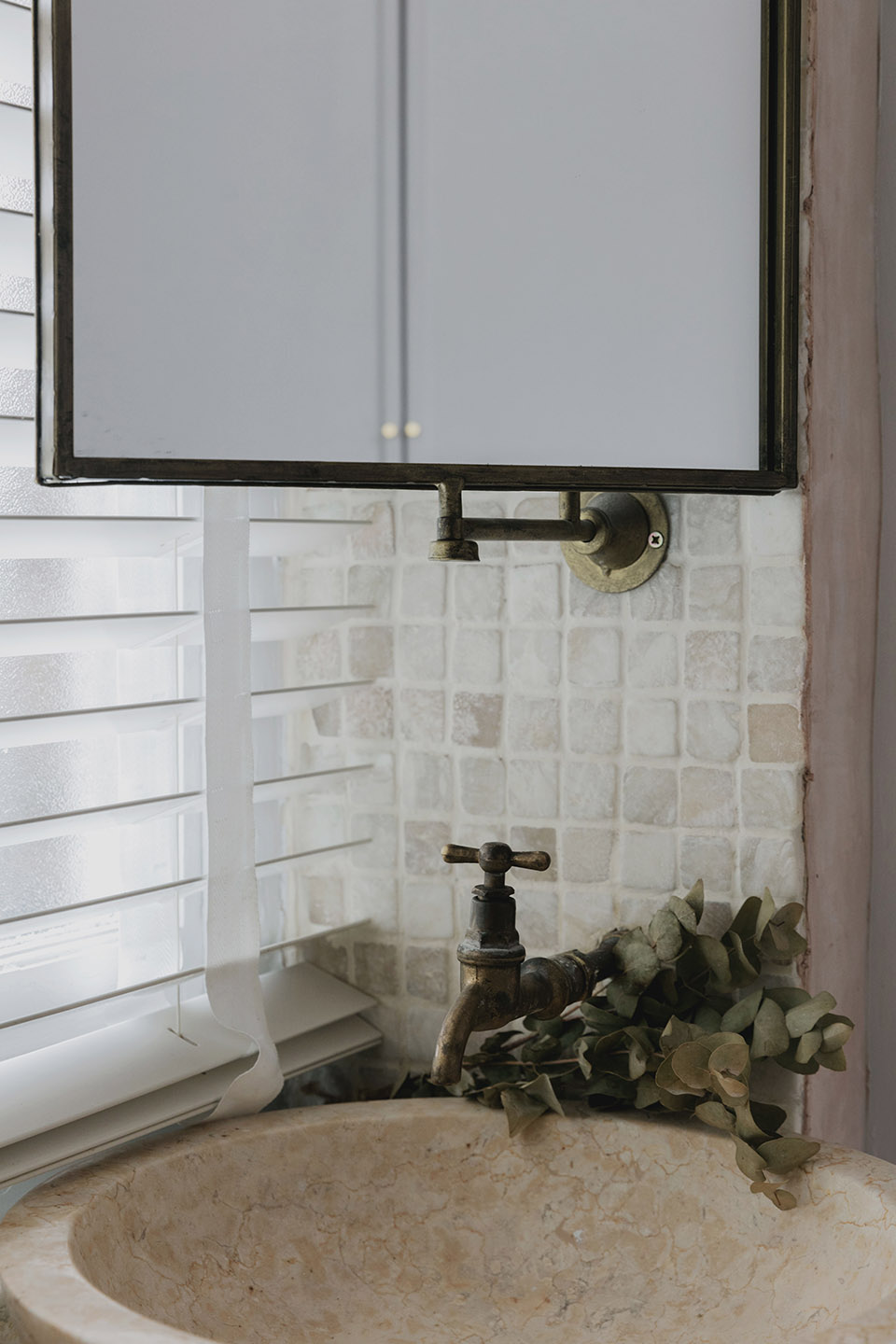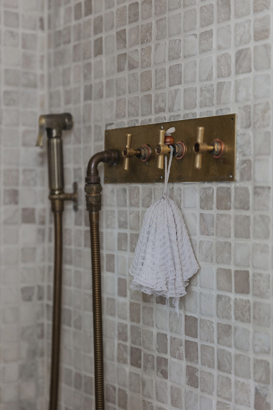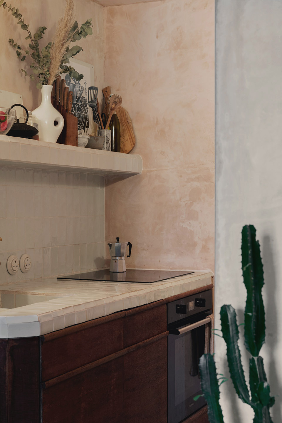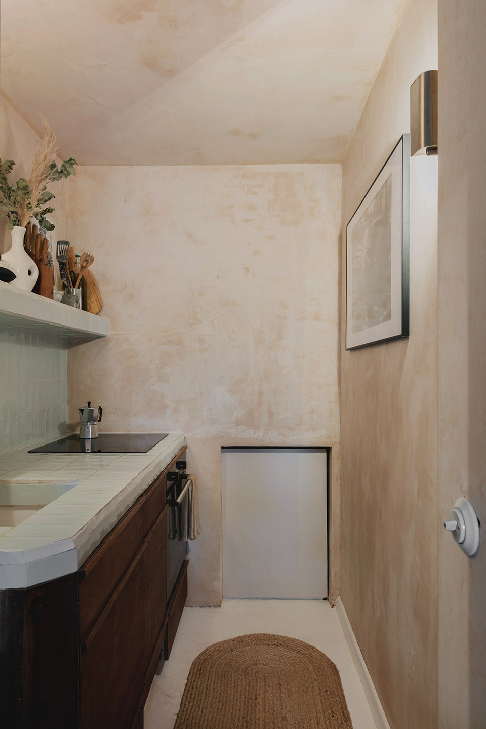 厨房操作台由老桦木建造,生机勃勃的仙人掌和橄榄树为厨房提供了充满自然气息的空间背景。厨房台面采用了手工切割的瓷砖饰面,浴室则铺满了缟玛瑙马赛克。