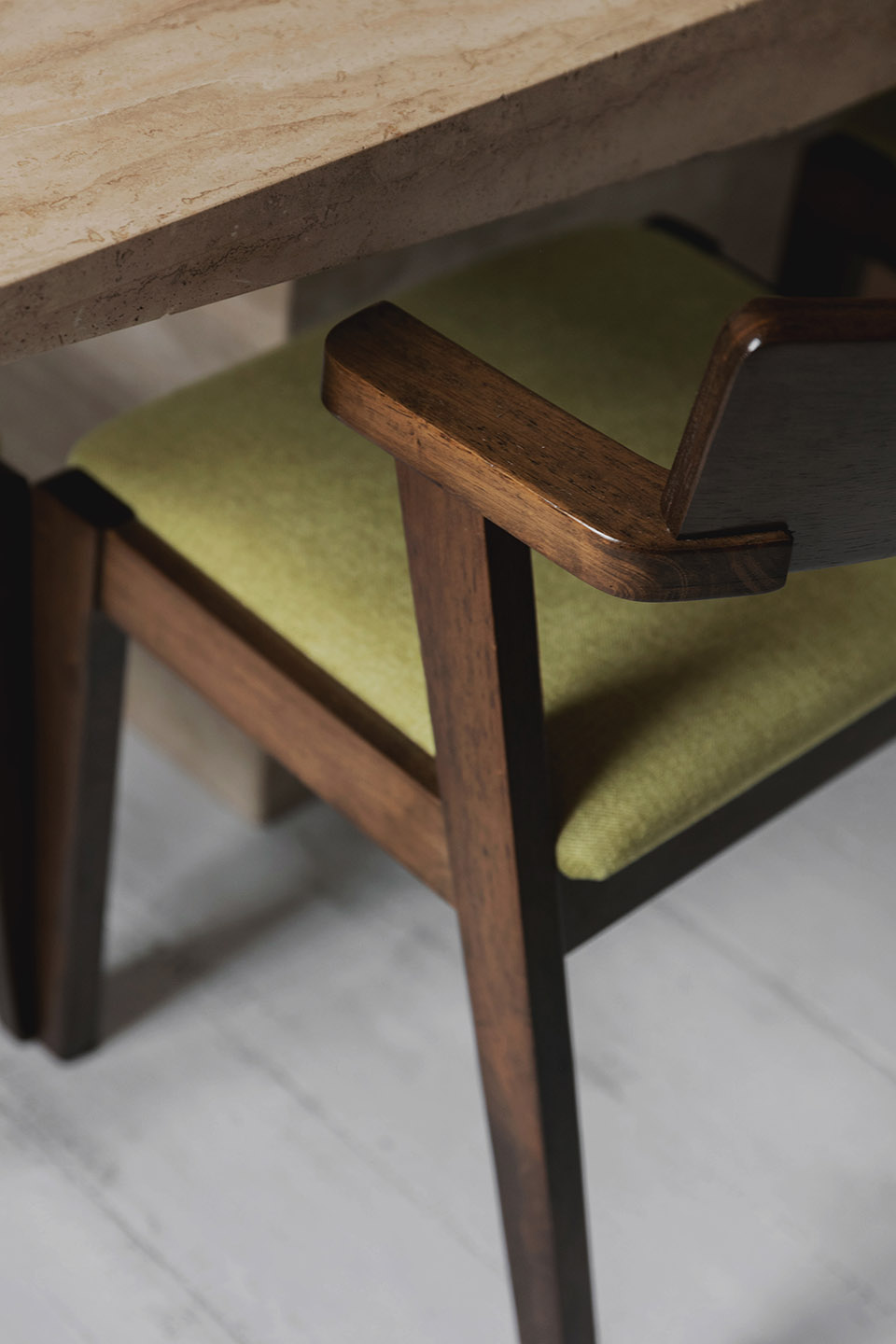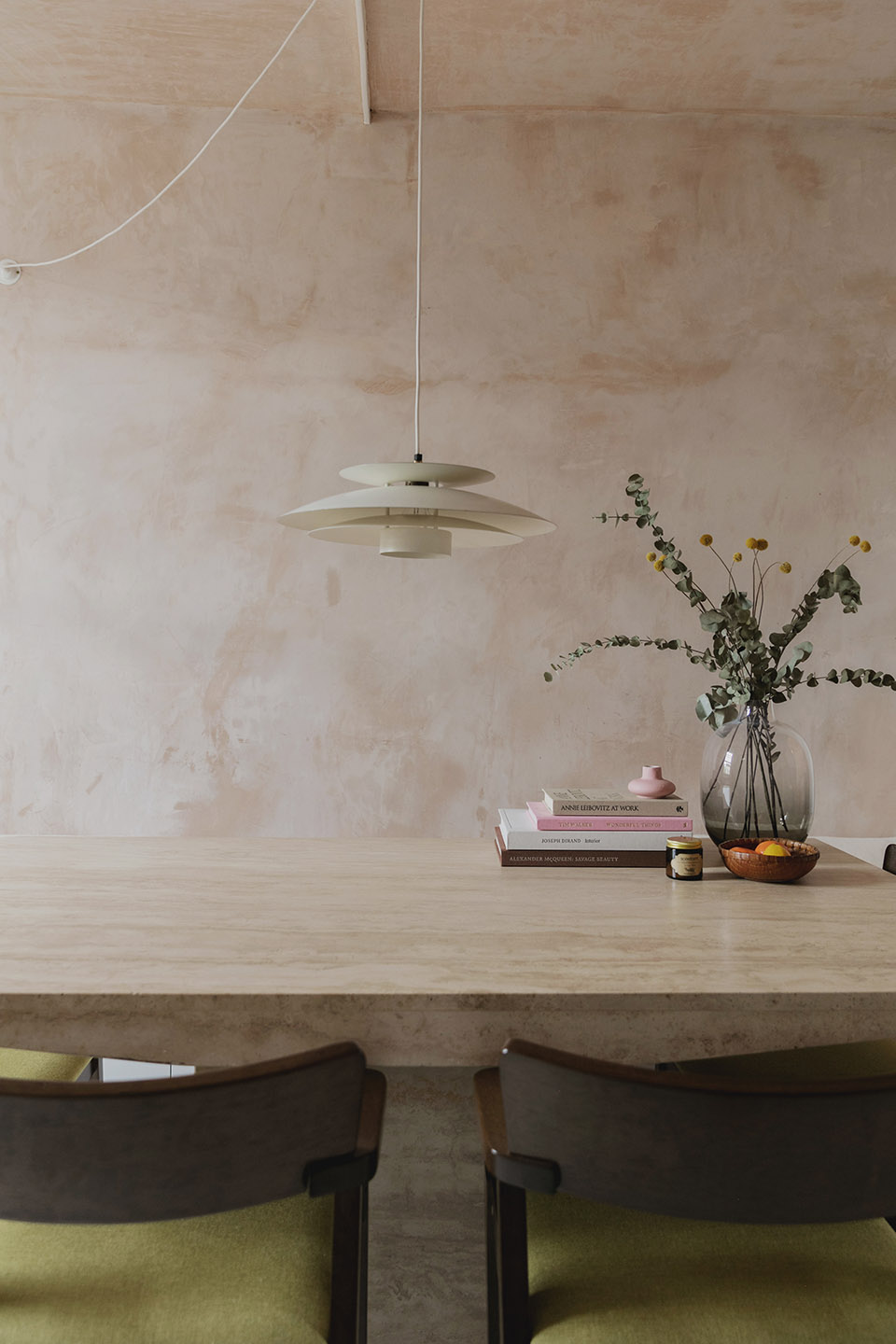 一张由洞石制成的长桌形成了工作、用餐和生活区的中心,将光线反射到空间深处。