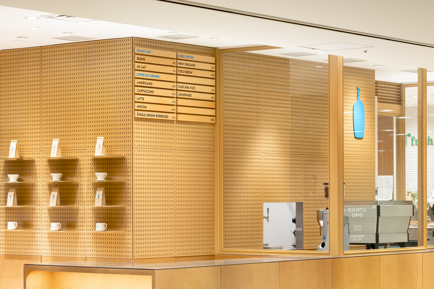 Schemata Architects在东京NeWoman为Blue Bottle Coffee设计了一个咖啡厅摊位,这个咖啡摊位仅供外卖,也可用于商品促销。它被设计为一种工业产品,而不是空间。在颜色方面,我们尽量避免使用白色,因为整个地板的调色板偏白。取而代之的是,咖啡厅摊位完全用温暖的米色材料制成,例如牛皮纸。我们使用高密度纤维板作为一种表面涂层材料,以营造出怀旧的氛围,而硬板是过去在类似家具的老式电视机背面常用的一种材料。