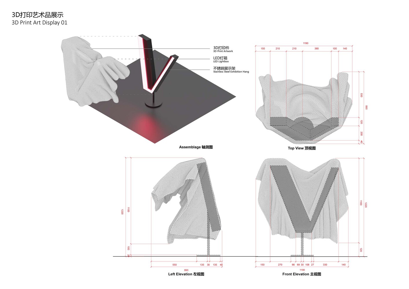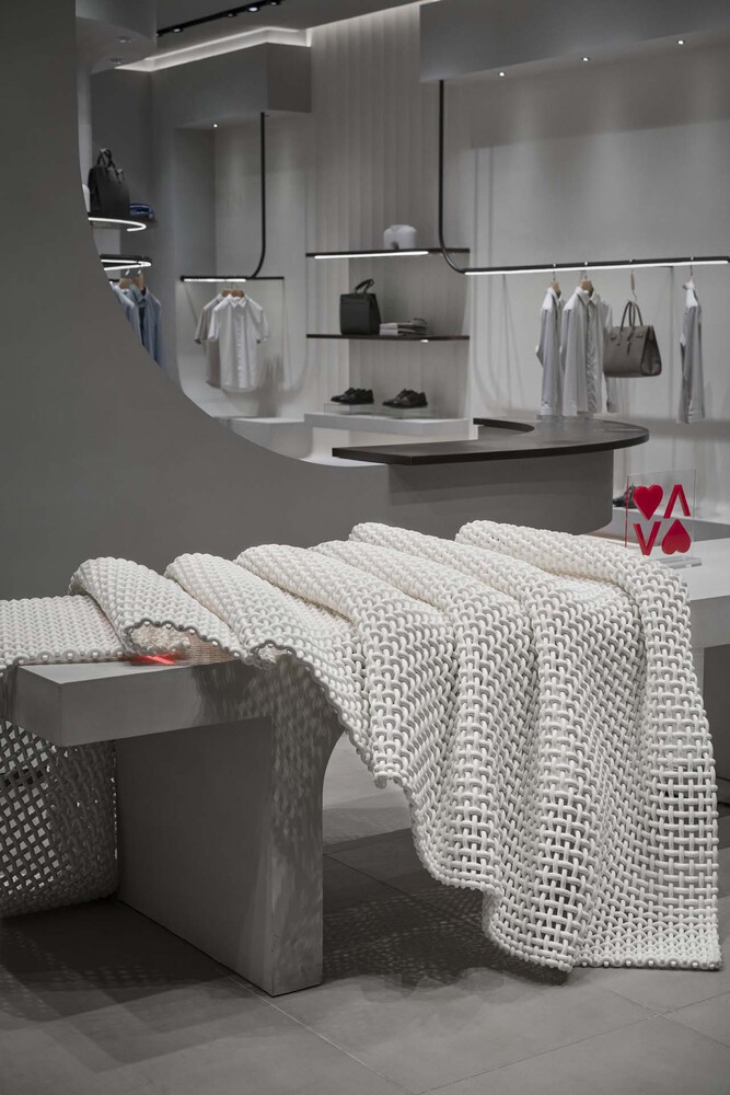 为了体现品牌的创新性以及其对未来的视野,我们创造了一系列独特的雕塑元素,以进一步吸引顾客对空间进行更深入的探索。运用先进的数字模拟,我们在静态造型上采用了风动与垂悬的物理动态生成,创建了一系列三维定格的纺织品装置。超大比例的纺织线及其富有表现力的编织图案揭示了雕塑中微妙的超现实:通过创造这些超大的编织线细节,我们向观者表达了服装的重要元素即肌理与制作过程;由于纺织品的精细属性,这一元素经常被忽视。