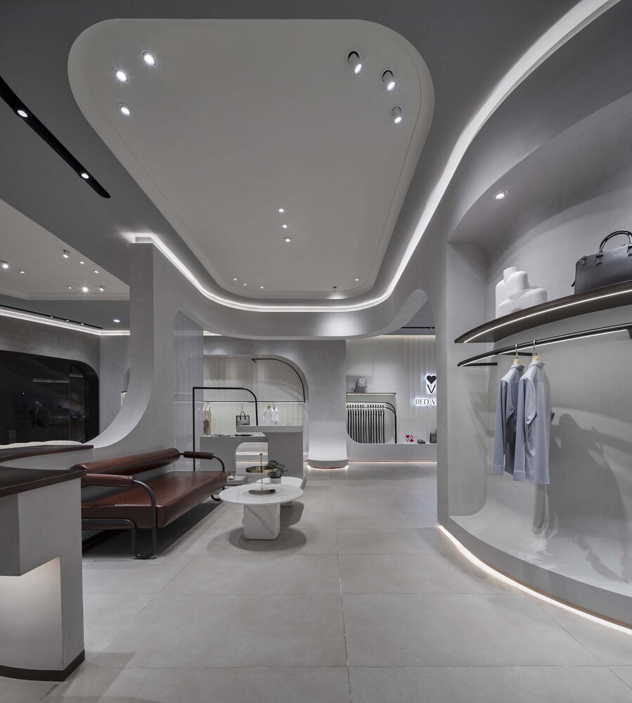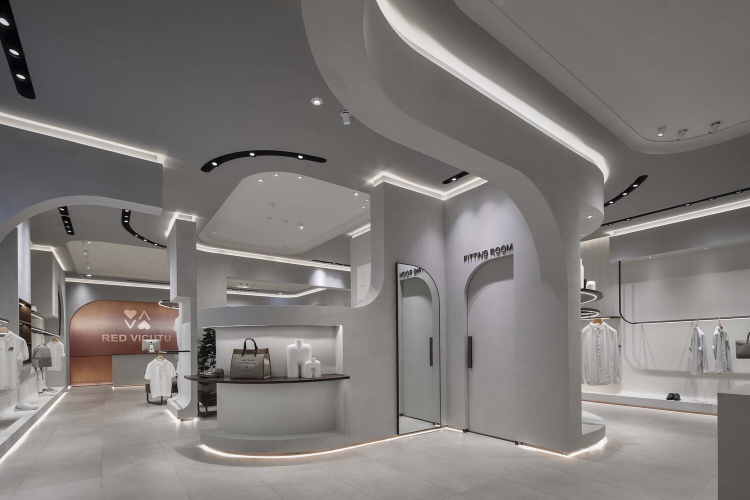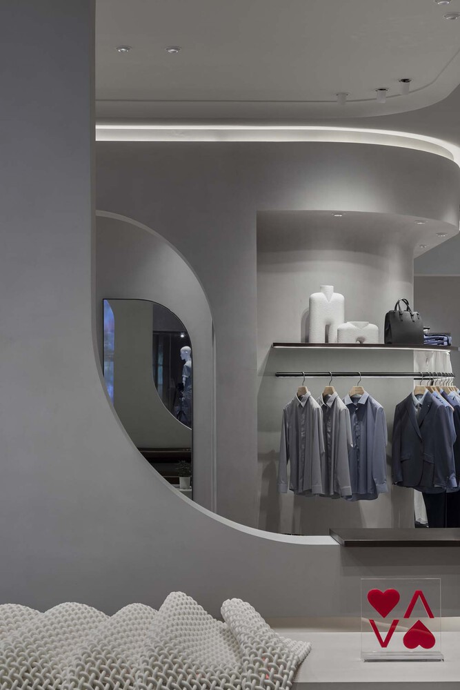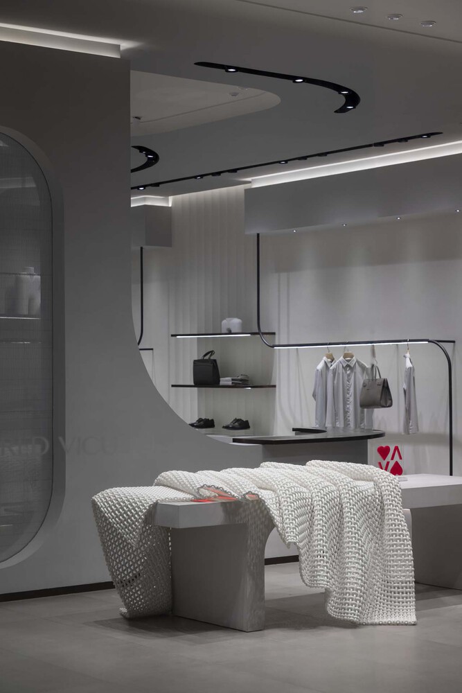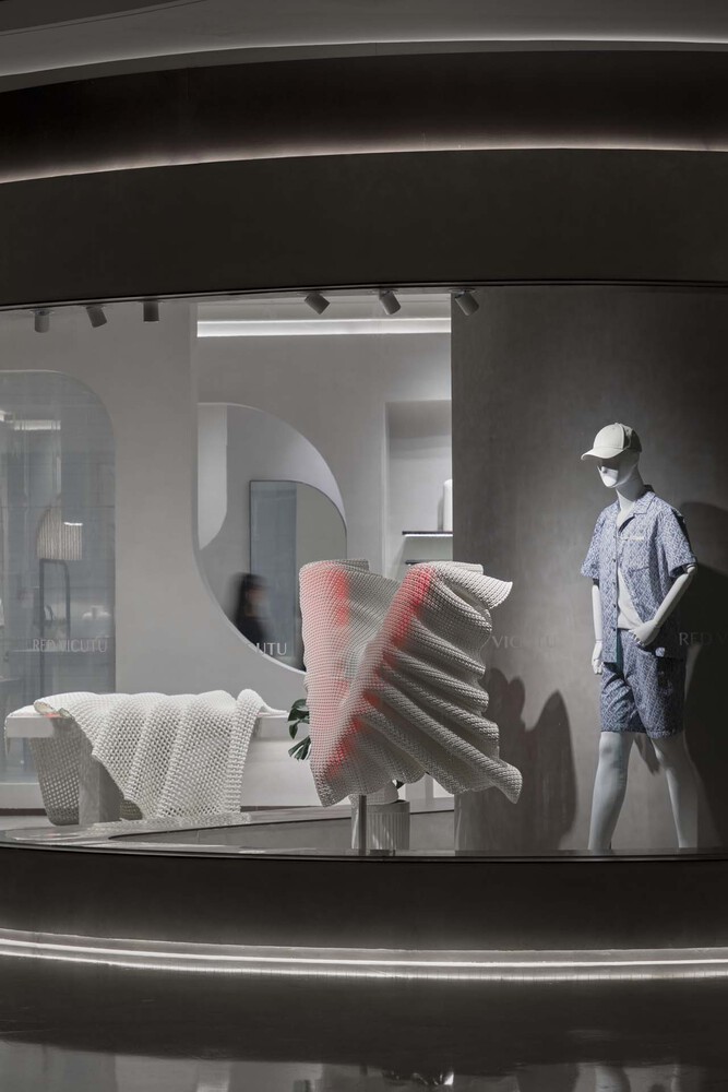 全新的威可多红标空间以一种简洁优雅的线条与复杂的参数化生成,创造了一种多样性与戏剧性的平衡。这是受到时尚行业双重特性的启发,特别是威可多服装品牌属性的启发。新形象店面推出的服装也体现了这种双重性,是一款既具有精致男装的属性,同时具有运动休闲属性的服装系列。根据品牌方对产品的意图,该空间的设计利用曲线形式来阐述并推广产品运动多样化的属性;采用先进的纺织品动态模拟3D打印装置去创造空间中的点睛之笔。微妙的灯光和纹理细节在空间内创造了终极的精致,提升了顾客在线下亲临购物环境中的体验。