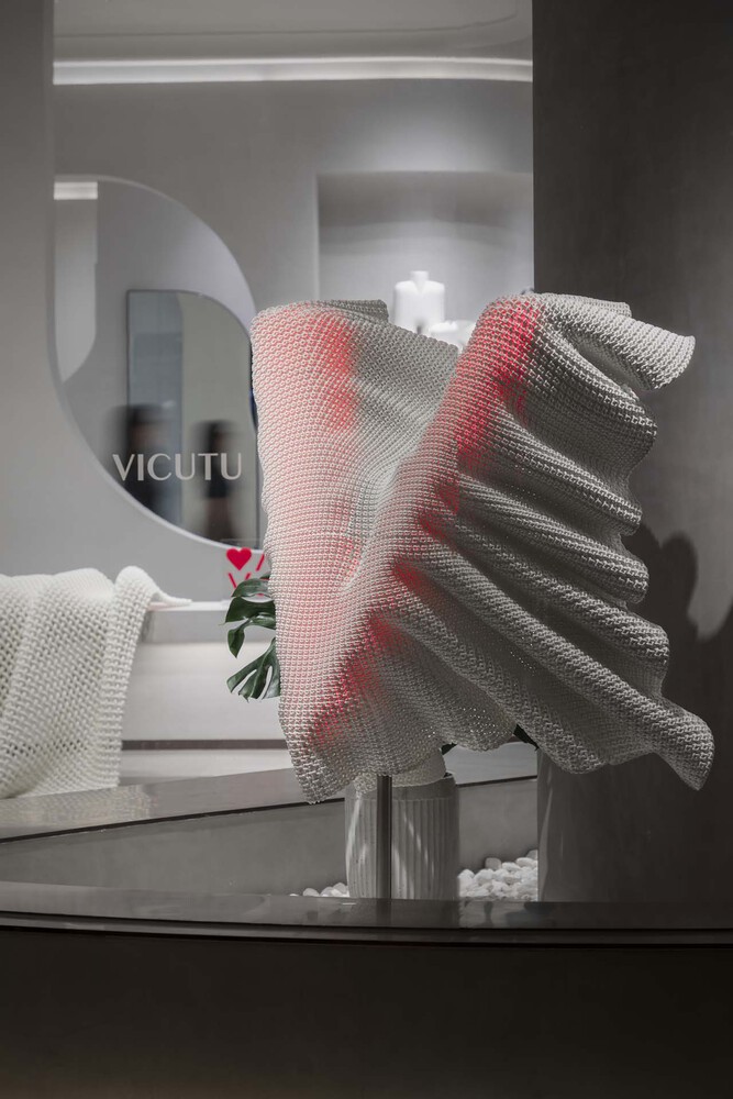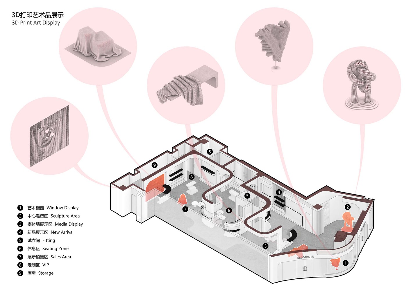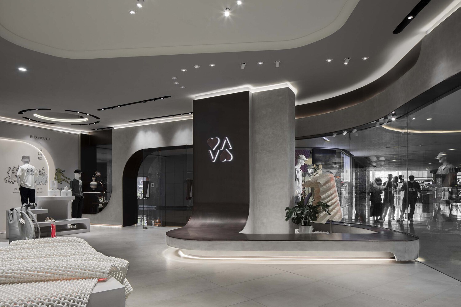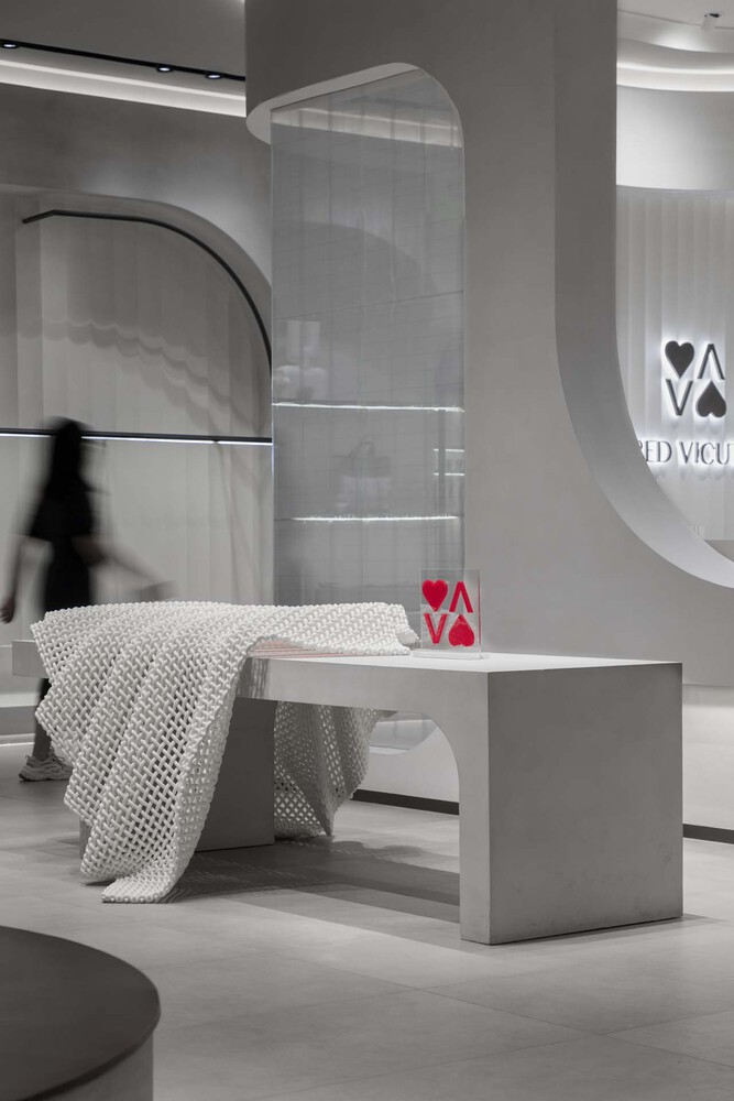 全新的威可多红标空间以一种简洁优雅的线条与复杂的参数化生成,创造了一种多样性与戏剧性的平衡。这是受到时尚行业双重特性的启发,特别是威可多服装品牌属性的启发。新形象店面推出的服装也体现了这种双重性,是一款既具有精致男装的属性,同时具有运动休闲属性的服装系列。根据品牌方对产品的意图,该空间的设计利用曲线形式来阐述并推广产品运动多样化的属性;采用先进的纺织品动态模拟3D打印装置去创造空间中的点睛之笔。微妙的灯光和纹理细节在空间内创造了终极的精致,提升了顾客在线下亲临购物环境中的体验。