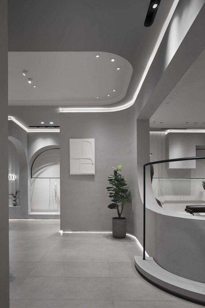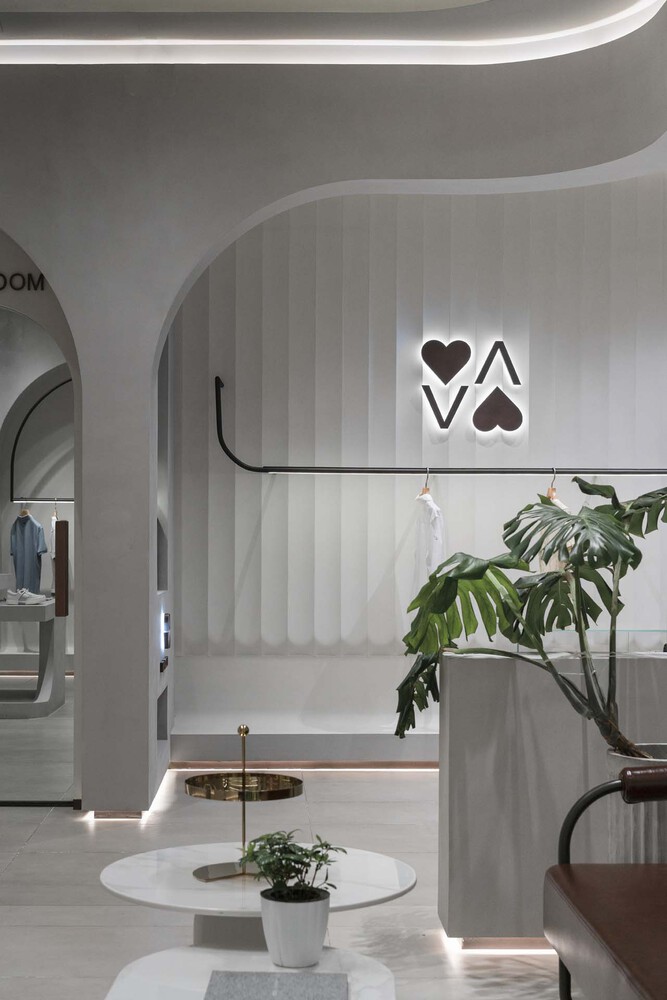 空间的最终细化在于对材料属性和肌理的关注,就像在时尚行业中,面料的选择、剪裁与布料的组装等,与服装的款式同等重要。在这个空间中,我们混合了材料,在表面的软感知和硬感知之间创造了一个平衡,类似于不同服装的制作。特定的展示服装的素水泥墙龛的和嵌入墙龛的金属挂杆细节类似于服装上的拉链、纽扣和缝线,定义了时尚的终极精致。灯光经过精心调节,以最好地表达这些材料,并增强店面中产品的感知,同时创造一个舒适和令人兴奋的空间。