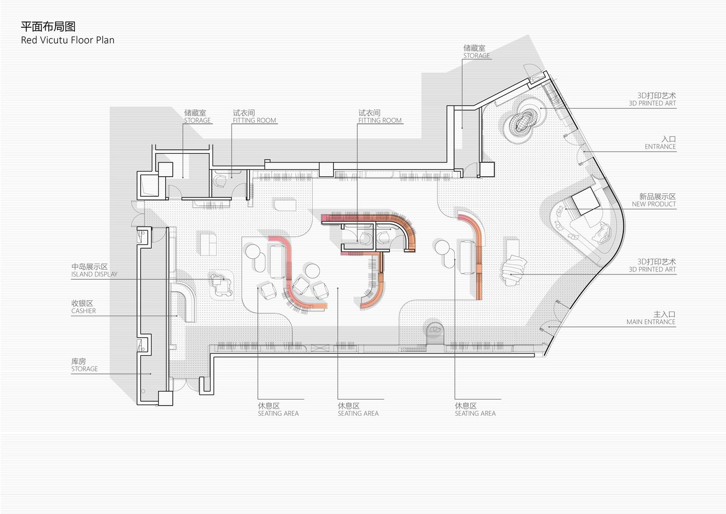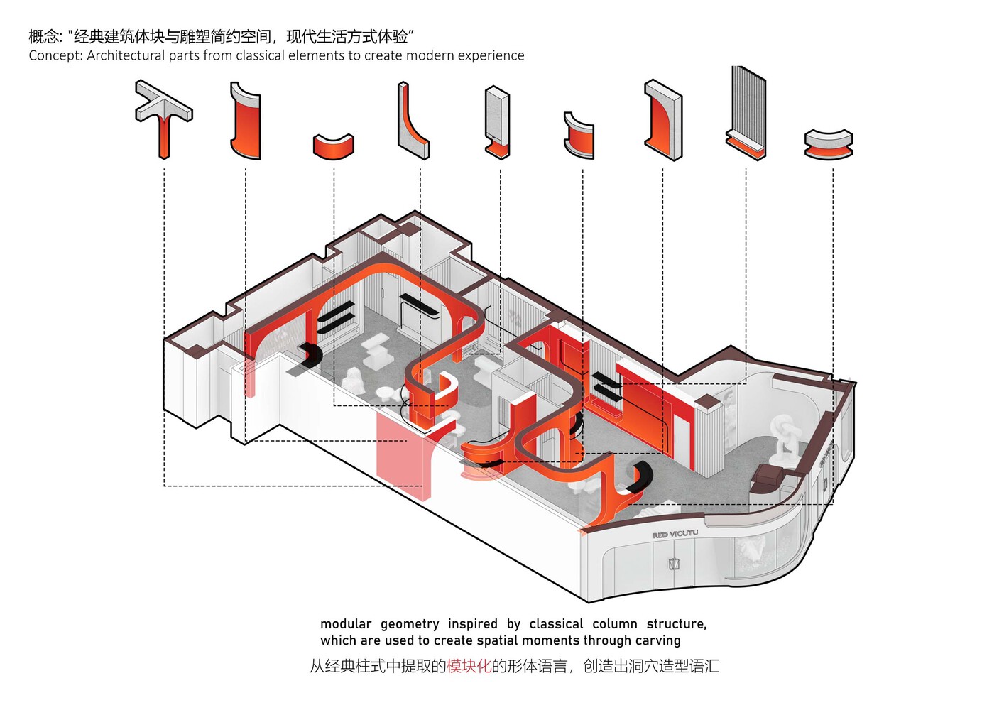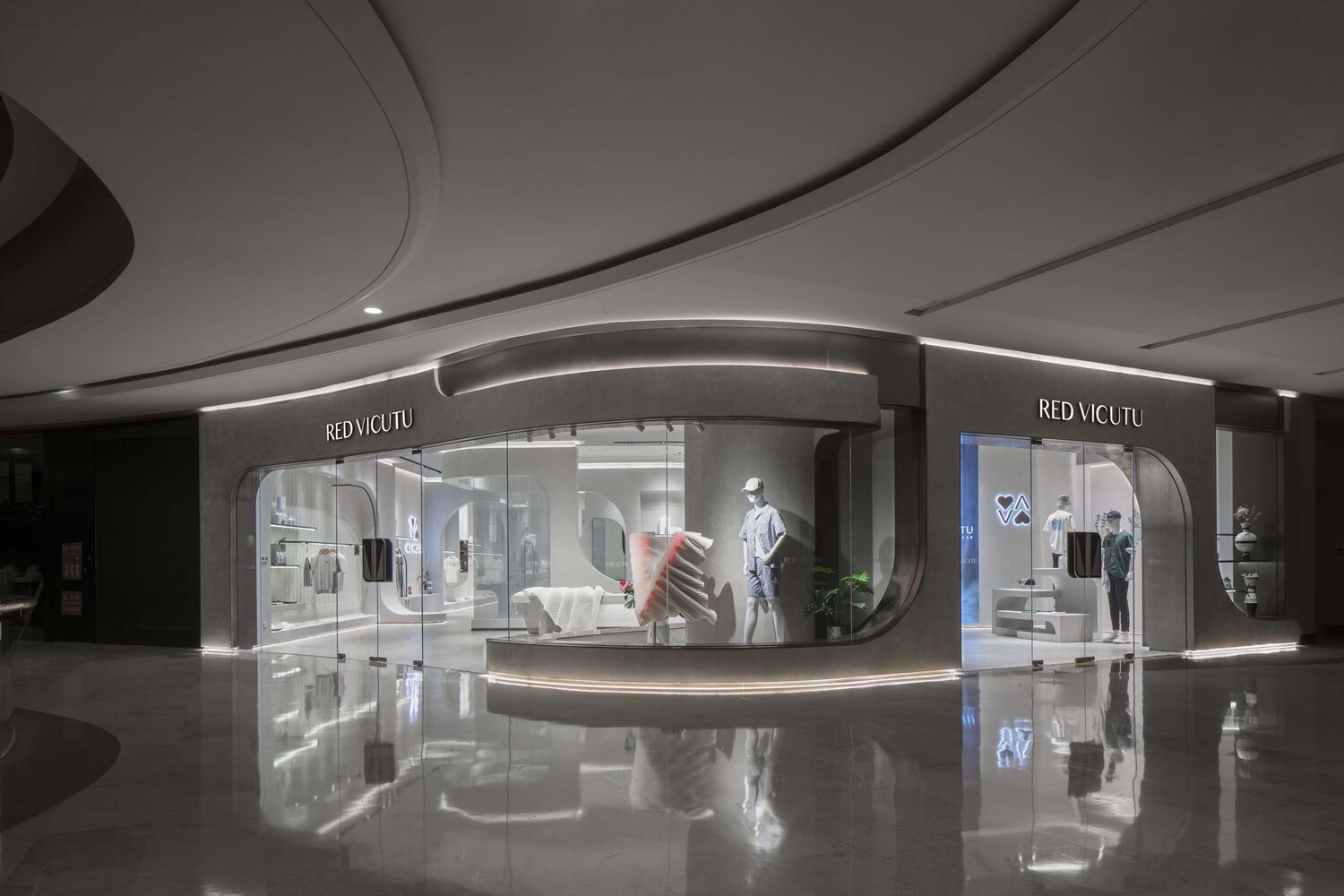 VICUTU红标零售空间超出了我们对传统服装店的预期,它从邻近的店面中脱颖而出,在更大的商场集合店中创造了一个有趣的场所。在线上零售时代,像这样的概念店将继续蓬勃发展,通过将顾客带入空间中体验,并用其手机镜头捕捉这种体验,那么随后上传到线上平台分享这种独特体验是引流并提升品牌知名度的重要途径。空间的细节、精致与创造力的程度将有助于通过线下亲身体验进一步提升品牌及其线上零售的形象,这是一种探索新零售在线上店与实体门店共存的时代中意味着什么的新方式。