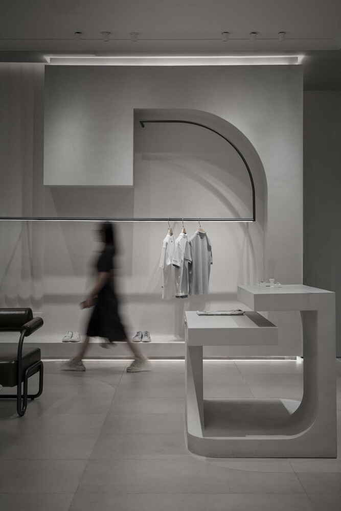 通过创造连续的造型,线条与曲线,来定义零售空间去鼓励顾客的视觉在空间中有趣味地游走。 当眼睛追踪并连接明显的与隐藏的几何图形时,顾客会被其中展示的时尚品牌的服装系列所吸引。 观者通过确立建筑空间中模糊的边界与连续性,其行为成为产品的策展人与叙述者,不仅仅是展示产品而是将其安排在一个鼓励沉浸式地参与体验的空间结构中。