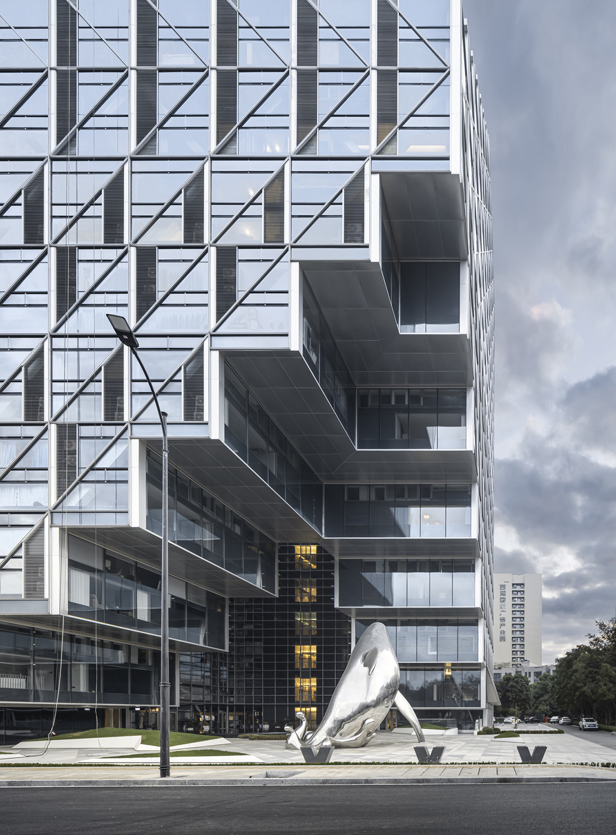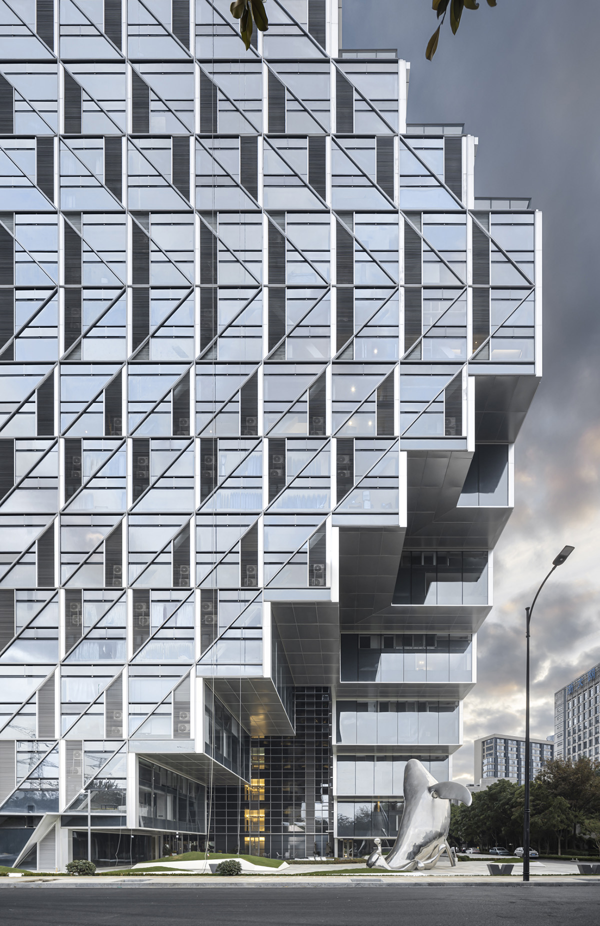 为了尽可能利用自然采光、通风及景观绿化,在分析城市空间和基地流线后,依据斜穿方形(东北-西南)的对角线,将建筑形体斜向切割3次:东北角主入口斜切面、西南面上层退台斜切面以及下层贯通内部中庭和河道景观的灰空间斜切面。纯粹的几何体切割,使建筑较好的融合了整个城市界面,同时X形的聚合立面又保持了新型办公建筑的独立性格。