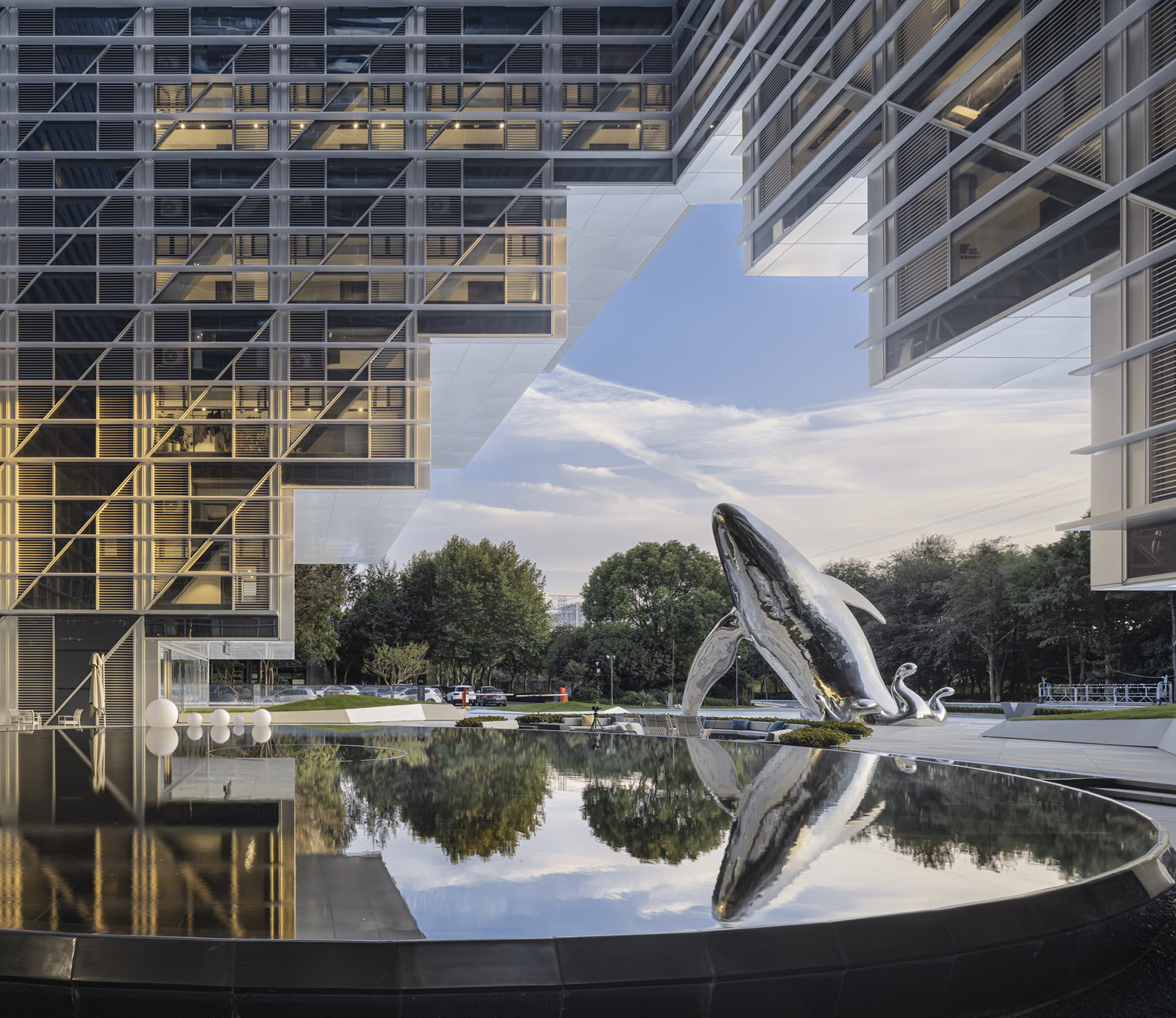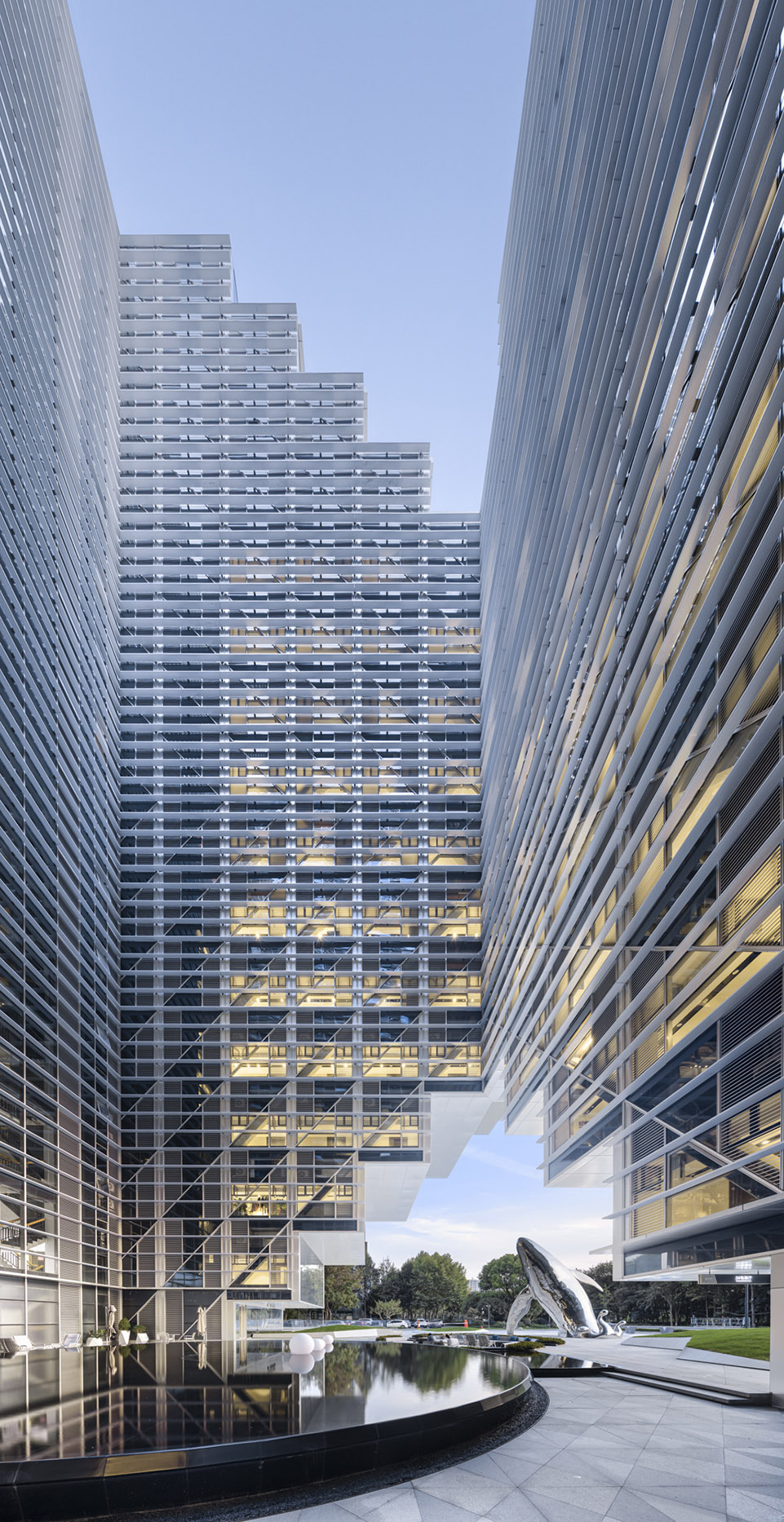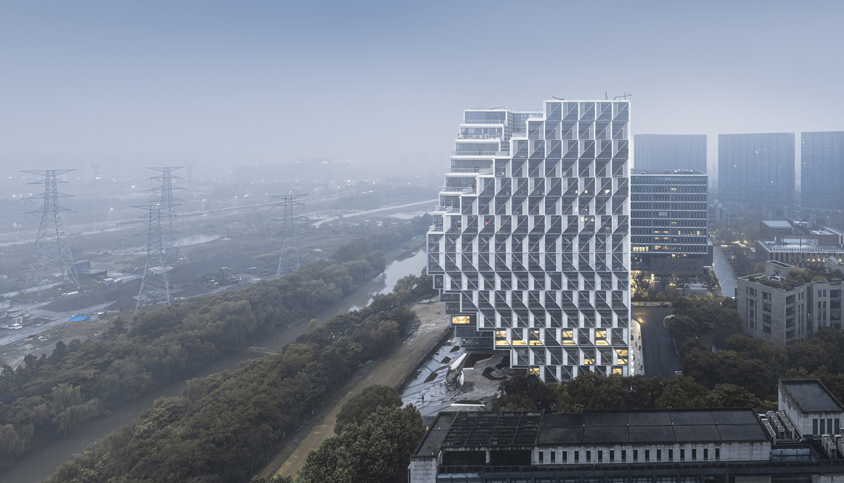 设计师在前期调研中细致地观察了场地不同时段的日照,兼顾考虑到杭州夏、冬两季的季风主导风向。在环境可持续表达上,西南角上下两组开口显著增强了大楼的内院的自然通风效果,提升舒适性的同时节能环保。河道景观顺着小广场景观被引入中庭、层层退台及室内,视觉上将建筑内的空间与周围的自然联系起来,从而形成“滨河绿谷——地面绿带——中心庭院——景观露台”的立体化景观。