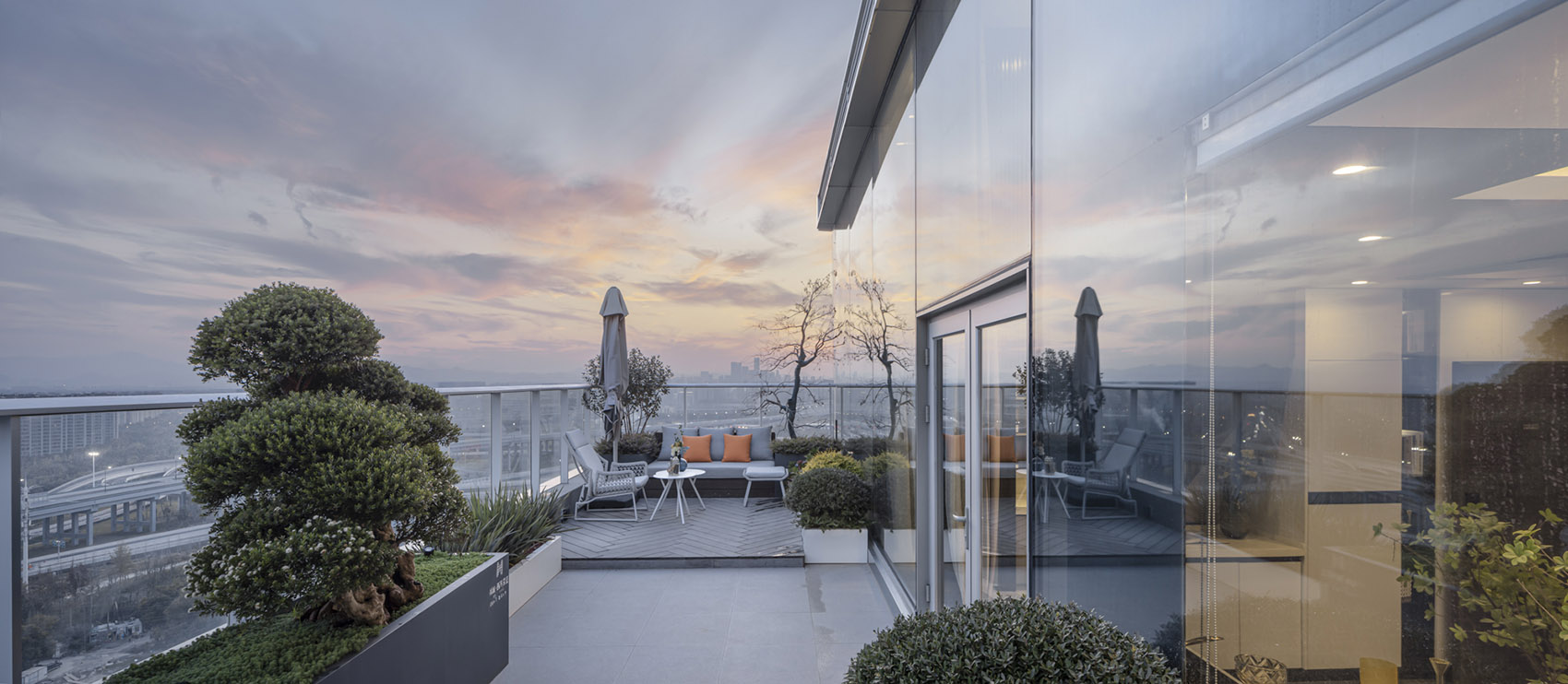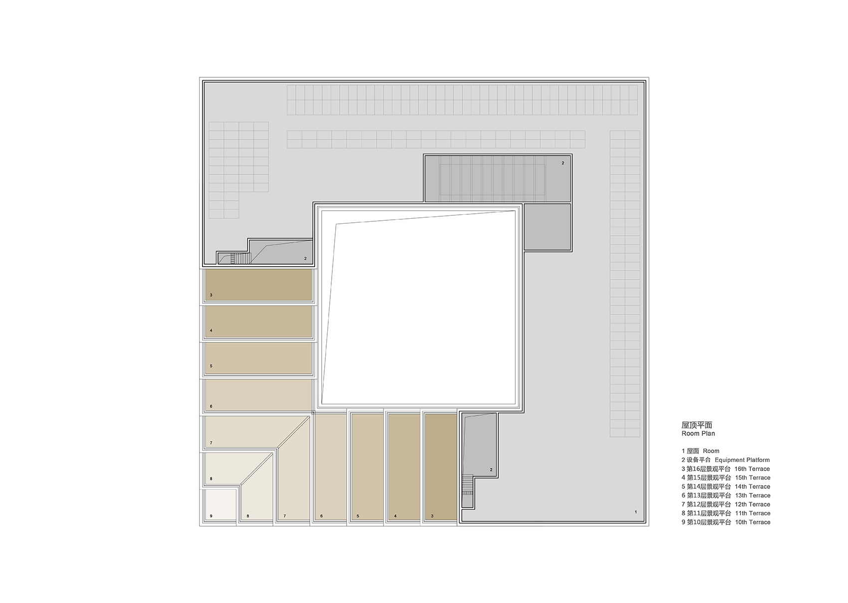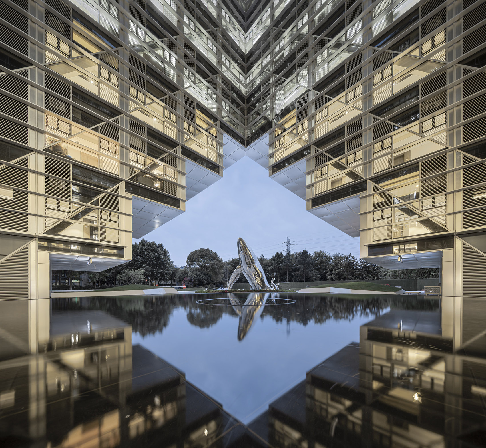 设计师在前期调研中细致地观察了场地不同时段的日照,兼顾考虑到杭州夏、冬两季的季风主导风向。在环境可持续表达上,西南角上下两组开口显著增强了大楼的内院的自然通风效果,提升舒适性的同时节能环保。河道景观顺着小广场景观被引入中庭、层层退台及室内,视觉上将建筑内的空间与周围的自然联系起来,从而形成“滨河绿谷——地面绿带——中心庭院——景观露台”的立体化景观。
