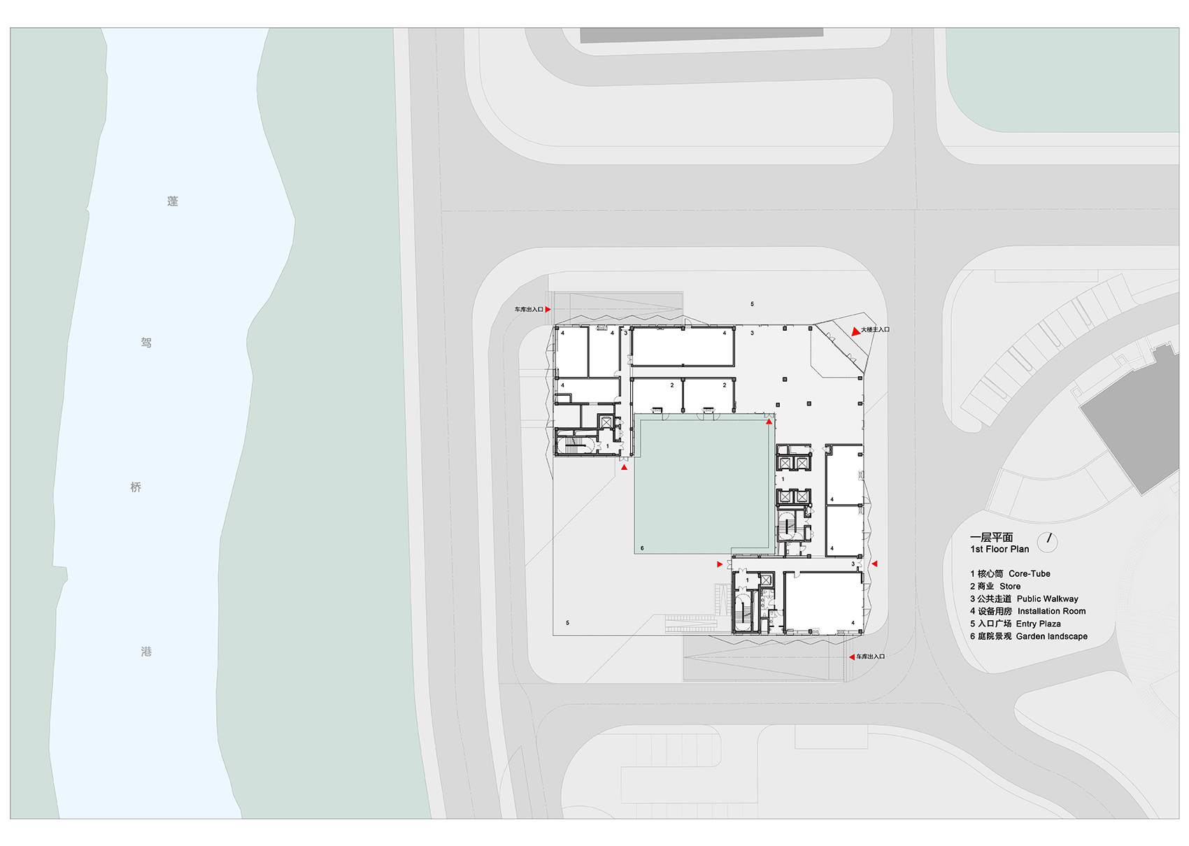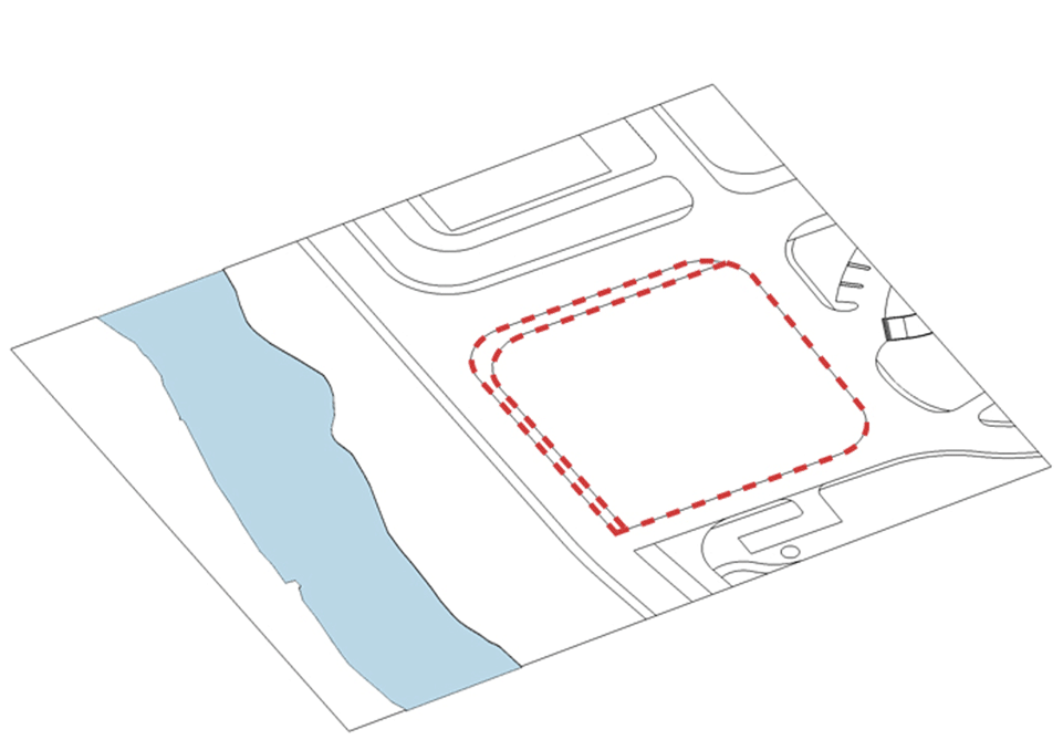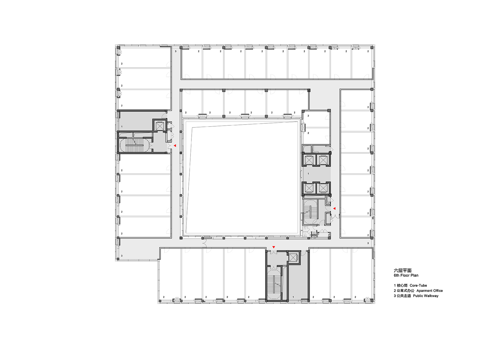 项目场地相对方正,西侧为清幽河道,三面毗邻不同类型、高度的办公建筑。作为二次委托设计,整体用地较为紧张,建筑密度也不得突破原方案。在充分考虑到平衡孵化类办公建筑的空间需求与心理需求的设计愿景,采用了独立办公空间和共享开放区域相结合的方式。独立工作空间向外,保证一定私密性;开放区域向内,形成一个更有利于交流共享的空间。