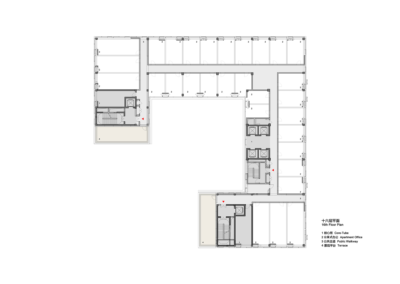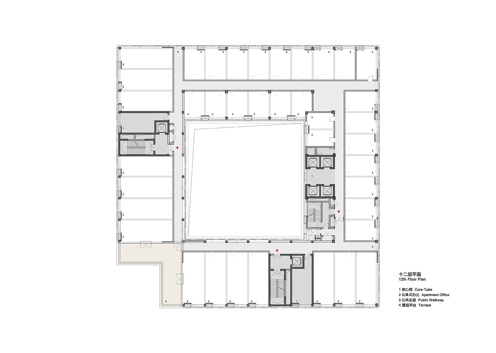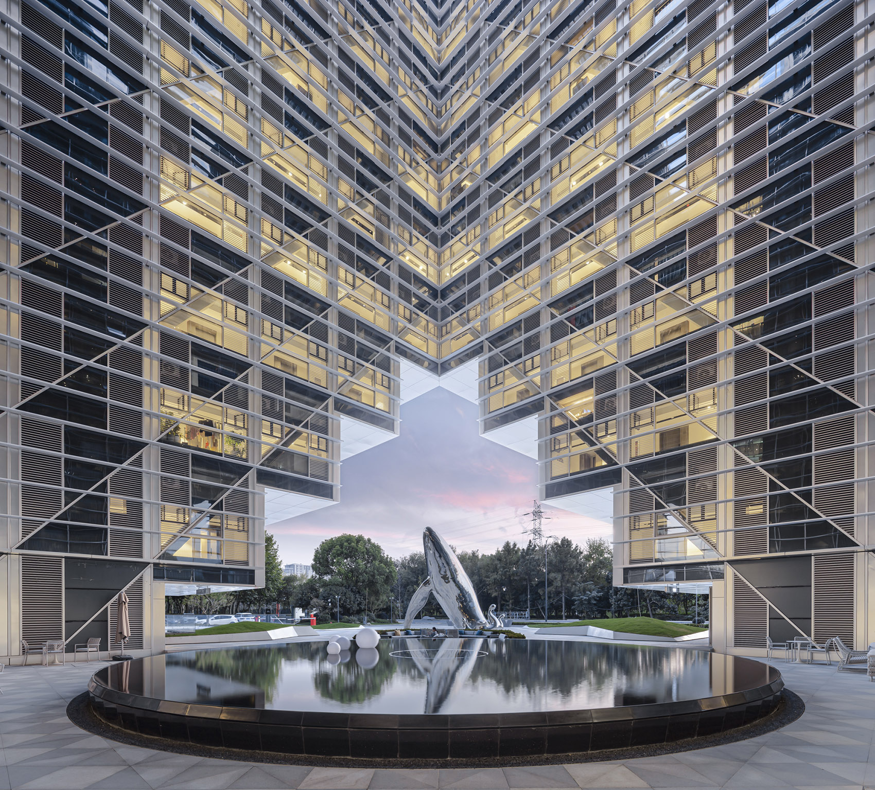办公单元设计为三种办公模块,具有统一的4.2m面宽、4.75m层高和不同进深,每个办公模块4.75m层高给客户提供了更多内部可变空间的可能。这些办公模块依靠单边走道或者内走道组合在一起,顺应X的造型结合空调机位,设计分别采用斜向幕墙单元和正交幕墙单元两种幕墙单元,创造出独特、干净的立面。