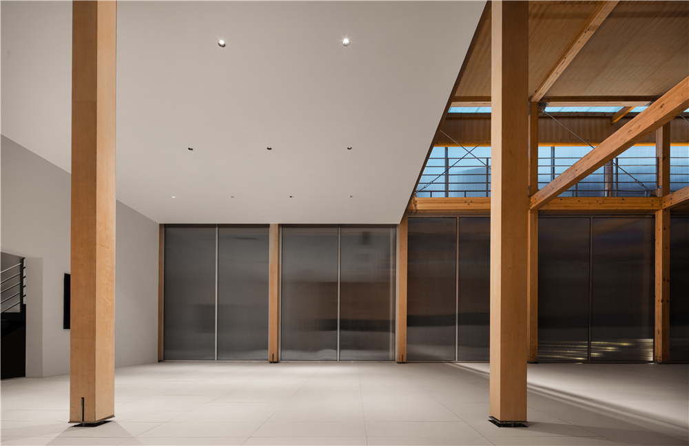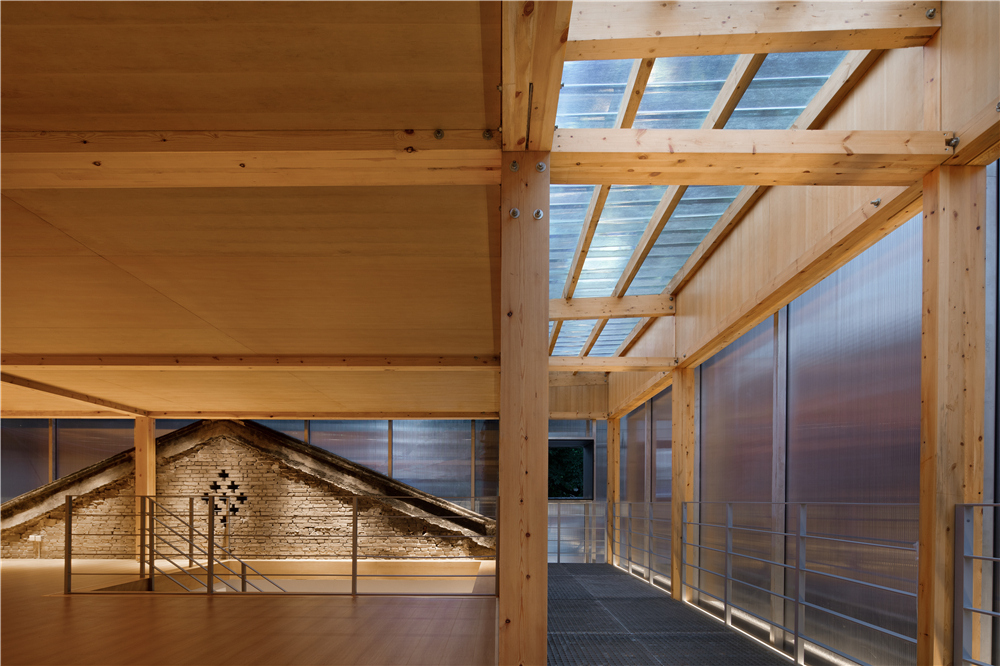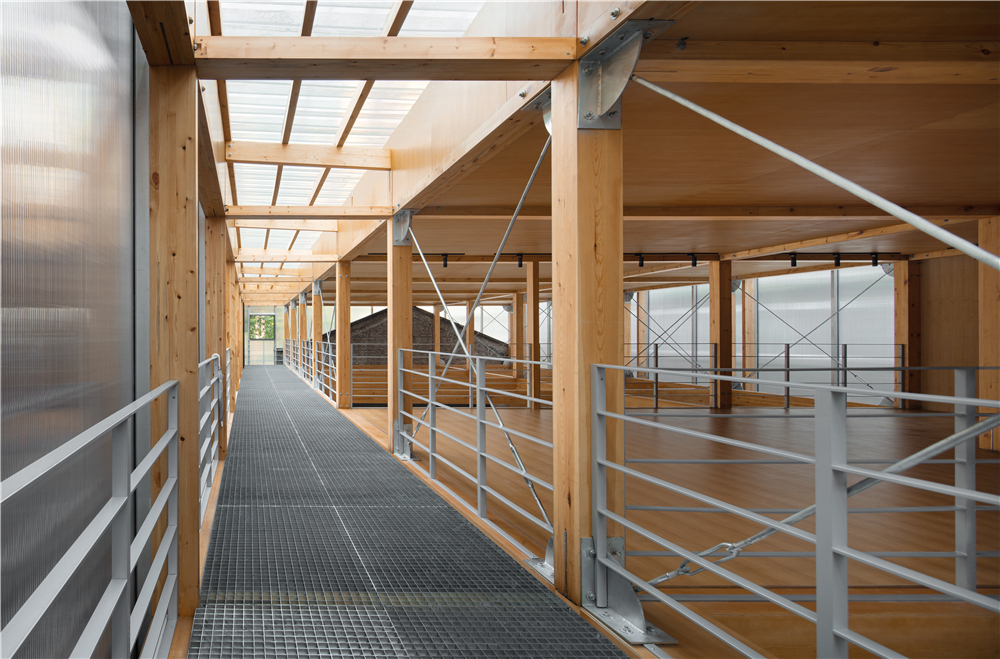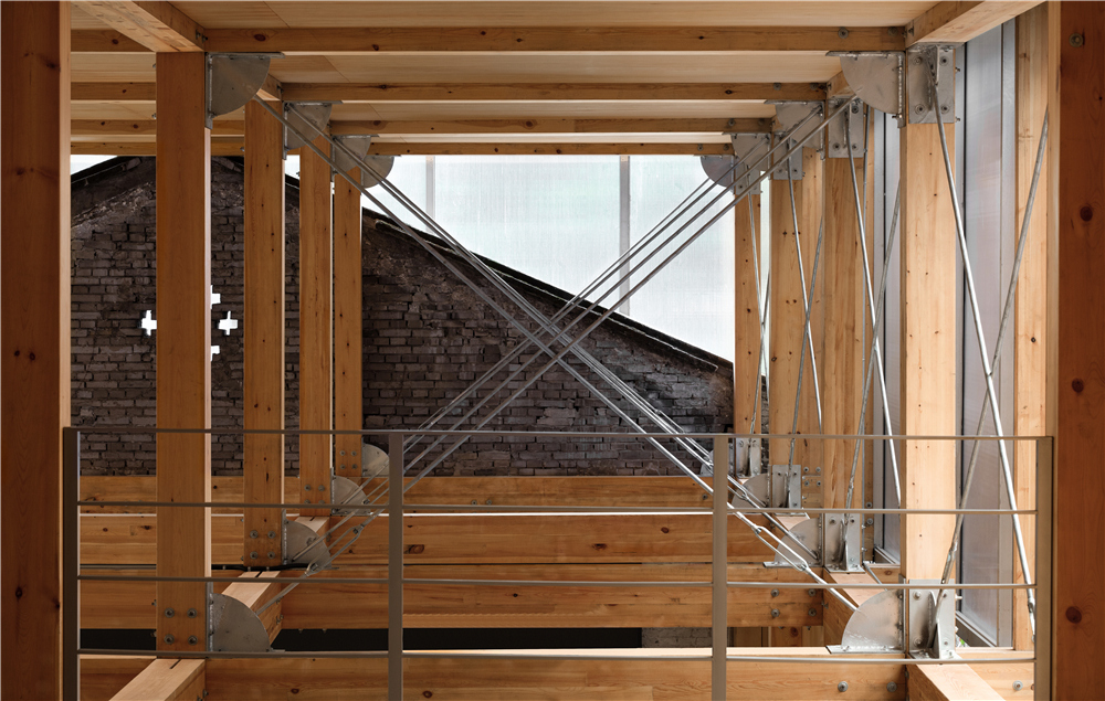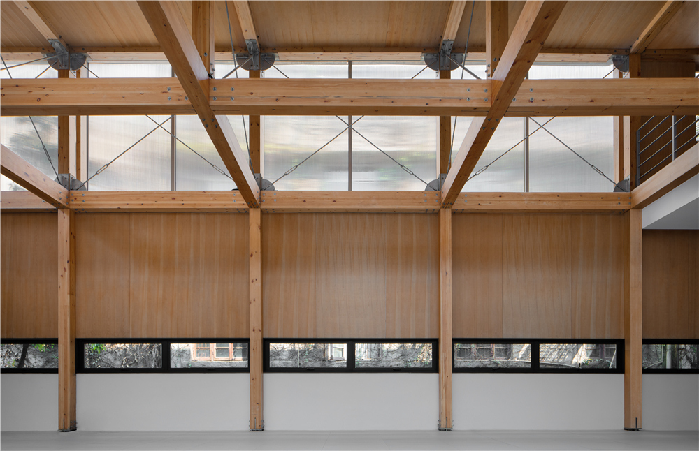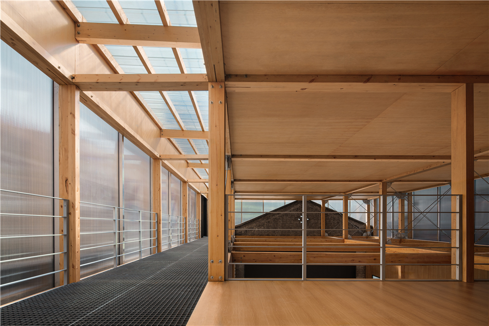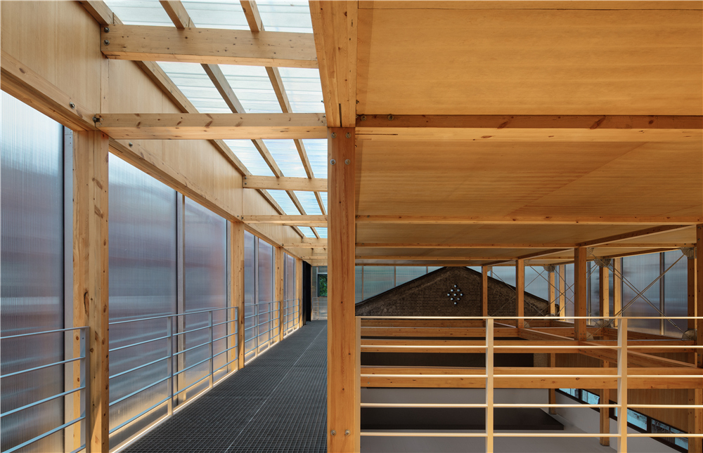 剧场的搭建我们主要使用了这几种材料:木材、钢架、阳光板、钢格栅,没有过多的钢筋混泥土的堆积,采用了木钢架结构,给人感官上的温馨。为了解决光源不是很充足的情况,在二楼侧面的连廊部分使用了钢格栅,希望透光到一楼地面,引进自然光。
