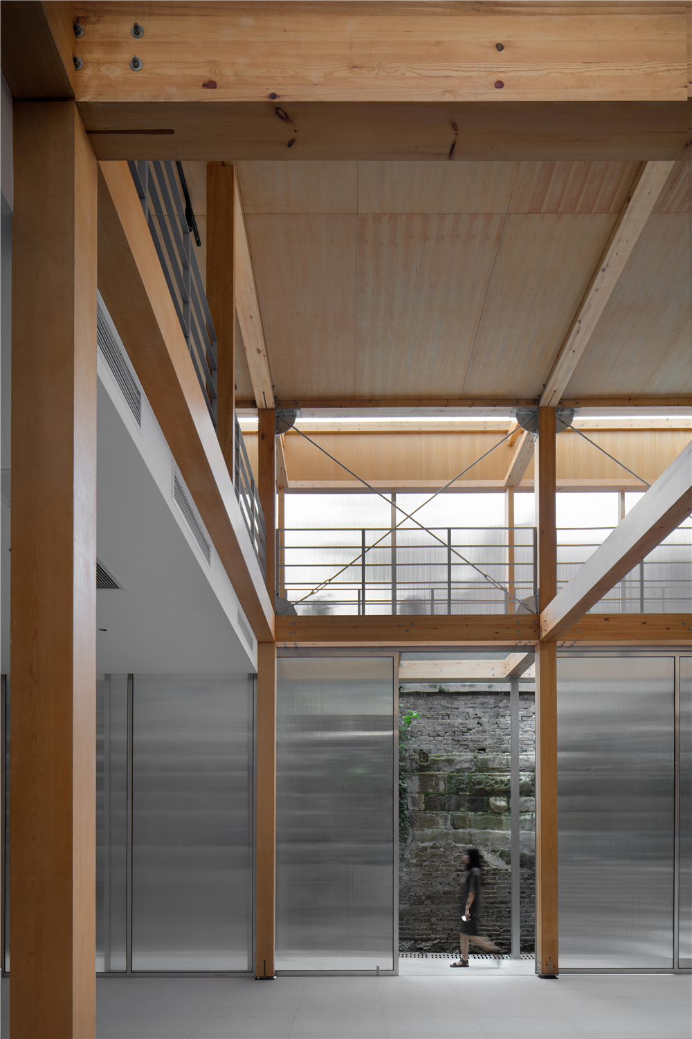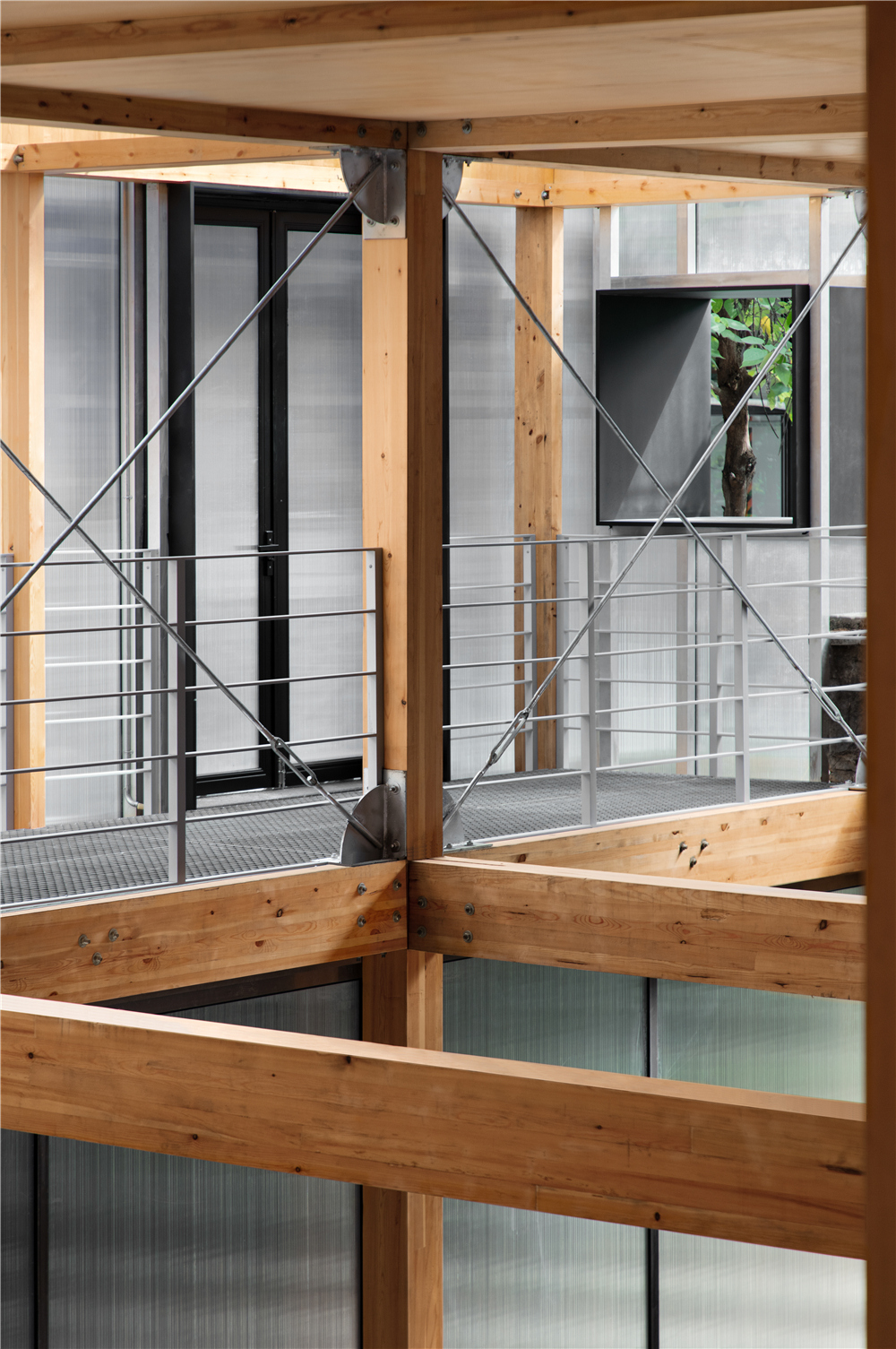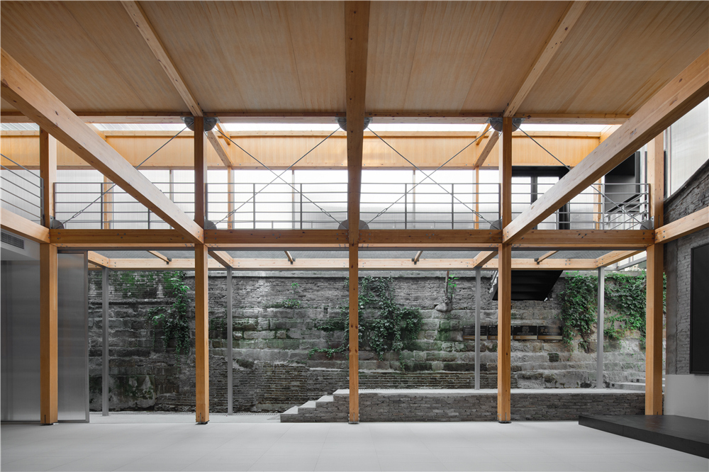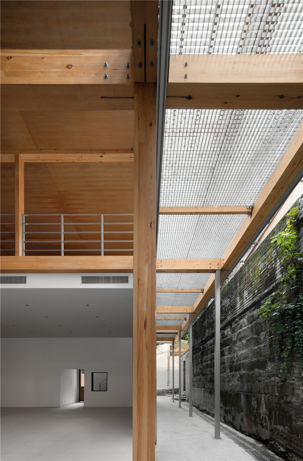剧场的搭建我们主要使用了这几种材料:木材、钢架、阳光板、钢格栅,没有过多的钢筋混泥土的堆积,采用了木钢架结构,给人感官上的温馨。为了解决光源不是很充足的情况,在二楼侧面的连廊部分使用了钢格栅,希望透光到一楼地面,引进自然光。