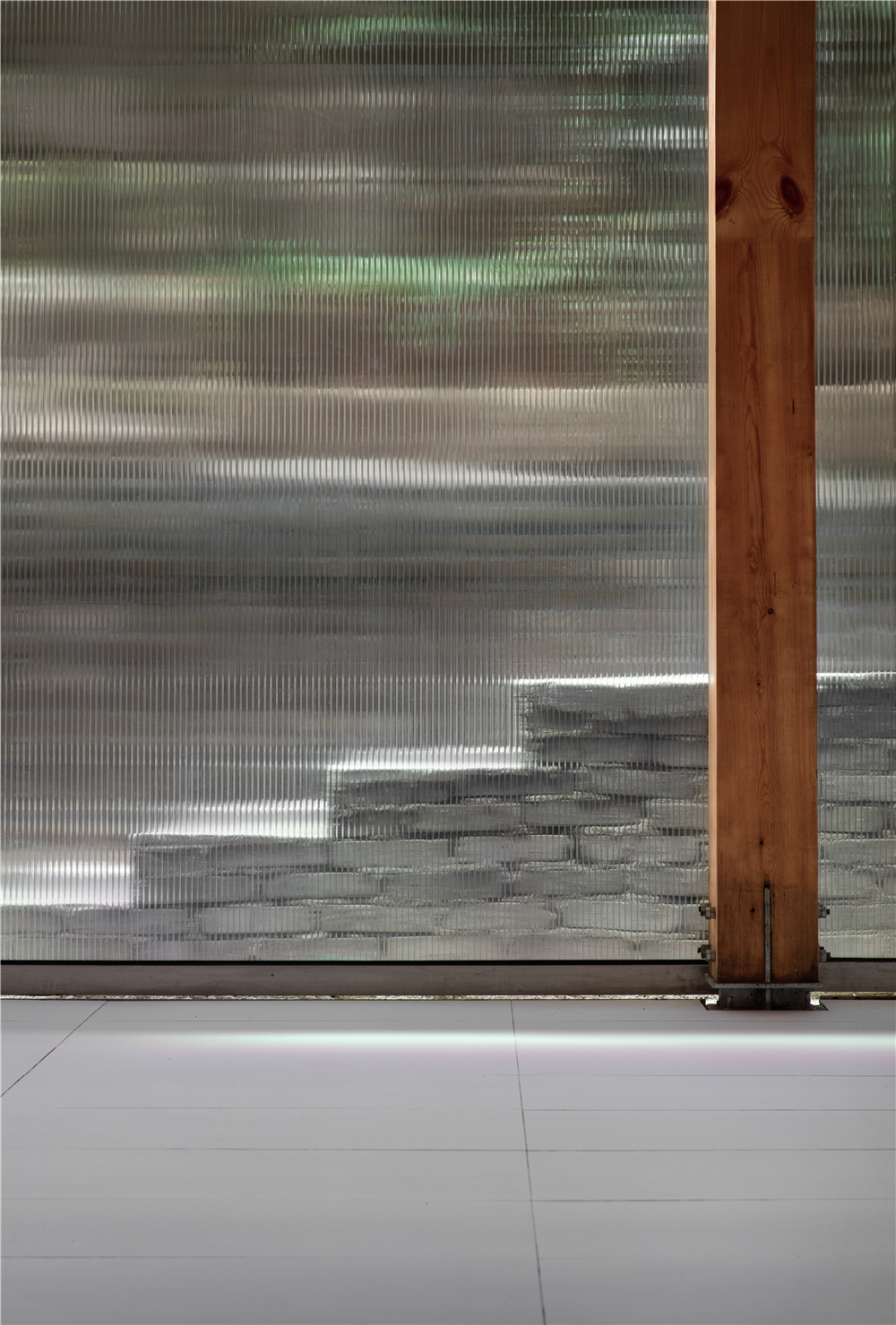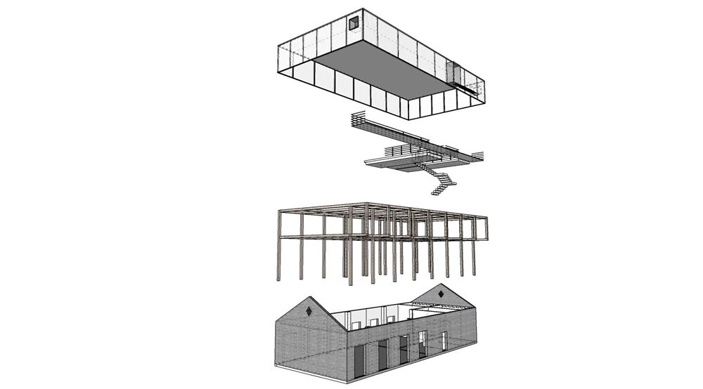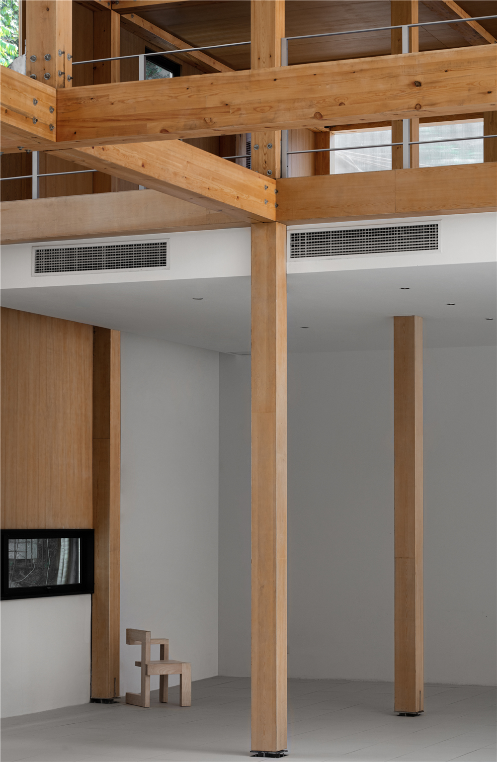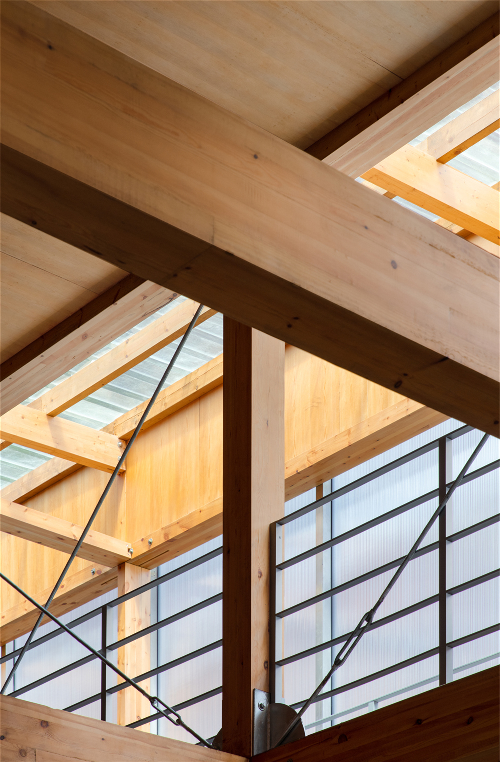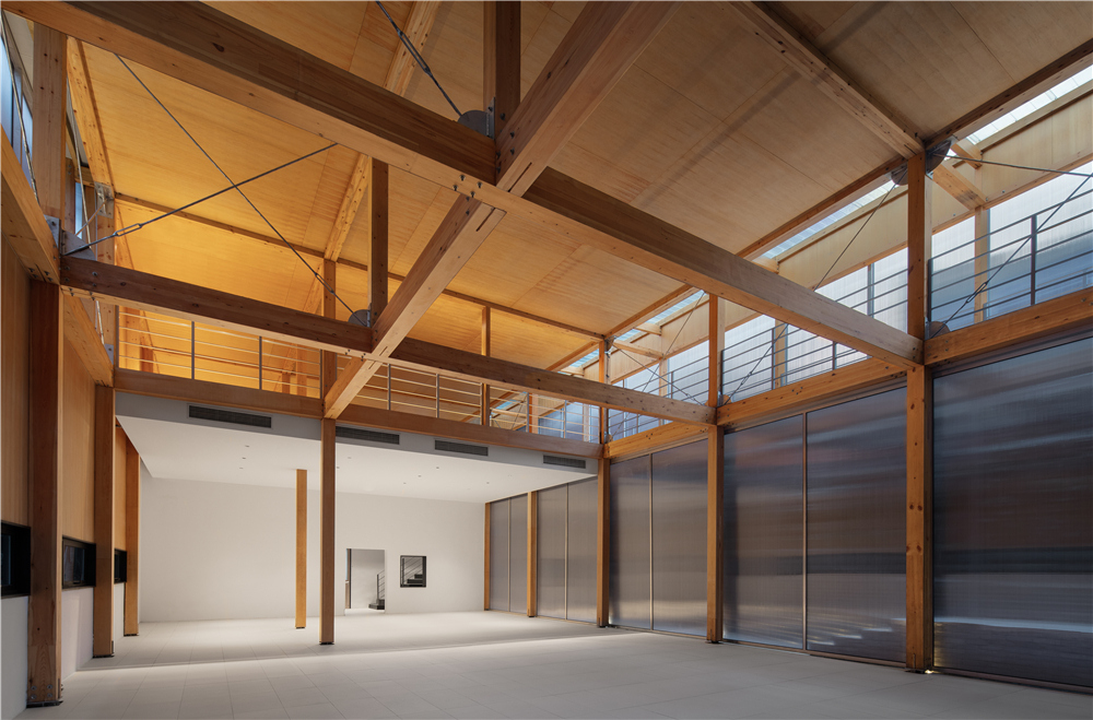 剧场的搭建我们主要使用了这几种材料:木材、钢架、阳光板、钢格栅,没有过多的钢筋混泥土的堆积,采用了木钢架结构,给人感官上的温馨。为了解决光源不是很充足的情况,在二楼侧面的连廊部分使用了钢格栅,希望透光到一楼地面,引进自然光。