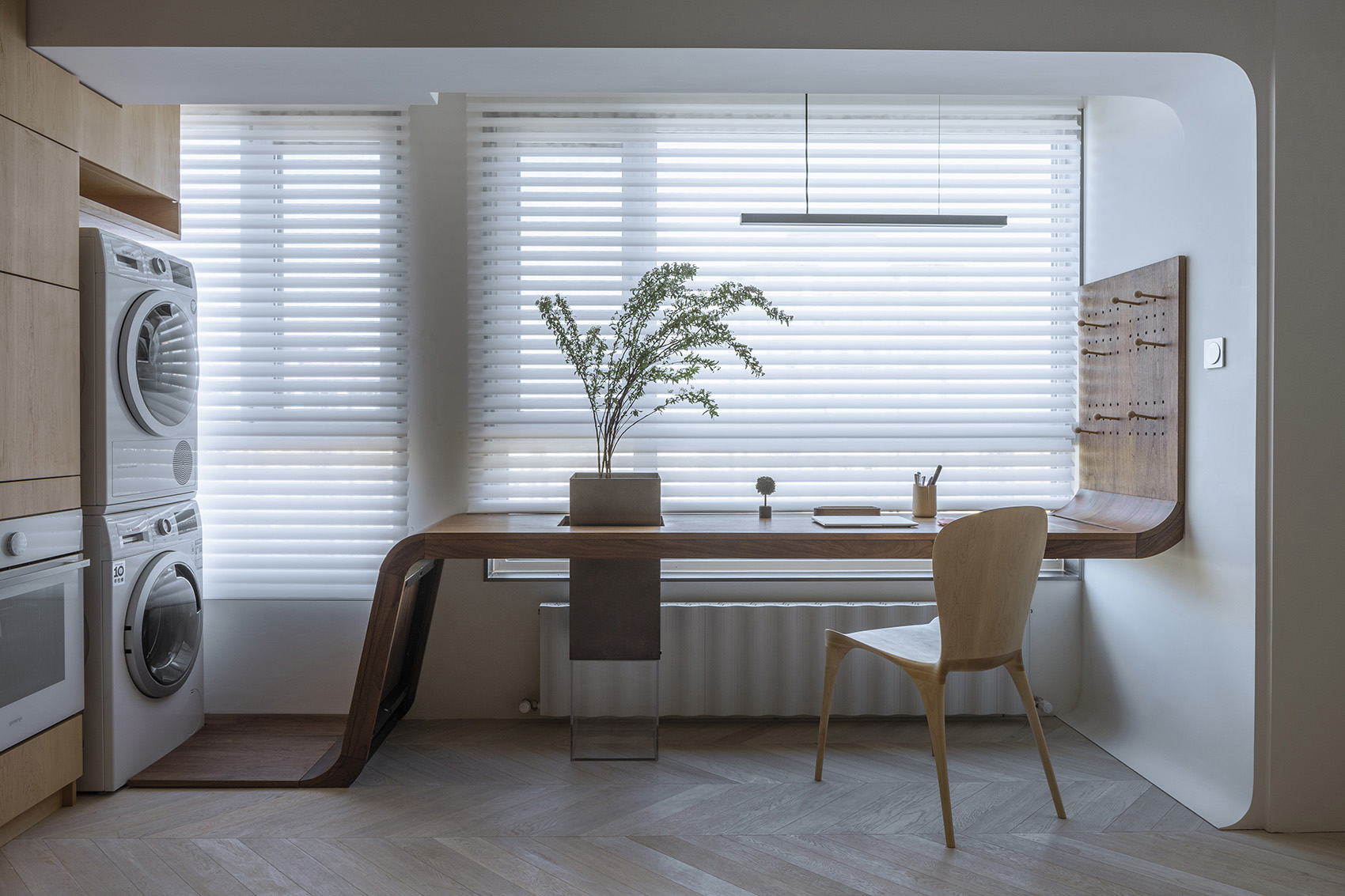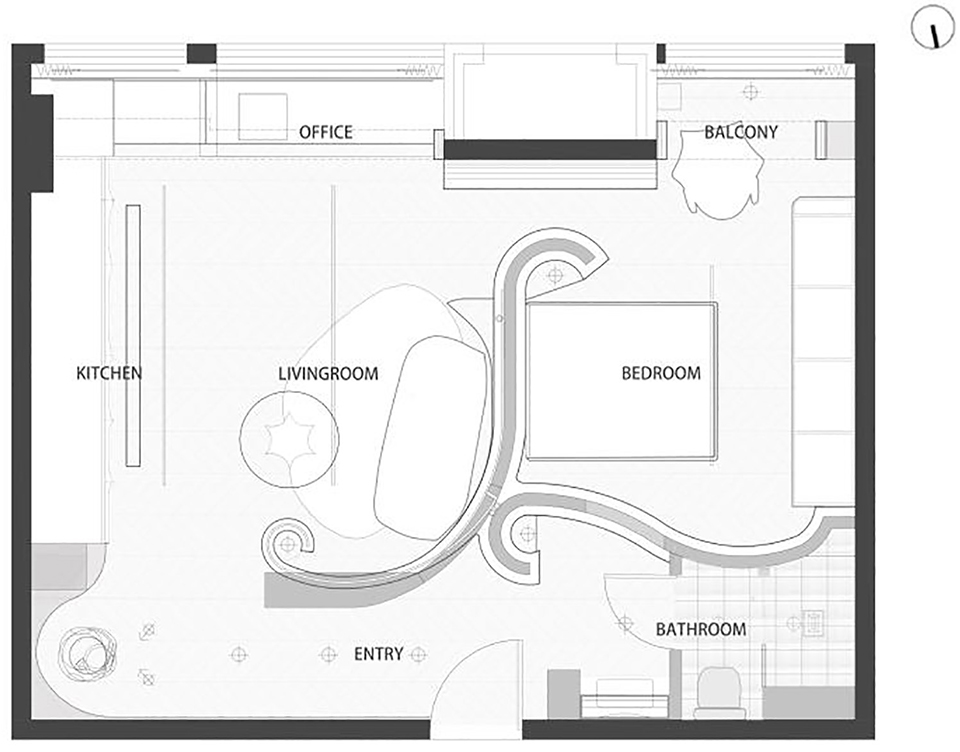 本案在空间中生长两个S型曲线用来构筑墙体,完成了对空间的基本分割,最终实现整屋建立起秩序,事物各就其位。