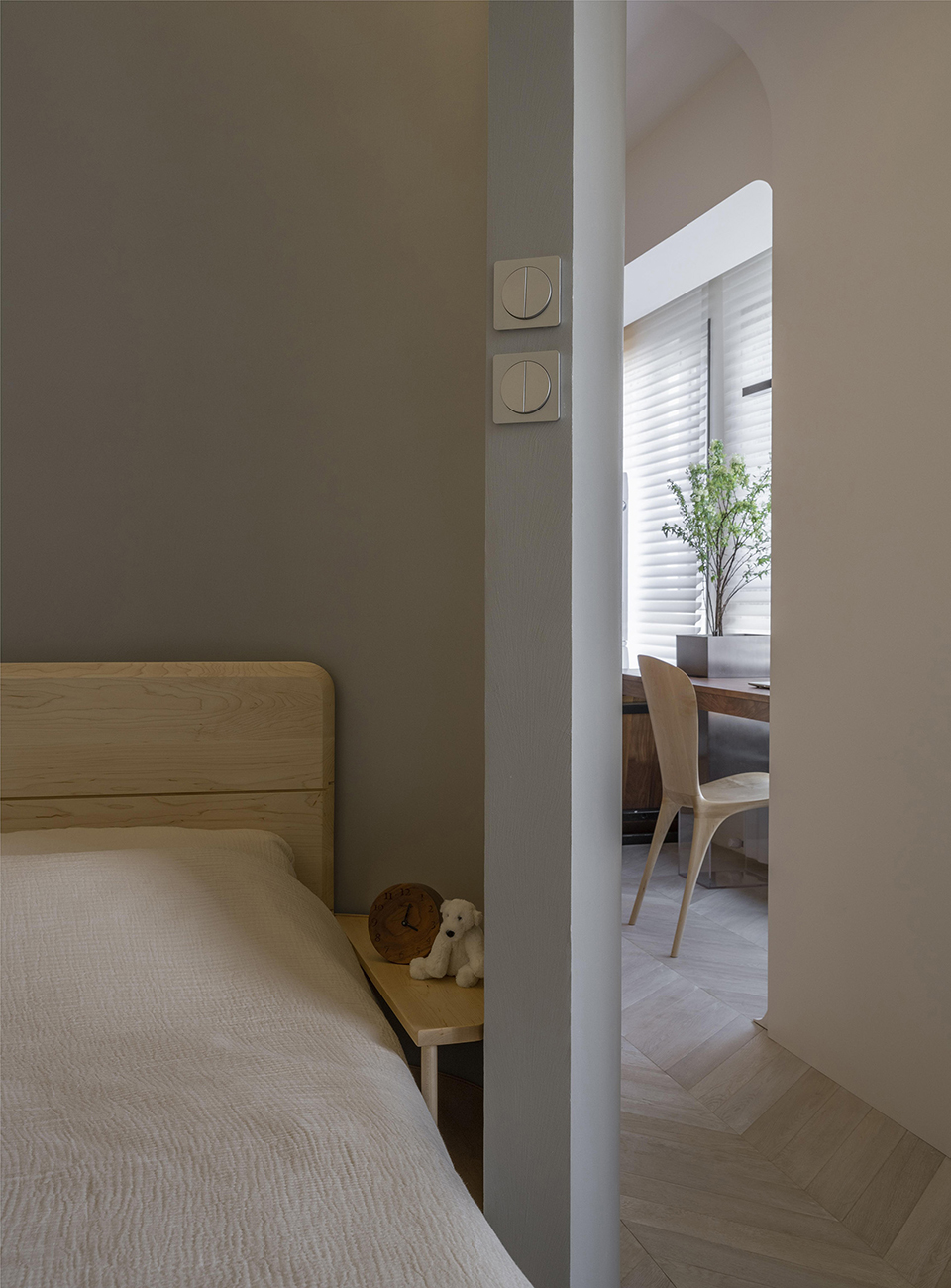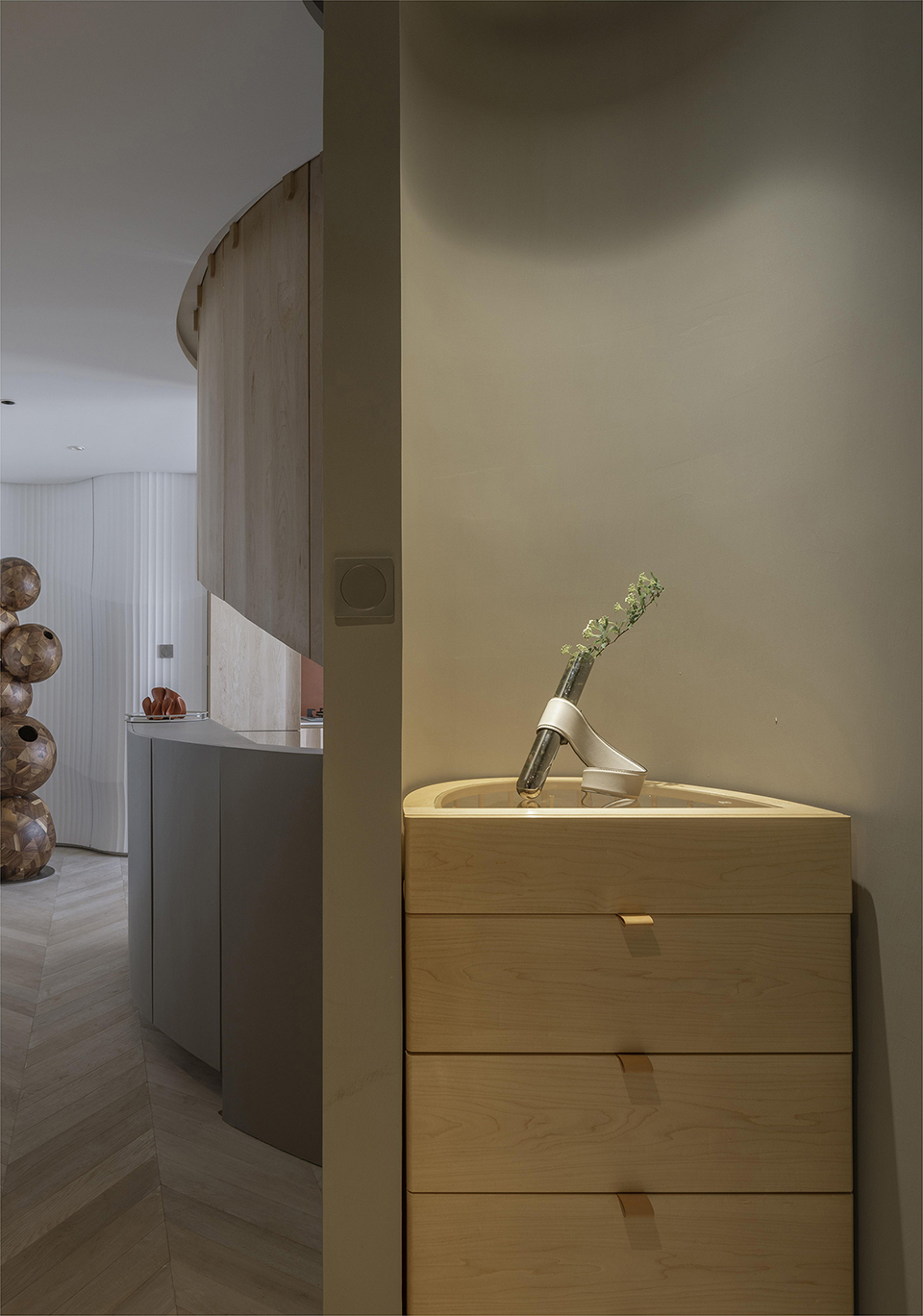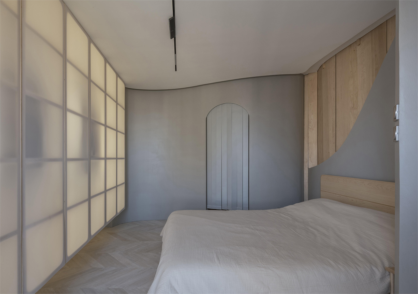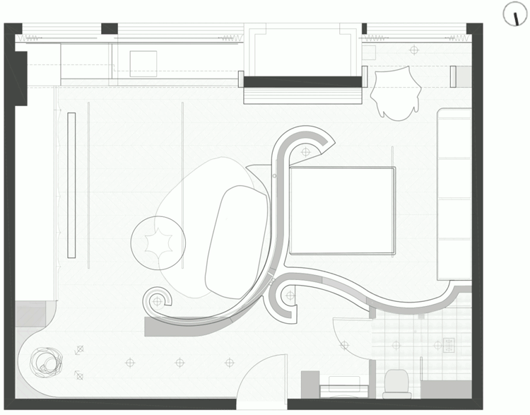 曲线墙体的位置走向是依据现有情况和各功能空间的需求进行生长,其凹与凸都是服务于具体功能需求,将壁龛、首饰柜、床头柜、鞋柜、书架等功能集合到了曲线墙体内。