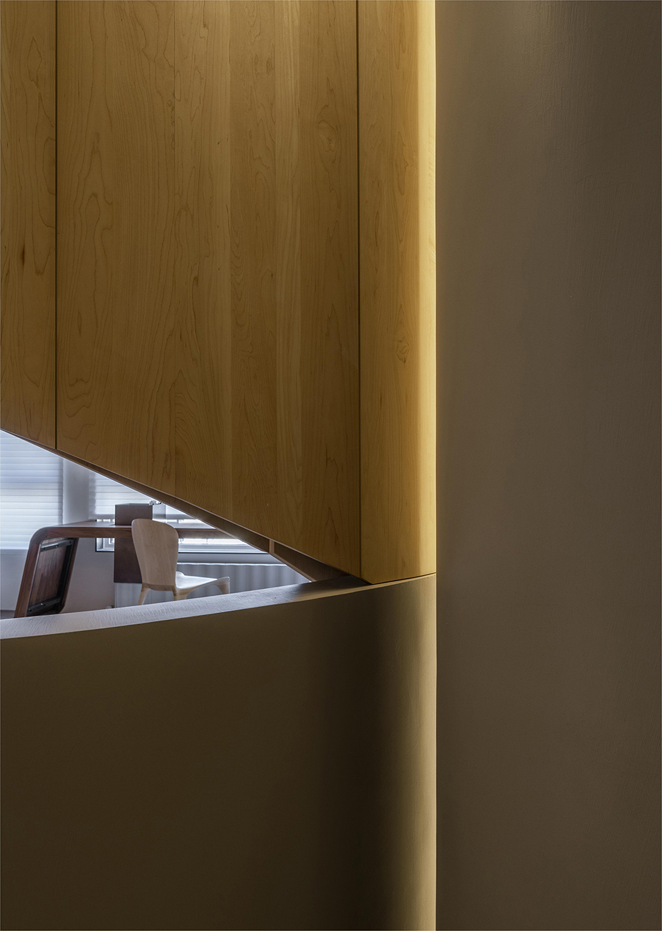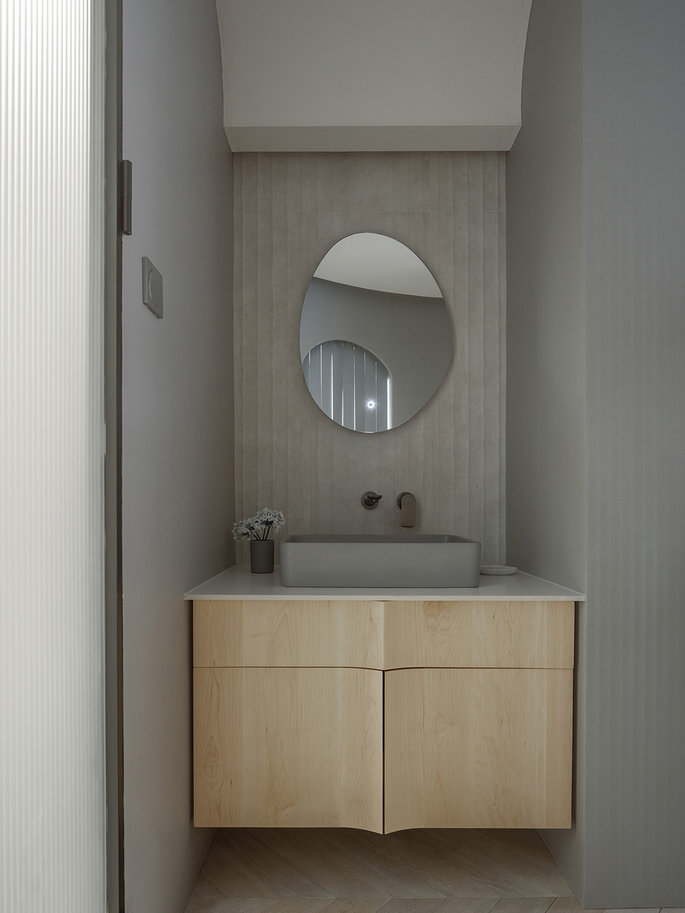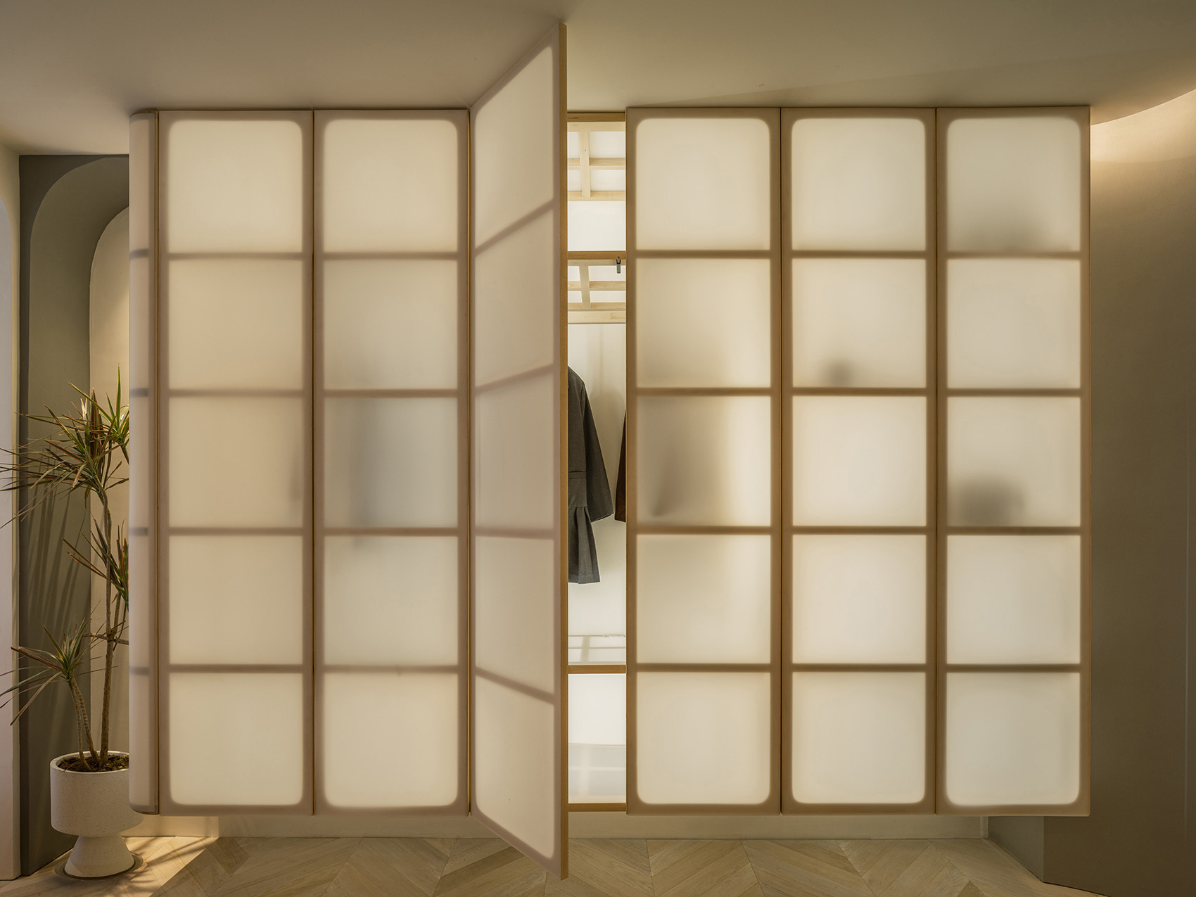 卧室空间的衣柜使用半透明亚克力材质,进行悬浮处理后仿佛是一面消失的衣柜,减少卧室空间的压迫感。 卫生间采用三分离,手盆外置,手盆上部的弧线从天花落下呼应了Stoa空间。