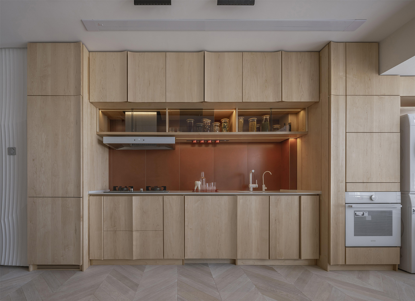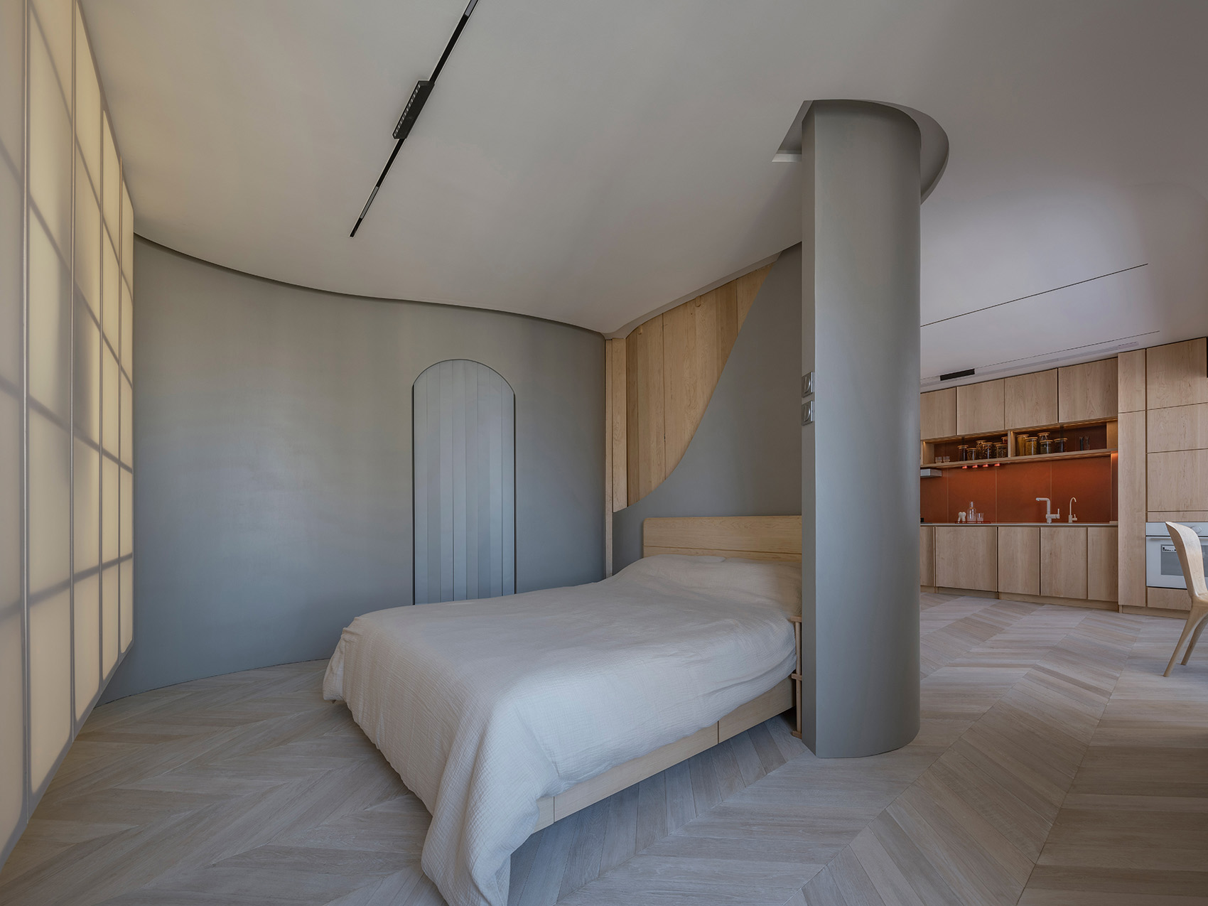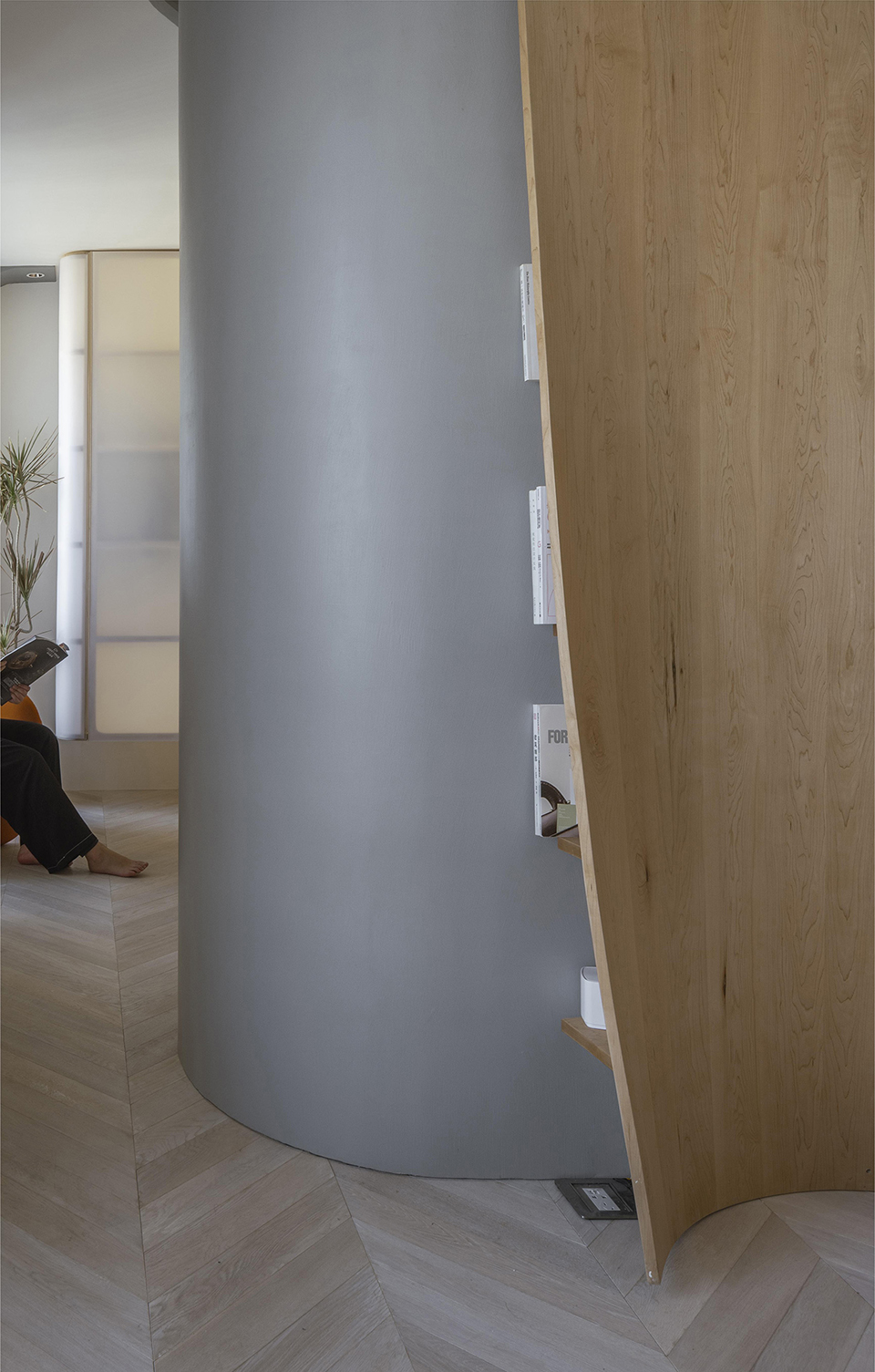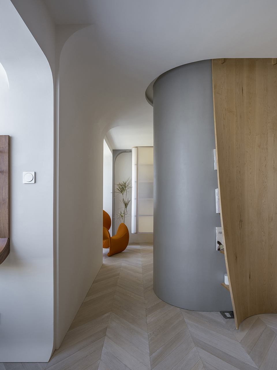 空间中只卫生间使用了封闭的门,其他空间均未有封闭的门,致使各个空间之间形成互相的渗透。除了功能上的集合以外,曲面墙的弧线走向还很好地起到了空间之间过渡的视觉引导作用。曲线墙本身既作为空间的分割边界,同时也是空间中的一部分。