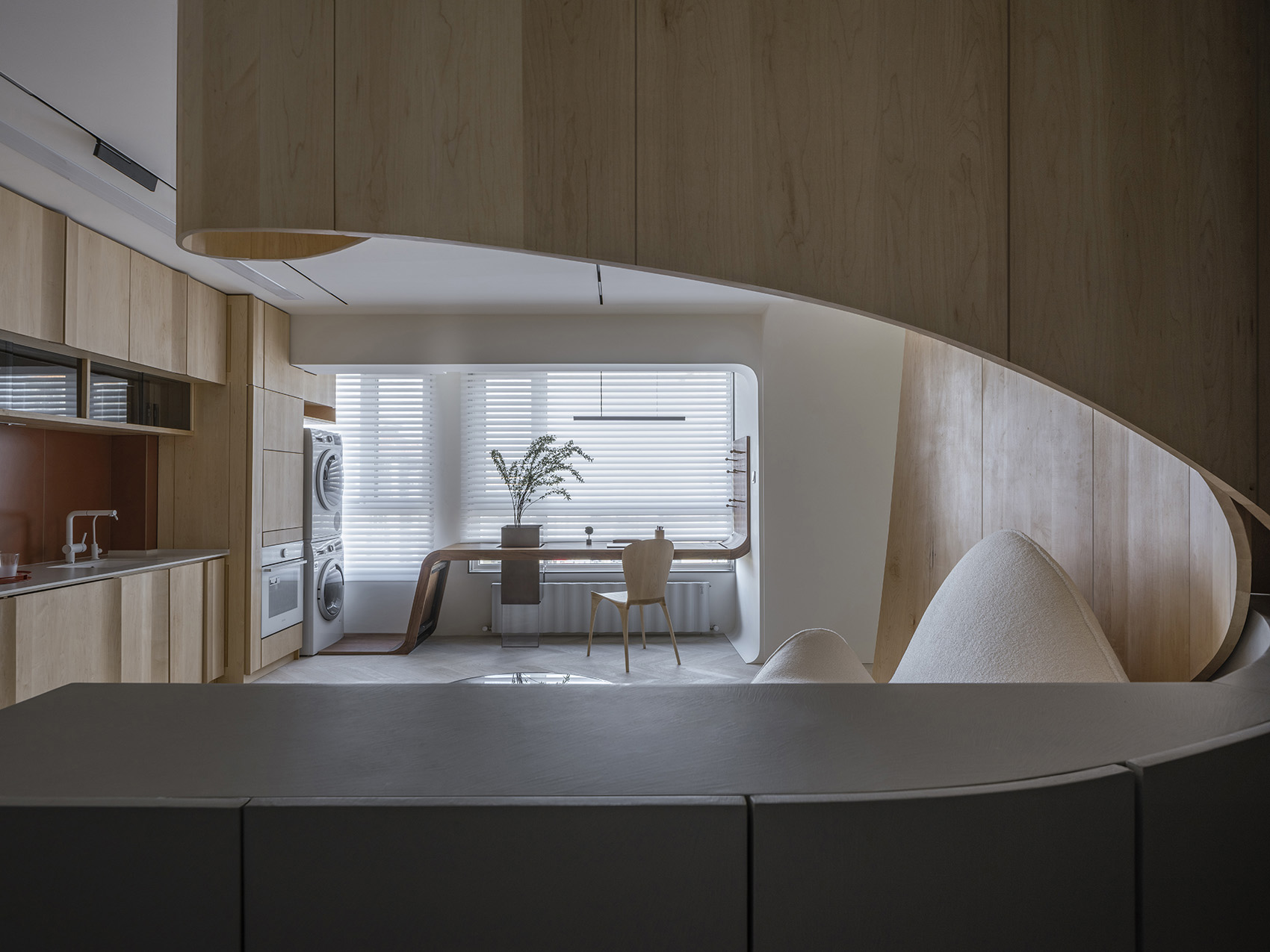 通过玄关就来到了由客厅、开放式厨房和书/餐桌组成的的复合空间,沙发放置于曲面墙构成的环抱空间,圆形茶几统领起整个空间,简洁和橱柜和窗户组成了主要的界面,宽敞明亮。