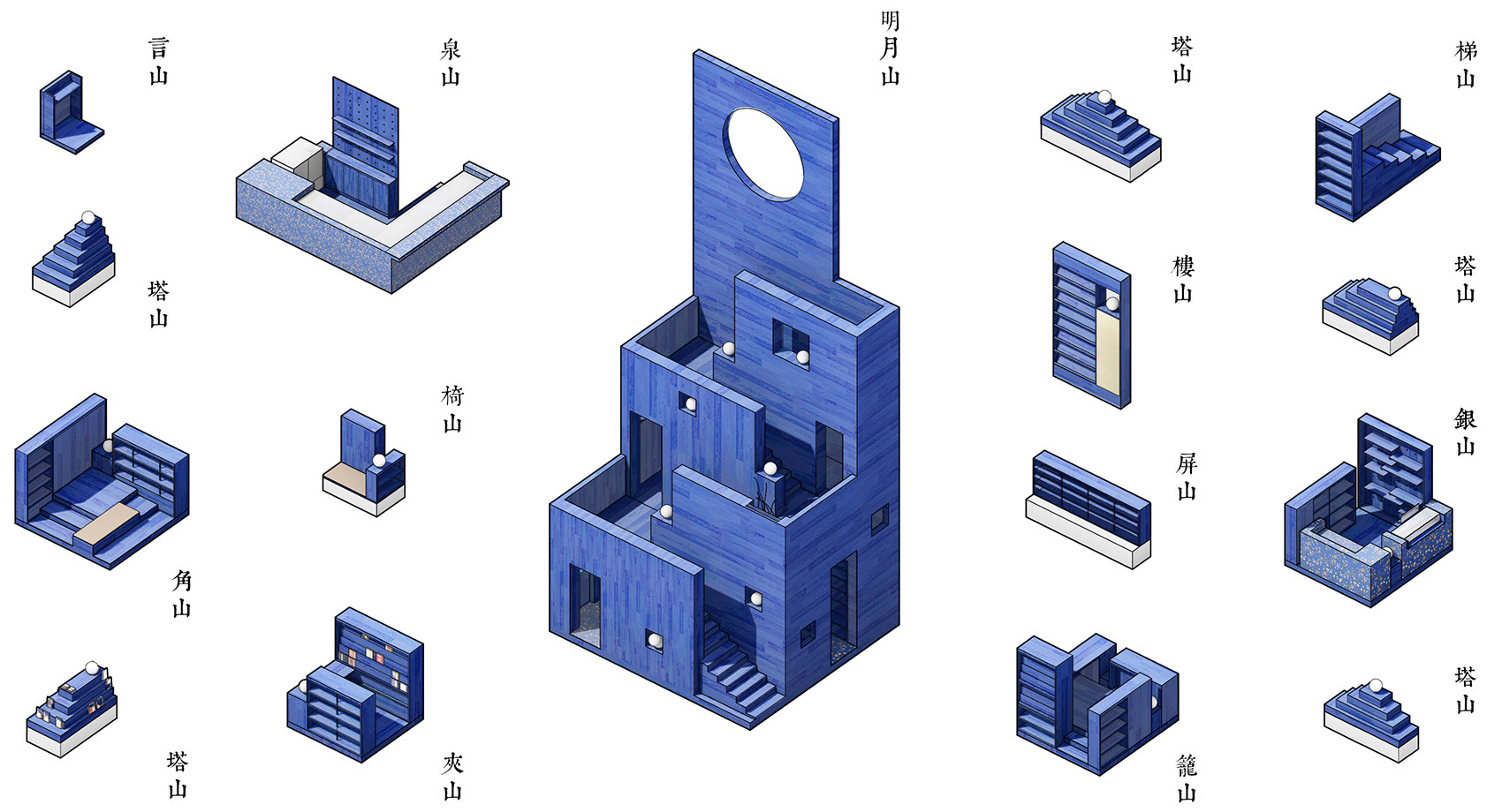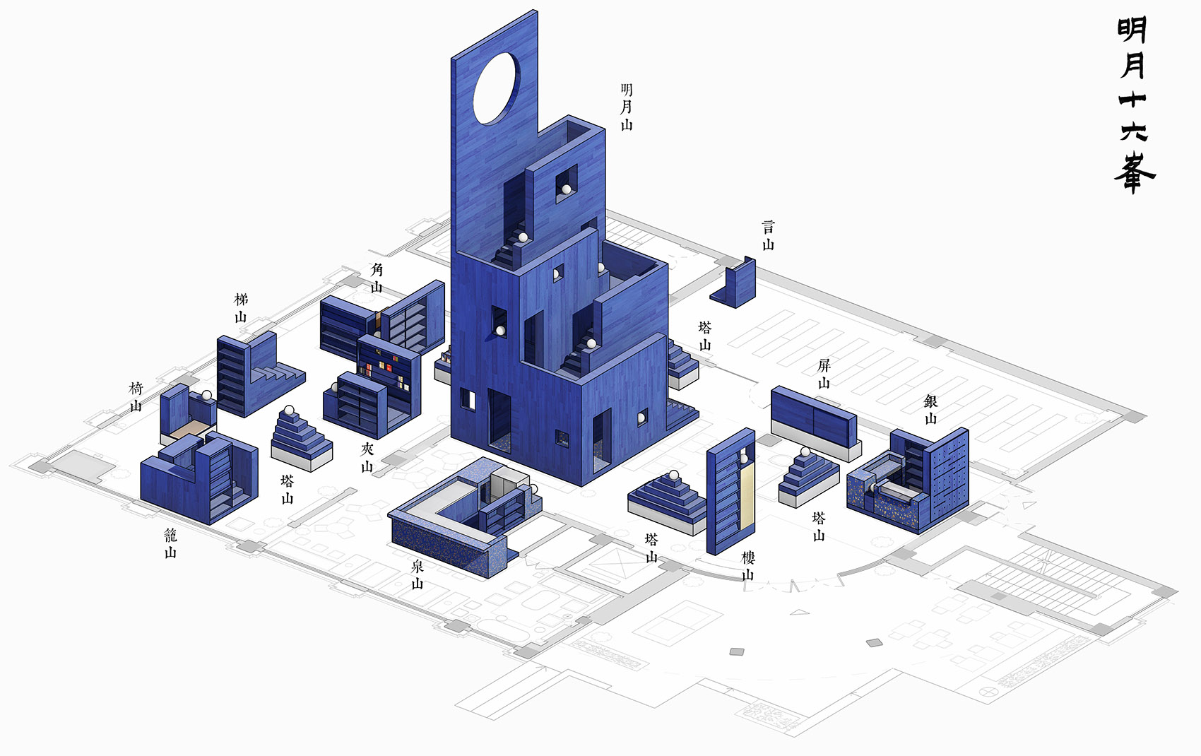 几乎占满整面墙的明月山多少取得计成“伟石迎人,别有一壶天地”的园意:访客被外立面的三层分隔欺骗,不会想到室内有这样一座“巨构”,等迎面撞上时则是满目皆山、不能尽收全貌。与供奉巨像的阁塔空间类似,人们在三个楼层只能分别直视这座主峰的山脚、山腰和山顶。
